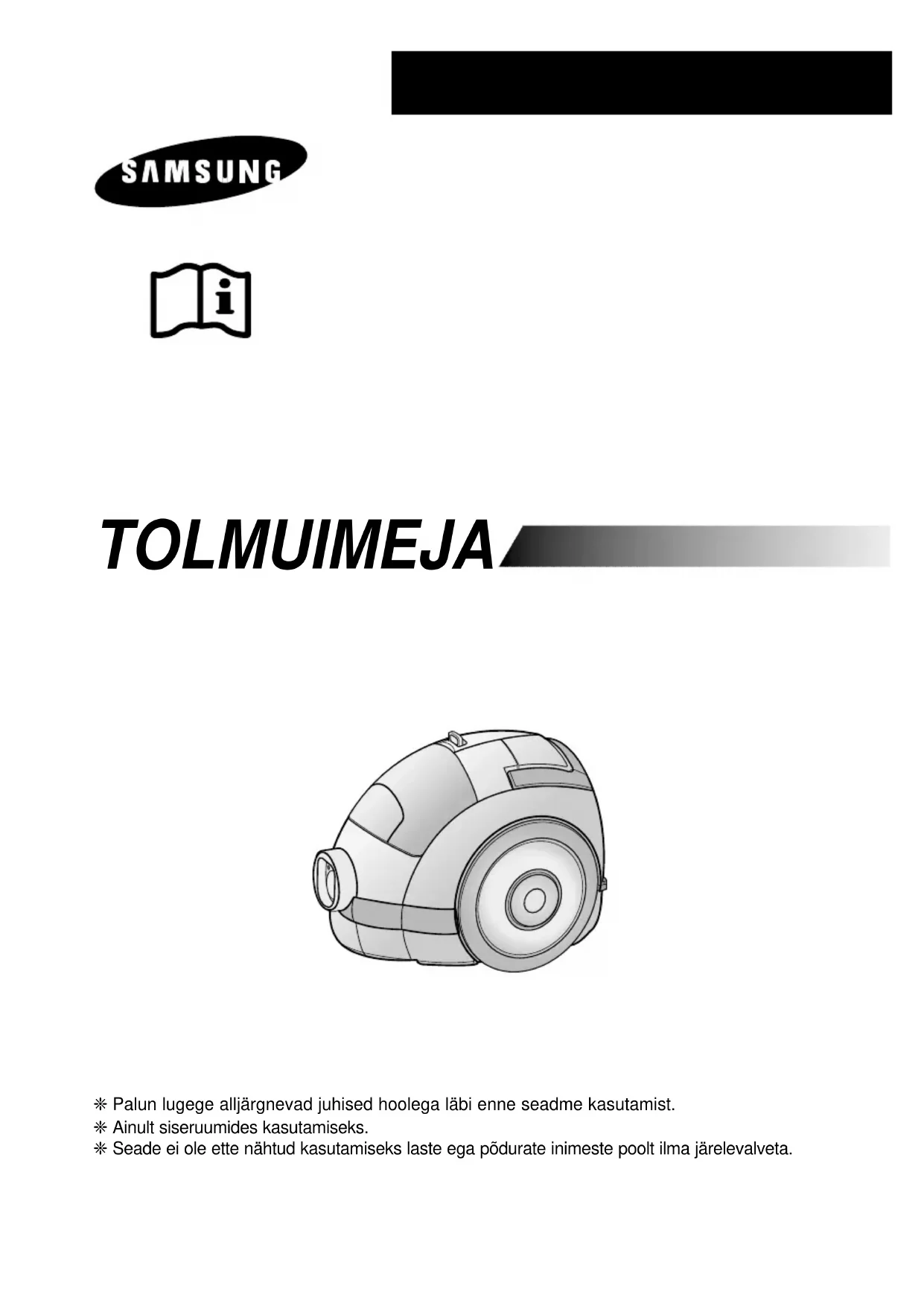EN-7 This Vacuum cleaner is approved the following. EMC Directive : 89/336/EEC , 92/31/EEC and 93/68/EEC Low Voltage Safety Directive : 73/23/EEC and 93/68/EEC DJ68-00219C(EN+RU+ET)-0.3 1/13/04 10:43 AM Page 16TOLMUIMEJA ❈ Palun lugege alljärgnevad juhised hoolega läbi enne seadme kasutamist. ❈ Ainult siseruumides kasutamiseks. ❈ Seade ei ole ette nähtud kasutamiseks laste ega põdurate inimeste poolt ilma järelevalveta. DJ68-00219C(EN+RU+ET)-0.3 1/13/04 10:43 AM Page 17OLULISED OHUTUSABINÕUD 1.Lugege kõik juhised hoolikalt läbi.Enne seadme sisselülitamist kontrollige, et võrgupinge vastab tolmuimeja põhjaplaadil näidatud pingele. 2.HOIATUS : Ärge kasutage tolmuimejat märja vaiba või põranda puhastamiseks. Ärge tõmmake tolmuimejasse vett. 3.Kui seadet kasutavad lapsed või te kasutate seda laste juuresolekul,hoidke jälgige neid hoolikalt. Ärge lubage tolmuimeja kasutamist mänguasjana. Ärge kunagi jätke tolmuimejat tööle, kui te ise sellest eemaldute. Kasutage tolmuimejat ainult ettenähtud otstarbel vas- tavalt käesolevale kasutusjuhisele. 4.Ärge kasutage tolmuimejat ilma kassettfiltrita. Tühjendage kassettfilter enne, kui see täiesti täis saab-niimoodi saate parema puhastustulemuse. 5.Ärge tõmmake tolmuimejasse tikke, hõõguvat tuhka ega sigaretikonisid. Ärge hoidke tol- muimejat ahju või muu küttekeha lähedal. Seadme plastikdetailid võivad kuumuse tõttu deformeeruda või värvi muuta. 6.Püüdke teravaid,kõvast materjalist esemeid tolmuimejasse mitte tõmmata-tolmuimeja detailid võivad viga saada. Ärge astuge vooliku peale. Ärge asetage raskust vooliku peale. Ärge blokeerige seadme sissetõmbe-ega väljapuhkeavasid. 7.Lülitage tolmuimeja nupust välja enne pistiku eemaldamist pistikupesast. Eemaldage pistik pistikupesast enne,kui asute tegelema kassettfiltri või filtritega. 8.Enne seadme puhastamist või hooldust tuleb pistik pistikupesast eemaldada. 9.Pikendusjuhtme kasutamine pole soovitav. 10.Kui teie tolmuimeja ei tööta korralikult, lülitage vool välja ja võtke ühendust volitatud teenindustöökojaga. 11.Kui toitejuhe on vigastatud, tuleb see ohu vältimiseks lasta välja vahetada tootjal või tootja poolt volitatud teenindusspetsialistil või muul vastava kvalifikatsiooniga töötajal. 12.Tolmuimejal on varustatud termokaitsmega, mis ülekuumenemise korral lülitab automaat- selt voolu välja. Ülekuumenemise põhjuseks võib olla filtri,otsiku, toru või vooliku ummis- tus. Kui ülekuumenemise põhjus on kõrvaldatud ja mootor jahtunud, lülitub tolmuimeja automaatselt jälle sisse. ET-1 DJ68-00219C(EN+RU+ET)-0.3 1/13/04 10:43 AM Page 181 TOLMUIMEJA KOKKUPANEK Erinevad mudelid võivad erineda.