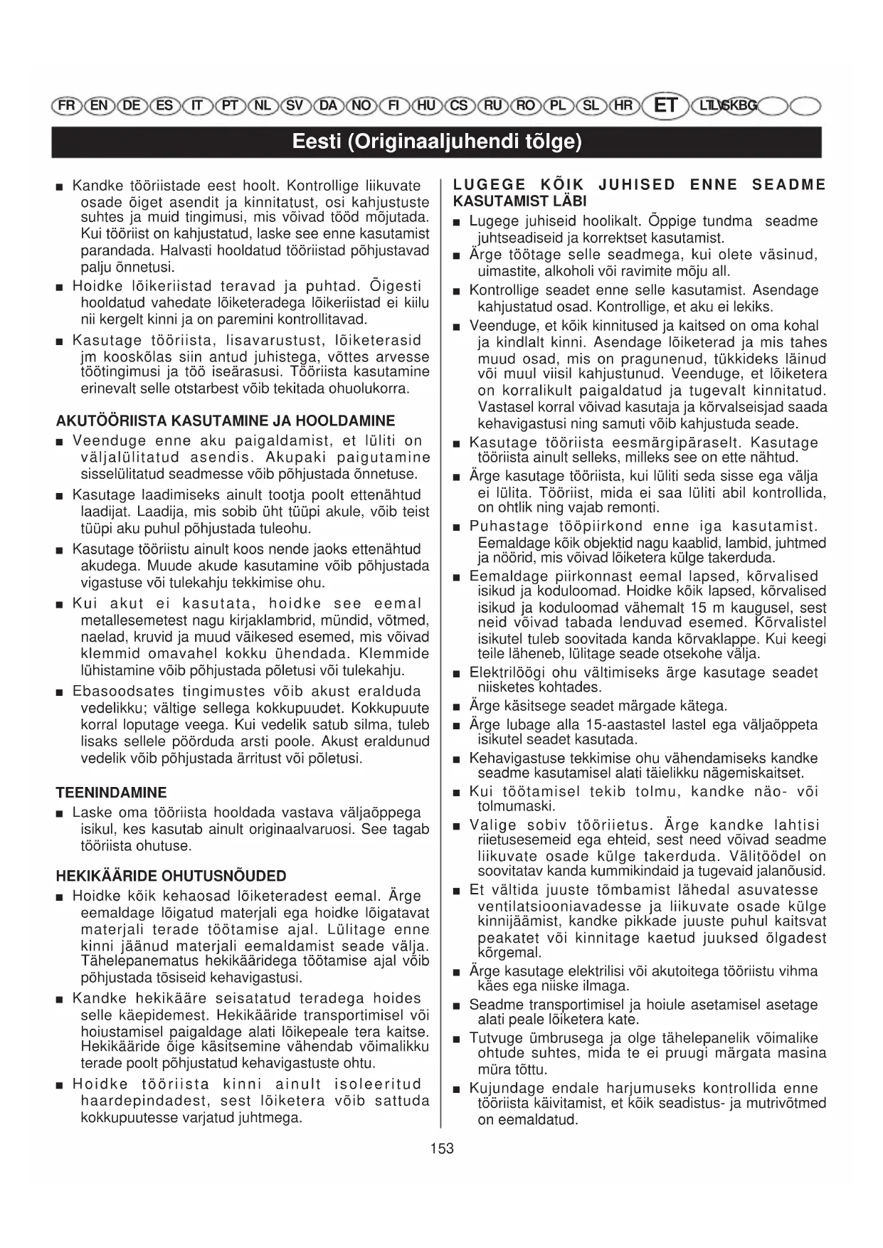 ■ Lugege juhiseid hoolikalt. Õppige tundma seadme juhtseadiseid ja korrektset kasutamist. ■ Ärge töötage selle seadmega, kui olete väsinud, uimastite, alkoholi või ravimite mõju all. ■ Kontrollige seadet enne selle kasutamist. Asendage kahjustatud osad. Kontrollige, et aku ei lekiks. ■ Veenduge, et kõik kinnitused ja kaitsed on oma kohal ja kindlalt kinni. Asendage lõiketerad ja mis tahes muud osad, mis on pragunenud, tükkideks läinud või muul viisil kahjustunud. Veenduge, et lõiketera on korralikult paigaldatud ja tugevalt kinnitatud. Vastasel korral võivad kasutaja ja kõrvalseisjad saada kehavigastusi ning samuti võib kahjustuda seade. ■ Kasutage tööriista eesmärgipäraselt. Kasutage tööriista ainult selleks, milleks see on ette nähtud. ■ Ärge kasutage tööriista, kui lüliti seda sisse ega välja ei lülita. Tööriist, mida ei saa lüliti abil kontrollida, on ohtlik ning vajab remonti. ■ Puhastage tööpiirkond enne iga kasutamist. Eemaldage kõik objektid nagu kaablid, lambid, juhtmed ja nöörid, mis võivad lõiketera külge takerduda. ■ Eemaldage piirkonnast eemal lapsed, kõrvalised isikud ja koduloomad. Hoidke kõik lapsed, kõrvalised isikud ja koduloomad vähemalt 15 m kaugusel, sest neid võivad tabada lenduvad esemed. Kõrvalistel isikutel tuleb soovitada kanda kõrvaklappe. Kui keegi teile läheneb, lülitage seade otsekohe välja. ■ Elektrilöögi ohu vältimiseks ärge kasutage seadet niisketes kohtades. ■ Ärge käsitsege seadet märgade kätega. ■ Ärge lubage alla 15-aastastel lastel ega väljaõppeta isikutel seadet kasutada. ■ Kehavigastuse tekkimise ohu vähendamiseks kandke seadme kasutamisel alati täielikku nägemiskaitset. ■ Kui töötamisel tekib tolmu, kandke näo- või tolmumaski. ■ Valige sobiv tööriietus. Ärge kandke lahtisi riietusesemeid ega ehteid, sest need võivad seadme liikuvate osade külge takerduda. Välitöödel on soovitatav kanda kummikindaid ja tugevaid jalanõusid. ■ Et vältida juuste tõmbamist lähedal asuvatesse ventilatsiooniavadesse ja liikuvate osade külge kinnijäämist, kandke pikkade juuste puhul kaitsvat peakatet või kinnitage kaetud juuksed õlgadest kõrgemal. ■ Ärge kasutage elektrilisi või akutoitega tööriistu vihma käes ega niiske ilmaga. ■ Seadme transportimisel ja hoiule asetamisel asetage alati peale lõiketera kate. ■ Tutvuge ümbrusega ja olge tähelepanelik võimalike ohtude suhtes, mida te ei pruugi märgata masina müra tõttu. ■ Kujundage endale harjumuseks kontrollida enne tööriista käivitamist, et kõik seadistus- ja mutrivõtmed on eemaldatud. 153Eesti (Originaaljuhendi tõlge) FR EN DE ES IT PT NL SV DA NO FI HU CS RU RO PL SL HR