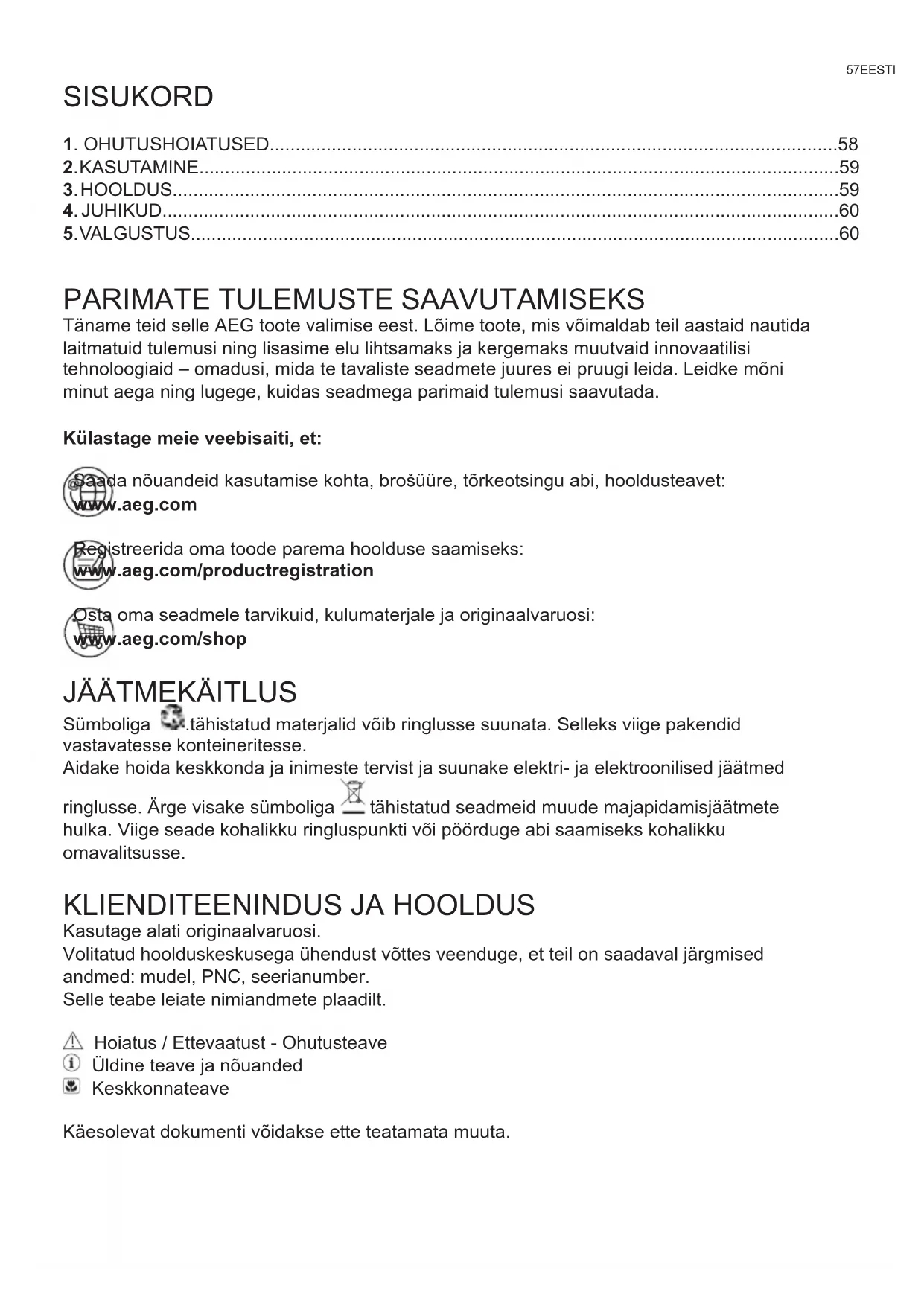 Kasutage alati originaalvaruosi. Volitatud hoolduskeskusega ühendust võttes veenduge, et teil on saadaval järgmised andmed: mudel, PNC, seerianumber. Selle teabe leiate nimiandmete plaadilt. Hoiatus / Ettevaatust - Ohutusteave Üldine teave ja nõuanded Keskkonnateave Käesolevat dokumenti võidakse ette teatamata muuta.58 www.aeg.com