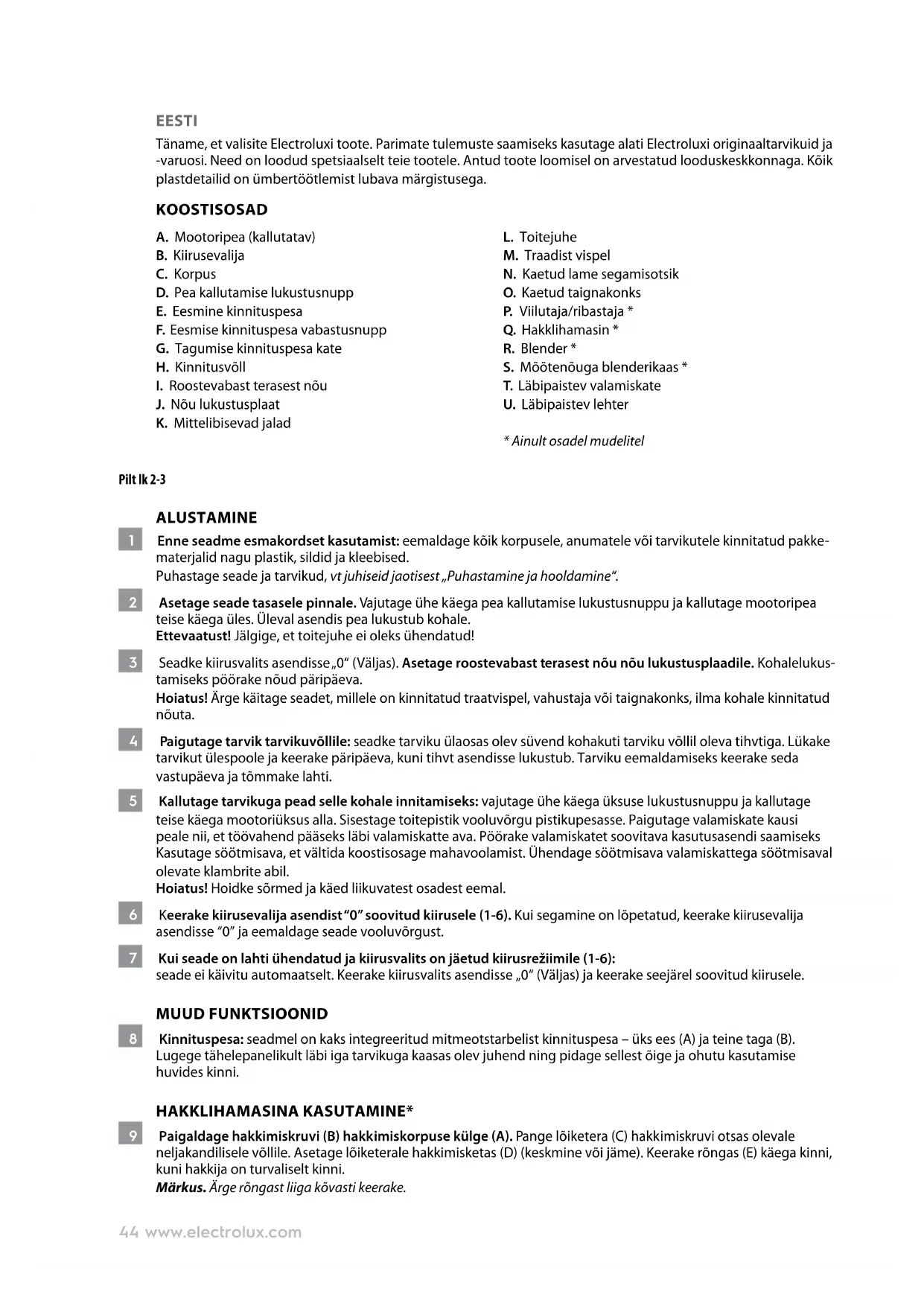 17 Eemaldage seade. Traadist visplit, hakklihamasinat* ja viilutajat/ribastajat* tuleks pesta ainult käsitsi sooja seebiveega. Kauss, lame segamisotsik ja taignakonks on nõudepesumasinakindlad. Nõudepesumasina kasutamisel pange pestavad esemed ainult ülemisele riiulile. Ettevaatust! Terad ja siseosad on väga teravad ja võivad põhjustada vigastusi. Hoiatus! Ärge pange korpust, pistikut ega toitejuhet vette ega mõnda teise vedelikku. Kuivatage iga osa enne kasutamist põhjalikult. 18 Blenderi puhastamine*: Keerake blenderit vastupäeva ja eemaldage kohalt. Tõstke kaas kohalt. Valage blenderist valmistatud segu välja. Lisage nõusse tilk nõudepesuvahendit ja üks liiter sooja vett. Kinnitage blender seadme külge. Laske seadmel töötada 6. kiirusel pool minutit ja valage seejärel vesi välja. Loputage blenderit ja laske kuivada. Ettevaatust! Terad ja siseosad on väga teravad ja võivad põhjustada vigastusi.. 19 Korpust võib puhastada ainult pehme niiske lapiga ja kuivatada seejärel kuiva lapiga. Märkus: ärge kasutage seadme pindade puhastamiseks abrasiivseid puhastusvahendeid või küürimiskäsnu. Tundke rõõmu oma uuest Electroluxi tootest!46 www.electrolux.com OHUTUSSOOVITUSED Enne seadme esmakordset kasutamist lugege järgmised juhised hoolikalt läbi.