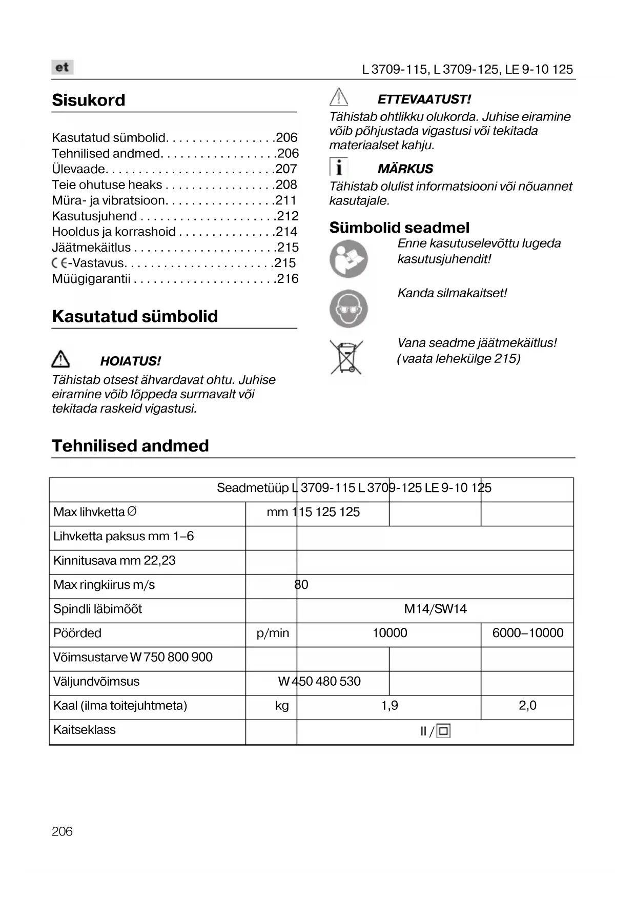- Müügigarantii Kasutatud sümbolid HOIATUS! Tähistab otsest ähvardavat ohtu. Juhise eiramine võib lõppeda surmavalt või tekitada raskeid vigastusi. ETTEVAATUST! Tähistab ohtlikku olukorda. Juhise eiramine võib põhjustada vigastusi või tekitada materiaalset kahju. MÄRKUS Tähistab olulist informatsiooni või nõuannet kasutajale. Sümbolid seadmel Enne kasutuselevõttu lugeda kasutusjuhendit! Kanda silmakaitset! Vana seadme jäätmekäitlus! (vaata lehekülge 215) Tehnilised andmed Seadmetüüp L 3709-115 L 3709-125 LE 9-10 125 Max lihvketta p. 216
