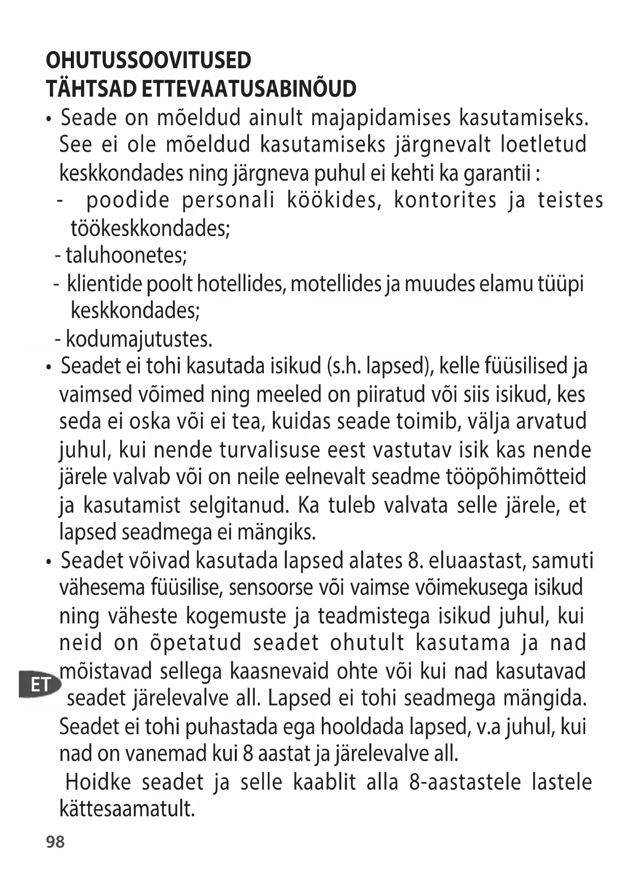 - Seadet võivad kasutada lapsed alates 8. eluaastast, samuti vähesema füüsilise, sensoorse või vaimse võimekusega isikud ning väheste kogemuste ja teadmistega isikud juhul, kui neid on õpetatud seadet ohutult kasutama ja nad mõistavad sellega kaasnevaid ohte või kui nad kasutavad seadet järelevalve all. Lapsed ei tohi seadmega mängida. Seadet ei tohi puhastada ega hooldada lapsed, v.a juhul, kui nad on vanemad kui 8 aastat ja järelevalve all. Hoidke seadet ja selle kaablit alla 8-aastastele lastele kättesaamatult. ET99 Mida tuleb teha