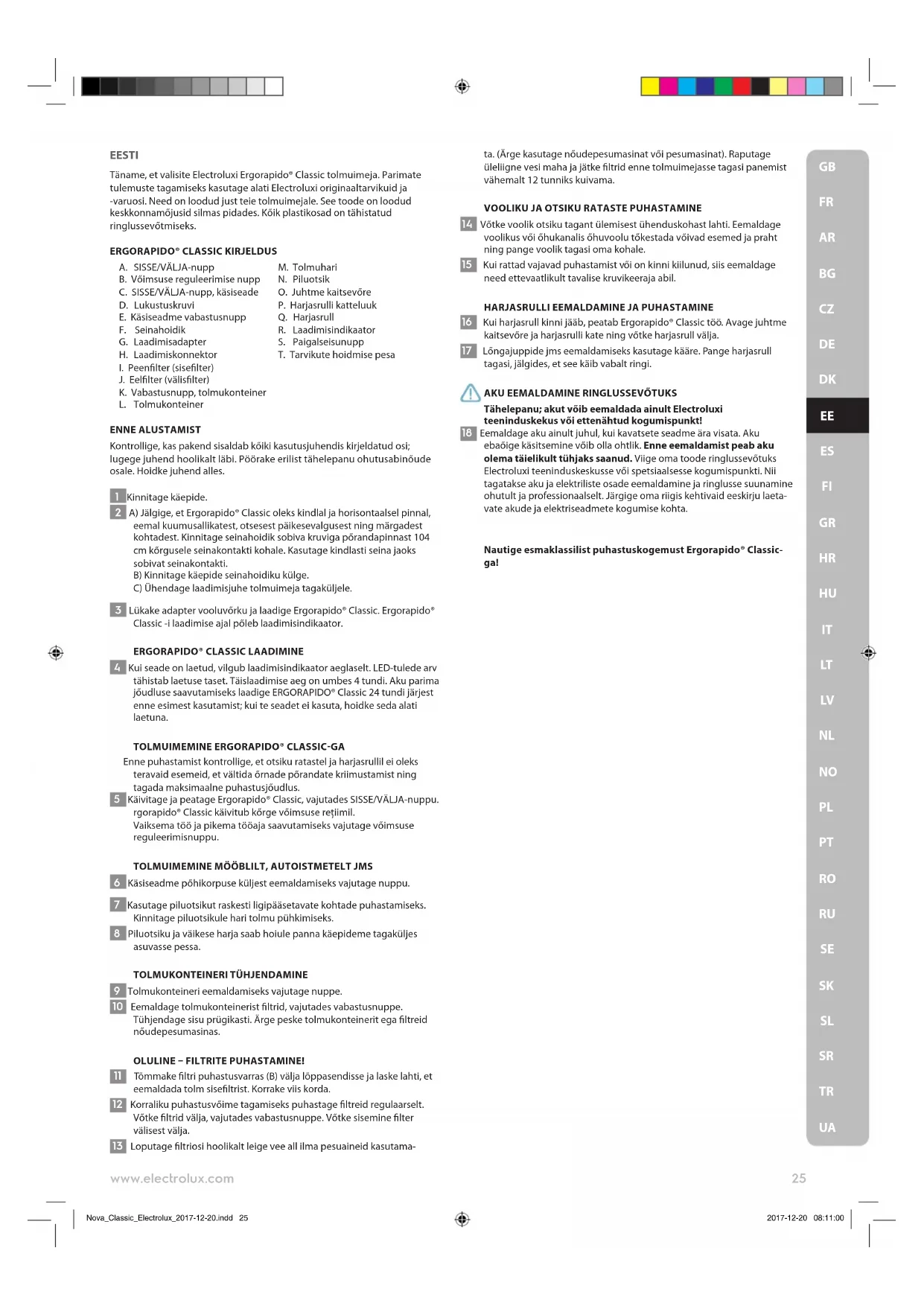 Nova_Classic_Electrolux_2017-12-20.indd 24 2017-12-20 08:11:00EESTI Täname, et valisite Electroluxi Ergorapido® Classic tolmuimeja. Parimate tulemuste tagamiseks kasutage alati Electroluxi originaaltarvikuid ja -varuosi. Need on loodud just teie tolmuimejale. See toode on loodud keskkonnamőjusid silmas pidades. Kőik plastikosad on tähistatud ringlussevőtmiseks.