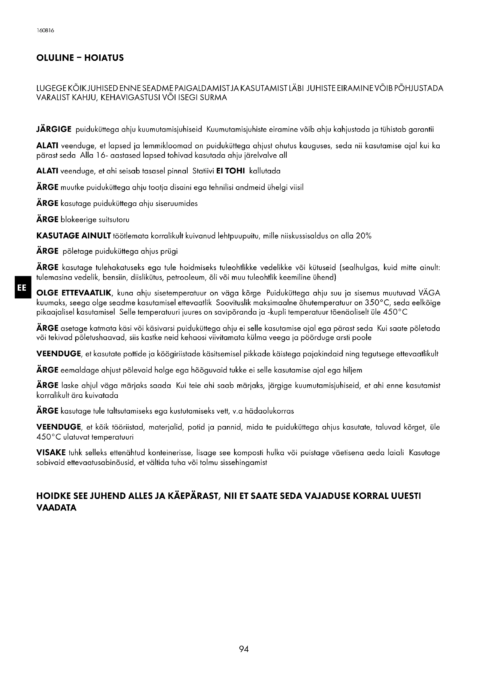 OLULINE – HOIATUS LUGEGE KÕIK JUHISED ENNE SEADME PAIGALDAMIST JA KASUTAMIST LÄBI JUHISTE EIRAMINE VÕIB PÕHJUSTADA VARALIST KAHJU, KEHAVIGASTUSI VÕI ISEGI SURMA JÄRGIGE puiduküttega ahju kuumutamisjuhiseid Kuumutamisjuhiste eiramine võib ahju kahjustada ja tühistab garantii ALATI veenduge, et lapsed ja lemmikloomad on puiduküttega ahjust ohutus kauguses, seda nii kasutamise ajal kui ka pärast seda Alla 16- aastased lapsed tohivad kasutada ahju järelvalve all ALATI veenduge, et ahi seisab tasasel pinnal Statiivi EI TOHI kallutada ÄRGE muutke puiduküttega ahju tootja disaini ega tehnilisi andmeid ühelgi viisil ÄRGE kasutage puiduküttega ahju siseruumides ÄRGE blokeerige suitsutoru KASUTAGE AINULT töötlemata korralikult kuivanud lehtpuupuitu, mille niiskussisaldus on alla 20% ÄRGE põletage puiduküttega ahjus prügi ÄRGE kasutage tulehakatuseks ega tule hoidmiseks tuleohtlikke vedelikke või kütuseid (sealhulgas, kuid mitte ainult: tulemasina vedelik, bensiin, diislikütus, petrooleum, õli või muu tuleohtlik keemiline ühend) OLGE ETTEVAATLIK, kuna ahju sisetemperatuur on väga kõrge Puiduküttega ahju suu ja sisemus muutuvad VÄGA kuumaks, seega olge seadme kasutamisel ettevaatlik Soovituslik maksimaalne õhutemperatuur on 350°C, seda eelkõige pikaajalisel kasutamisel Selle temperatuuri juures on savipõranda ja -kupli temperatuur tõenäoliselt üle 450°C ÄRGE asetage katmata käsi või käsivarsi puiduküttega ahju ei selle kasutamise ajal ega pärast seda Kui saate põletada või tekivad põletushaavad, siis kastke neid kehaosi viivitamata külma veega ja pöörduge arsti poole VEENDUGE, et kasutate pottide ja köögiriistade käsitsemisel pikkade käistega pajakindaid ning tegutsege ettevaatlikult ÄRGE eemaldage ahjust põlevaid halge ega hõõguvaid tukke ei selle kasutamise ajal ega hiljem ÄRGE laske ahjul väga märjaks saada Kui teie ahi saab märjaks, järgige kuumutamisjuhiseid, et ahi enne kasutamist korralikult ära kuivatada ÄRGE kasutage tule taltsutamiseks ega kustutamiseks vett, v.a hädaolukorras VEENDUGE, et kõik tööriistad, materjalid, potid ja pannid, mida te puiduküttega ahjus kasutate, taluvad kõrget, üle 450°C ulatuvat temperatuuri VISAKE tuhk selleks ettenähtud konteinerisse, lisage see komposti hulka või puistage väetisena aeda laiali Kasutage sobivaid ettevaatusabinõusid, et vältida tuha või tolmu sissehingamist HOIDKE SEE JUHEND ALLES JA KÄEPÄRAST, NII ET SAATE SEDA VAJADUSE KORRAL UUESTI VAADATA