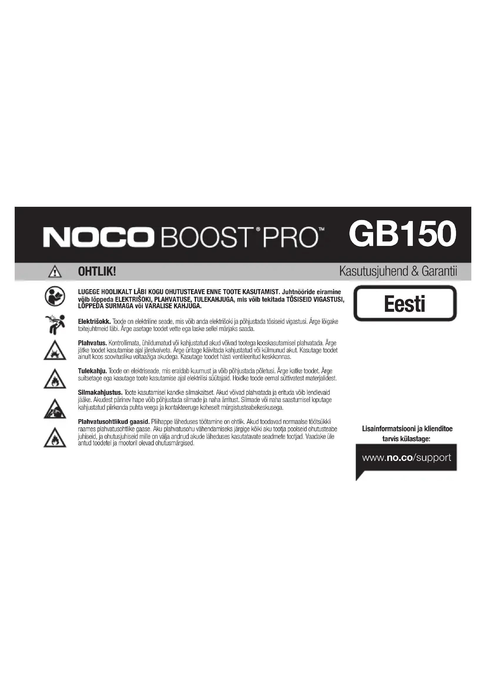 +44 20 4520 7738 +31 20 214 0047 +61 2 4062 0068 +81 3 6893 3017GB150 www.no.co/support Kasutusjuhend & Garantii OHTLIK! LUGEGE HOOLIKALT LÄBI KOGU OHUTUSTEAVE ENNE TOOTE KASUTAMIST. Juhtnööride eiramine võib lõppeda ELEKTRIŠOKI, PLAHVATUSE, TULEKAHJUGA, mis võib tekitada TÕSISEID VIGASTUSI, LÕPPEDA SURMAGA või VARALISE KAHJUGA. Elektrišokk. Toode on elektriline seade, mis võib anda elektrišoki ja põhjustada tõsiseid vigastusi. Ärge lõigake toitejuhtmeid läbi. Ärge asetage toodet vette ega laske sellel märjaks saada. Plahvatus. Kontrollimata, ühildumatud või kahjustatud akud võivad tootega kooskasutamisel plahvatada. Ärge jätke toodet kasutamise ajal järelvalveta. Ärge üritage käivitada kahjustatud või külmunud akut. Kasutage toodet ainult koos soovitusliku voltaažiga akudega. Kasutage toodet hästi ventileeritud keskkonnas. Tulekahju. Toode on elektriseade, mis eraldab kuumust ja võib põhjustada põletusi. Ärge katke toodet. Ärge suitsetage ega kasutage toote kasutamise ajal elektrilisi süütajaid. Hoidke toode eemal süttivatest materjalidest. Silmakahjustus. Toote kasutamisel kandke silmakaitset. Akud võivad plahvatada ja erituda võib lendlevaid jääke. Akudest pärinev hape võib põhjustada silmade ja naha ärritust. Silmade või naha saastumisel loputage kahjustatud piirkonda puhta veega ja kontakteeruge koheselt mürgistusteabekeskusega. Plahvatusohtlikud gaasid. Pliihappe läheduses töötamine on ohtlik. Akud toodavad normaalse töötsükkli raames plahvatusohtlike gaase. Aku plahvatusohu vähendamiseks järgige kõiki aku tootja poolseid ohutusteabe juhiseid, ja ohutusjuhiseid mille on välja andnud akude läheduses kasutatavate seadmete tootjad. Vaadake üle antud toodetel ja mootoril olevad ohutusmärgised.Lisainformatsiooni ja klienditoe tarvis külastage: EestiIsiklik ohutus. Kasutage antud toodet ainult vastavalt juhtnööridele. Keegi peaks toote kasutamise ajal olema teist hüüdmiskaugusel või teile piisavalt lähedal, et hädaolukorras appi tulla. Hoidke puhast vett ja seepi läheduses juhuks, kui peaks aset leidma aku happega saastumine. Kandke aku lähedal töötades täielikku silmakaitset ja kaitseriietust. Peske alati käed peale akude ja seotud materjalidega töötamist. Ärge kasutage ega kandke endaga metallist objekte kui akudega töötate - muuhulgas tööriistu, käekellasid ja ehteid. Kui metall kukub akule, võib see süttida või tekitada lühise mille tulemuseks on elektrišokk, tulekahju või plahvatus, mis võib tekitada vigastusi, põhjustada surma või varalist kahju. Alaealised. Kui ostja kavatseb toodet alaealise kasutusse anda, nõustub ostjaks olev täiskasvanu andma detailseid juhtnööre ja hoiatusi mistahes alaealisele enne, kui ta toodet kasutama asub. Selle tegemata jätmise korral on kogu vastutus ostja kanda, kes siinkohal nõustub NOCO vastutusest vabastama mistahes toote eesmärgipäratu või vale kasutuse korral alaealise poolt. Lämbumisoht. Tootelisad võivad seada lapsed läbumisohtu. Ärge jätke lapsi tootega või mistahes varuosadega järelvalveta. See toode ei ole mänguasi. Käsitlemine. Käsitlege toodet hoolsasti. Füüsiline kokkupõrge teiste esemetega võib toodet kahjustada. Ärge kasutage kahjustatud toodet, muuhulgas korpuse mõrade või kahjustunud juhtmetega toodet. Ärge kasutage kahjustunud toitejuhtmega toodet. Niiskus ja vedelikud võivad toodet kahjustada. Ärge käsitlege toodet ega selle elektrilisi komponente ühegi vedeliku lähedal. Hoiustage ja kasutage toodet kuivas kohas. Ärge kasutage toodet kui see on saanud märjaks. Kui toode juba töötab ning saab märjaks, ühendage see aku küljest lahti ja lõpetage koheselt selle kasutamine. Ärge ühendage toodet lahti kaablitest tõmbamise teel. Modifikatsioonid. Ärge üritage muuta, modifitseerida või parandada ühtegi toote osa iseseisvalt. Toote lahti võtmine võib põhjustada vigastusi, lõppeda surmaga või varalise kahjuga. Kui toode saab kahjustada, sellel esinevad talitlushäired või see sattub kontakti mistahes vedelikuga, lõpetage selle kasutamine ja kontakteeruge NOCO-ga. Mistahes modifikatsioonid tootele muudavad garantii kehtetuks. Lisavarustus. See toode on heaks kiidetud kasutamiseks NOCO lisavarustusega. NOCO ei ole vastutav kasutaja turvalisuse või kahju eest, kui kasutusel on olnud lisavarustus mida NOCO heaks ei kiida. Asukoht. Vältige aku happe ja toote kontakti sattumist. Ärge kasutage toodet suletud ruumis või piiratud ventilatsiooniga alal. Ärge asetage akut toote peale. Positsiooni kaabel aitab vältida õnnetusjuhtumeid seoses liikuvate sõiduki osagega (muuhulgas ka kapottide ja uste liigutamisel), liikuvate mootori osadega (muuhulgas labade, rihmade ja rihmarataste) või mistahes muude osadega, mis võiksid osutuda potentsiaalselt vigastuste või surma põhjustajaks. Töötemperatuur. See toode on disainitud töötama temperatuurivahemikus -20ºC kuni 50ºC. Ärge kasutage toodet väljaspool temperatuurivahemikke. Ärge käivitage külmunud akut. Lõpetage koheselt toote kasutamine, kui aku muutub liigselt kuumaks. Hoiustamine. Ärge kasutage ega hoiustage toodet alal kus on kõrge kontsentratsioon tolmu või õhuosakesi. Hoiustage toodet lamedal, turvalisel pinnasel, kus ei esine toote kukkumisohtu. Hoiustage oma toodet kuivas asukohas. Hoiustustemperatuur on -20ºC - 50ºC (0ºC kuni +40ºC keskmine temperatuur). Ärge mingil juhul ületage Olulised turvaohutusnõuded ETTEVAATUST: Käsijuhtimise režiim blokeerib kõik turvameetmed. Ebaõige kasutamise korral ja/või meie soovitatule vastupidisel kasutamisel võib see põhjustada vigastusi või surma või tühistada teie garantii. Tule-, plahvatus- ja põletusoht. Ärge demonteerige, purustage ega kuumutage üle 60 ºC (140 ºF) ega tuhastage. See seade on ette nähtud ajutiseks kasutamiseks välitingimustes ja selle kasutamisel niisketes oludes tuleks olla ettevaatlik. HOIATUS: Ärge laadige sisemist akut üle. Vt kasutusjuhendit.