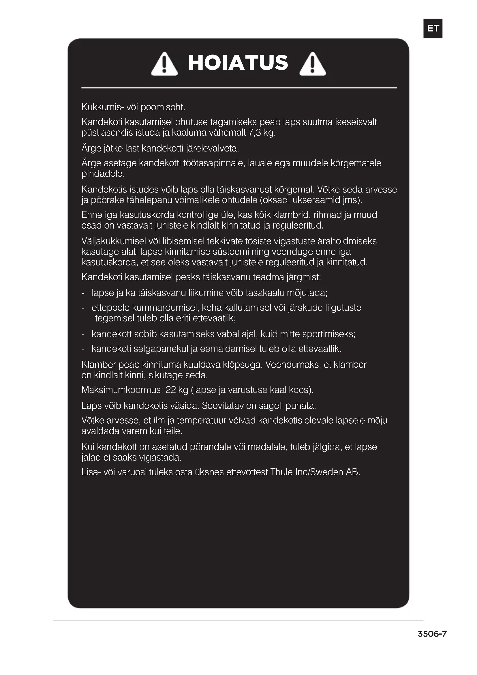 HOIATUS Kukkumis- või poomisoht. Kandekoti kasutamisel ohutuse tagamiseks peab laps suutma iseseisvalt püstiasendis istuda ja kaaluma vähemalt 7,3 kg. Ärge jätke last kandekotti järelevalveta. Ärge asetage kandekotti töötasapinnale, lauale ega muudele kõrgematele pindadele. Kandekotis istudes võib laps olla täiskasvanust kõrgemal. Võtke seda arvesse ja pöörake tähelepanu võimalikele ohtudele (oksad, ukseraamid jms). Enne iga kasutuskorda kontrollige üle, kas kõik klambrid, rihmad ja muud osad on vastavalt juhistele kindlalt kinnitatud ja reguleeritud. Väljakukkumisel või libisemisel tekkivate tõsiste vigastuste ärahoidmiseks kasutage alati lapse kinnitamise süsteemi ning veenduge enne iga kasutuskorda, et see oleks vastavalt juhistele reguleeritud ja kinnitatud. Kandekoti kasutamisel peaks täiskasvanu teadma järgmist: - lapse ja ka täiskasvanu liikumine võib tasakaalu mõjutada; - ettepoole kummardumisel, keha kallutamisel või järskude liigutuste tegemisel tuleb olla eriti ettevaatlik; - kandekott sobib kasutamiseks vabal ajal, kuid mitte sportimiseks; - kandekoti selgapanekul ja eemaldamisel tuleb olla ettevaatlik. Klamber peab kinnituma kuuldava klõpsuga. Veendumaks, et klamber onkindlalt kinni, sikutage seda. Maksimumkoormus: 22 kg (lapse ja varustuse kaal koos). Laps võib kandekotis väsida. Soovitatav on sageli puhata. Võtke arvesse, et ilm ja temperatuur võivad kandekotis olevale lapsele mõju avaldada varem kui teile. Kui kandekott on asetatud põrandale või madalale, tuleb jälgida, et lapse jalad ei saaks vigastada. Lisa- või varuosi tuleks osta üksnes ettevõttest Thule Inc/Sweden AB.ET 4 506-7095 ALUSTAMINE
