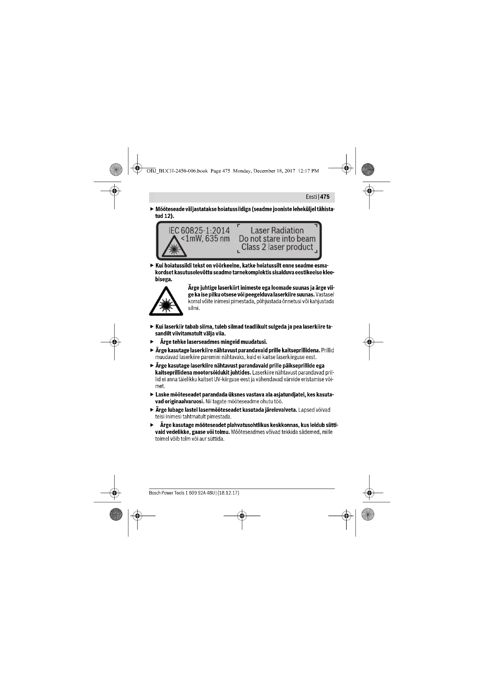 - Tarnekomplekt ei sisalda kõiki kasutusjuhendis olevatel joonistel kujutatud või kasutusju- hendis nimetatud lisatarvikuid. Näidikuelemendid (valik) a Olek Bluetooth® b Mõõtmise lähtetasand c Patareinäit d Mõõteväärtuste read e Tulemuse rida f Mõõterežiimid g Kaldenurga näit h Oleku riba i Põhiseadistused Montaaž Patareide paigaldamine/vahetamine Mõõteseadmes on soovitav kasutada leelis-mangaan-patareisid või akusid. 1,2-V-patareide puhul ei pruugi mõõtmiste arv olla sama suur nagu 1,5-V-patareide puhul. Patareikorpuse kaane 9 avamiseks vajutage lukustusele 10 ja tõmmake patareikorpu- se kaas lahti. Asetage patareid või akud kohale. Jälgige seejuures patareide õiget po- laarsust vastavalt patareikorpuse siseküljel toodud sümbolitele. Kui tühi patareisümbol ilmub ekraanile esimest korda, saab teha veel ca 100 mõõt- mist. Kui patareisümbol on tühi ja vilgub punase tulega, ei saa mõõtmisi enam teha. Vahetage patareid või akud välja. Vahetage alati välja kõik patareid või akud ühekorraga. Kasutage üksnes ühe tootja ja ühesuguse mahtuvusega patareisid või akusid. Kui Te mõõteseadet pikemat aega ei kasuta, võtke patareid või akud sead- mest välja. Patareid ja akud võivad pikemal seismisel korrodeeruda või iseenesli- kult tühjeneda. Bluetooth® aktiveeritud, ühendust ei ole loodud Bluetooth® aktiveeritud, ühendus loodud OBJ_BUCH-2450-006.book Page 479 Monday, December 18, 2017 12:17 PM480 | Eesti 1 609 92A 48U | (18.12.17) Bosch Power Tools Kasutamine Kasutuselevõtt Ärge jätke sisselülitatud seadet järelevalveta ja lülitage seade pärast kasuta- mist välja. Laserkiir võib teisi inimesi pimestada. Kaitske mõõteseadet niiskuse ja otsese päikesekiirguse eest. Ärge hoidke mõõteseadet väga kõrgetel ja väga madalatel temperatuuridel, samuti vältige temperatuurikõikumisi. Ärge jätke seadet näiteks pikemaks ajaks autosse. Suuremate temperatuurikõikumiste korral laske mõõteseadmel enne kasutuselevõttu keskkonna temperatuuriga kohaneda. Äärmuslikel temperatuuri- del ja temperatuurikõikumiste korral võib seadme mõõtetäpsus väheneda. Kaitske mõõteseadet tugevate löökide ja kukkumiste eest. Kui mõõteseadme- le on avaldunud tugev väline mehaaniline toime, tuleb enne töö jätkamist alati kon- trollida seadme täpsust (vt „Kauguse mõõtmise täpsuse kontrollimine“, lk 489). Sisse-/väljalülitus –Mõõteseadme sisselülitamiseks vajutage korraks mõõtenupule 2 []. –Mõõteseadme sisselülitamiseks ilma laseri lülitamiseta vajutage korraks sisselü- litusnupule 5 []. Ärge suunake laserkiirt inimeste ega loomade peale ning ärge vaadake laser- kiire poole ka mitte suurema vahemaa tagant. Mõõteseadme väljalülitamiseks hoidke sisselülitusnuppu 5 [] all. Mõõteseadme väljalülitamisel jäävad mälusse salvestatud väärtused ja seadistused alles. Mõõtmine Pärast sisselülitamist on mõõteseade pikkuse mõõtmise režiimil. Mõne muu mõõte- funktsiooni valimiseks vajutage nupule 7 [Func]. Valige soovitud mõõtefunktsioon välja nupuga 3 [+] või nupuga 8 [–] (vt „Mõõterežiimid“, lk 481). Aktiveerige mõõte- funktsioon nupuga 7 [Func] või mõõtenupuga 2 []. Mõõtmise lähtetasandiks on pärast sisselülitamist valitud mõõteseadme tagaserv. Lähtetasandi vahetamiseks vt „Lähtetasandi valik“, lk 481. Asetage mõõteseade mõõtmise soovitud alguspunkti (nt vastu seina). Märkus: Kui mõõteseade lülitatakse sisse sisselülitusnupust 5 [], vajutage kor- raks mõõtenupule 2 [ ], et lülitada sisse laser. Mõõtmise käivitamiseks vajutage korraks mõõtenupule 2 [ ]. Seejärel lülitatakse laserkiir välja. Uueks mõõtmiseks korrake toimingut. OBJ_BUCH-2450-006.book Page 480 Monday, December 18, 2017 12:17 PMEesti | 481 Bosch Power Tools 1 609 92A 48U | (18.12.17) Ärge suunake laserkiirt inimeste ega loomade peale ning ärge vaadake laser- kiire poole ka mitte suurema vahemaa tagant. Märkus: Mõõtetulemust kuvatakse tavaliselt 0,5 sek jooksul ja hiljemalt 4 sek pärast. Mõõteulatus sõltub vahemaast, valgusoludest ja sihtpinna peegeldusomadustest. Pä- rast mõõtmise lõpetamist lülitub laserkiir automaatselt välja. Lähtetasandi valik (vt joonist A) Mõõtmise teostamiseks võite valida ühe kolmest erinevast lähtetasandist: – mõõteseadme tagaserv (nt vastu seina asetamisel), – mõõteseadme esiserv (nt mõõtmisel alates lauaservast), – keerme 13 keskmest (nt statiiviga tehtavate mõõtmiste puhul). Lähtetasandi väljavalimiseks vajutage nupule 4. Nupuga 3 [+] või nupuga 8 [–] või nupuga 4 valige välja soovitud lähtetasand. Pärast mõõteseadme igakordset sisselü- litamist on lähtetasandiks mõõteseadme tagaserv. Menüü „Põhiseadistused“ Selleks et jõuda menüüsse „Põhiseadistused“ (i), hoidke nuppu 7 [Func] all. Valige välja vastav põhiseadistus ja oma seadistus. Selleks et menüüst „Põhiseadistused“ lahkuda, vajutage nupule (sisse/välja) 5 []. Ekraani valgustus Ekraanivalgustus on pidevalt sisse lülitatud. Kui ühelegi nupule ei vajutata, väheneb ca 20 sekundi pärast ekraanivalgustuse valgustugevus, et säästa patareisid/akusid. Mõõterežiimid Pikkuse mõõtmine Valige välja pikkuse mõõtmine . Laserkiire sisselülitamiseks vajutage korraks mõõtenupule 2 []. Vajutage mõõtmiseks korraks mõõtenupule 2 [ ]. Mõõtetulemust näidatakse ek- raani allosas. Igal järgneval mõõtmisel korrake ülal nimetatud samme. Viimane mõõ- tetulemus on ekraanil kõige all, eelviimane selle kohal jne.