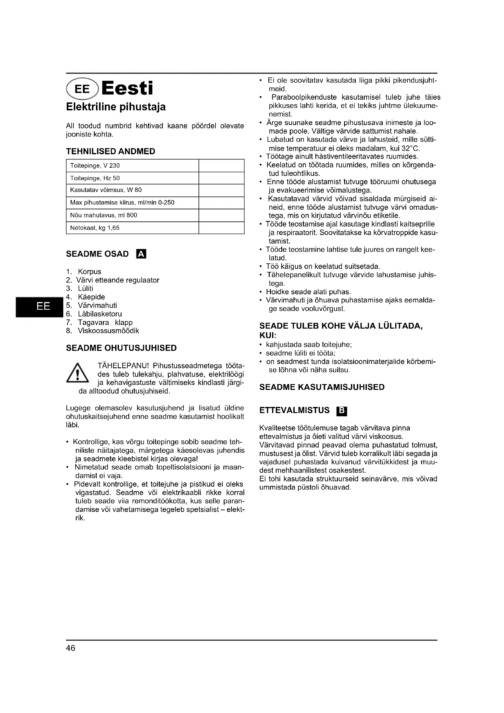 1. Korpus2. Värvi etteande regulaator3. Lüliti4. Käepide5. Värvimahuti6. Läbilasketoru7. Tagavara klapp8. Viskoossusmõõdik SEADME OHUTUSJUHISED TÄHELEPANU! Pihustusseadmetega tööta-des tuleb tulekahju, plahvatuse, elektrilöögi ja kehavigastuste vältimiseks kindlasti järgi-da alltoodud ohutusjuhiseid.Lugege olemasolev kasutusjuhend ja lisatud üldine ohutuskaitsejuhend enne seadme kasutamist hoolikalt läbi.• Kontrollige, kas võrgu toitepinge sobib seadme teh-niliste näitajatega, märgetega käesolevas juhendis ja seadmete kleebistel kirjas olevaga!• Nimetatud seade omab topeltisolatsiooni ja maan-damist ei vaja.• Pidevalt kontrollige, et toitejuhe ja pistikud ei oleks vigastatud. Seadme või elektrikaabli rikke korral tuleb seade viia remonditöökotta, kus selle paran-damise või vahetamisega tegeleb spetsialist – elekt- rik.