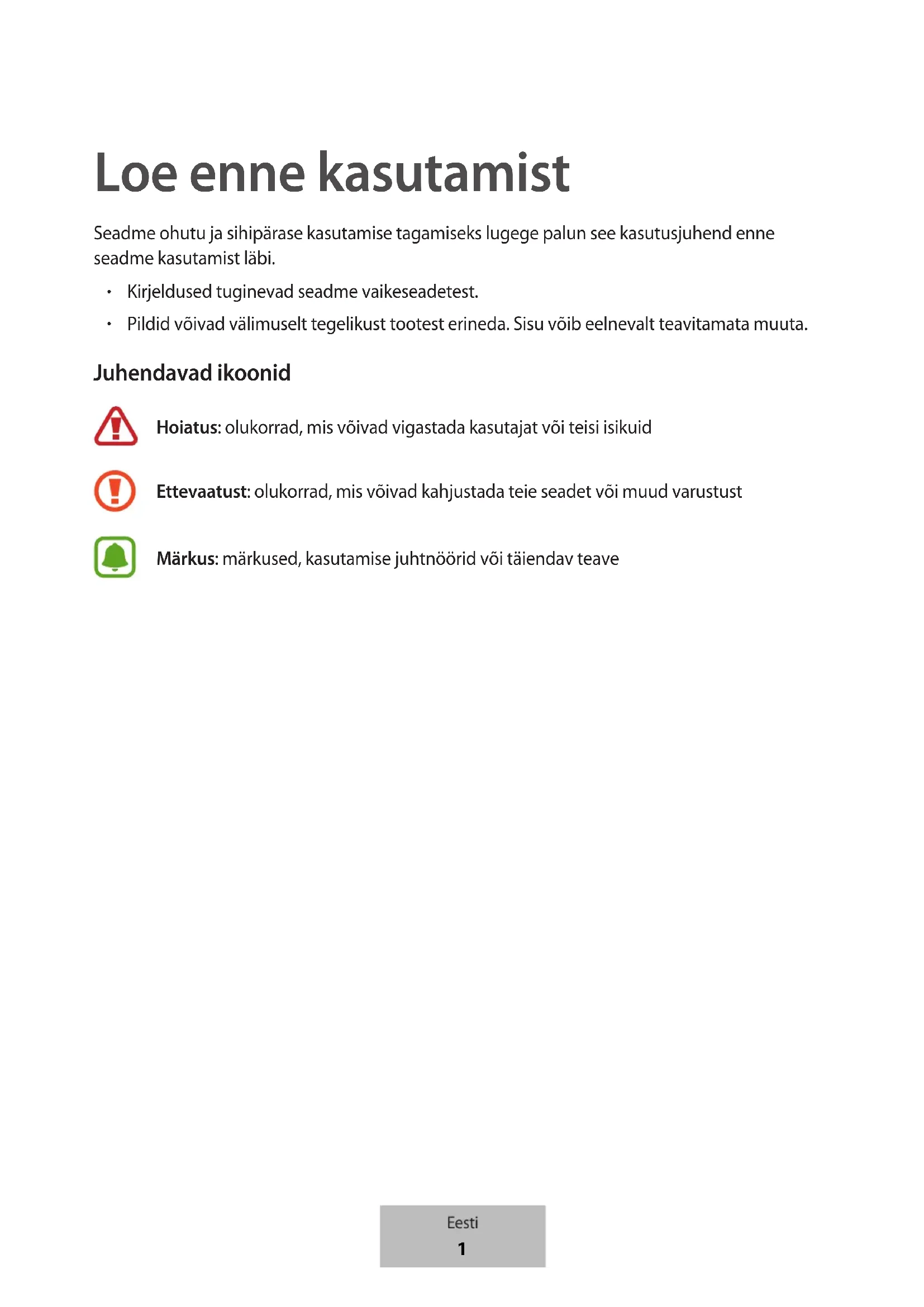 Pildid võivad välimuselt tegelikust tootest erineda. Sisu võib eelnevalt teavitamata muuta. Juhendavad ikoonid Hoiatus: olukorrad, mis võivad vigastada kasutajat või teisi isikuid Ettevaatust: olukorrad, mis võivad kahjustada teie seadet või muud varustust Märkus: märkused, kasutamise juhtnöörid või täiendav teave Eesti