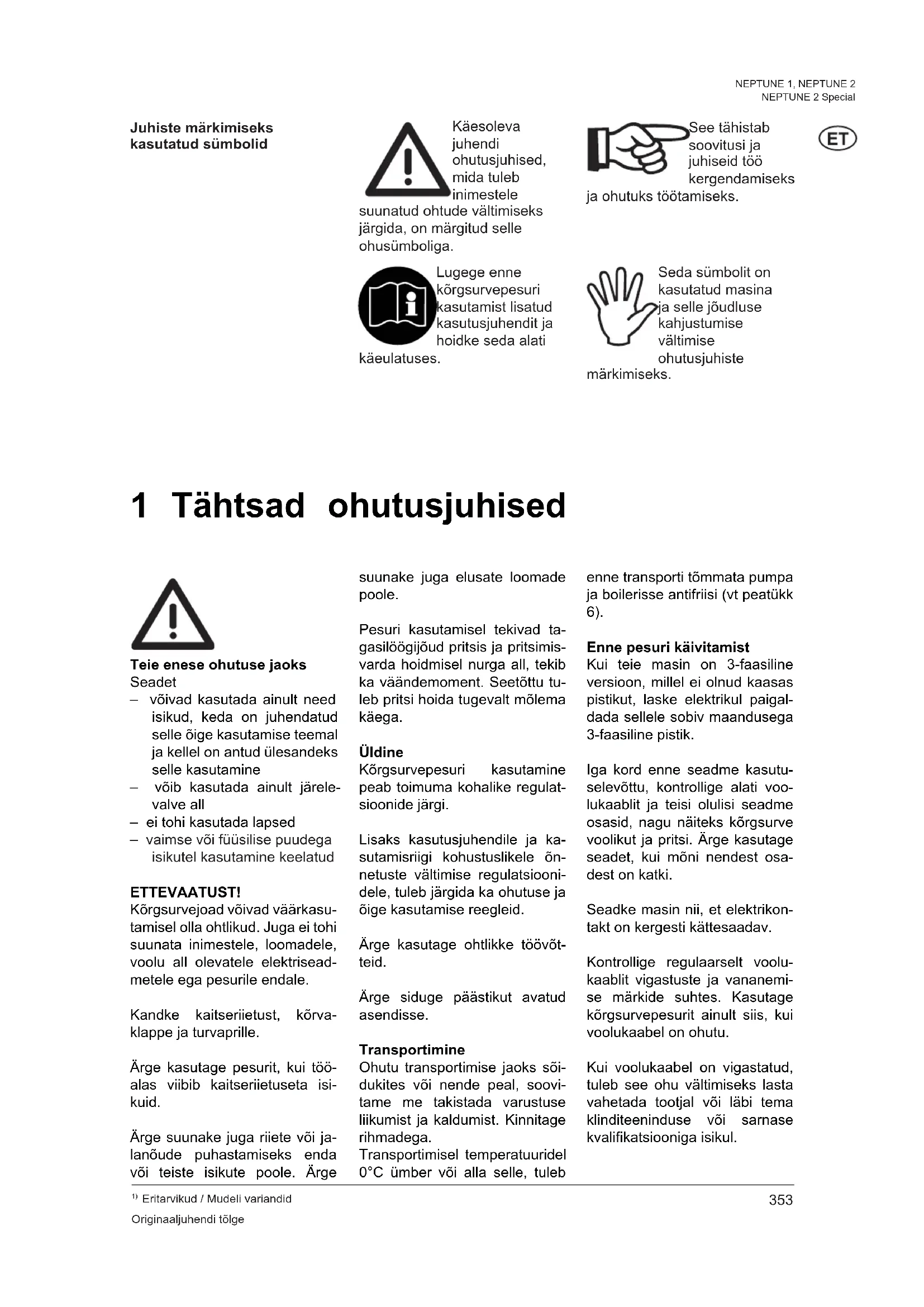 Eritarvikud / Mudeli variandid Originaaljuhendi tõlge NEPTUNE 1, NEPTUNE 2 NEPTUNE 2 Special 1 Tähtsad ohutusjuhised Juhiste märkimiseks kasutatud sümbolid Lugege enne kõrgsurvepesuri kasutamist lisatud kasutusjuhendit ja hoidke seda alati käeulatuses. Teie enese ohutuse jaoks Seadet – võivad kasutada ainult need isikud, keda on juhendatud selle õige kasutamise teemal ja kellel on antud ülesandeks selle kasutamine – võib kasutada ainult järele- valve all – ei tohi kasutada lapsed – vaimse või füüsilise puudega isikutel kasutamine keelatud ETTEVAATUST! Kõrgsurvejoad võivad väärkasu- tamisel olla ohtlikud. Juga ei tohi suunata inimestele, loomadele, voolu all olevatele elektrisead- metele ega pesurile endale. Kandke kaitseriietust, kõrva- klappe ja turvaprille. Ärge kasutage pesurit, kui töö- alas viibib kaitseriietuseta isi- kuid. Ärge suunake juga riiete või ja- lanõude puhastamiseks enda või teiste isikute poole. Ärge suunake juga elusate loomade poole. Pesuri kasutamisel tekivad ta- gasilöögijõud pritsis ja pritsimis- varda hoidmisel nurga all, tekib ka väändemoment. Seetõttu tu- leb pritsi hoida tugevalt mõlema käega. Üldine Kõrgsurvepesuri kasutamine peab toimuma kohalike regulat- sioonide järgi. Lisaks kasutusjuhendile ja ka- sutamisriigi kohustuslikele õn- netuste vältimise regulatsiooni- dele, tuleb järgida ka ohutuse ja õige kasutamise reegleid. Ärge kasutage ohtlikke töövõt- teid. Ärge siduge päästikut avatud asendisse. Transportimine Ohutu transportimise jaoks sõi- dukites või nende peal, soovi- tame me takistada varustuse liikumist ja kaldumist. Kinnitage rihmadega. Transportimisel temperatuuridel 0°C ümber või alla selle, tuleb enne transporti tõmmata pumpa ja boilerisse antifriisi (vt peatükk 6). Enne pesuri käivitamist Kui teie masin on 3-faasiline versioon, millel ei olnud kaasas pistikut, laske elektrikul paigal- dada sellele sobiv maandusega 3-faasiline pistik. Iga kord enne seadme kasutu- selevõttu, kontrollige alati voo- lukaablit ja teisi olulisi seadme osasid, nagu näiteks kõrgsurve voolikut ja pritsi. Ärge kasutage seadet, kui mõni nendest osa- dest on katki. Seadke masin nii, et elektrikon- takt on kergesti kättesaadav. Kontrollige regulaarselt voolu- kaablit vigastuste ja vananemi- se märkide suhtes. Kasutage kõrgsurvepesurit ainult siis, kui voolukaabel on ohutu. Kui voolukaabel on vigastatud, tuleb see ohu vältimiseks lasta vahetada tootjal või läbi tema klinditeeninduse või sarnase kvalifikatsiooniga isikul. Käesoleva juhendi ohutusjuhised, mida tuleb inimestele suunatud ohtude vältimiseks järgida, on märgitud selle ohusümboliga. Seda sümbolit on kasutatud masina ja selle jõudluse kahjustumise vältimise ohutusjuhiste märkimiseks. See tähistab soovitusi ja juhiseid töö kergendamiseks ja ohutuks töötamiseks.354