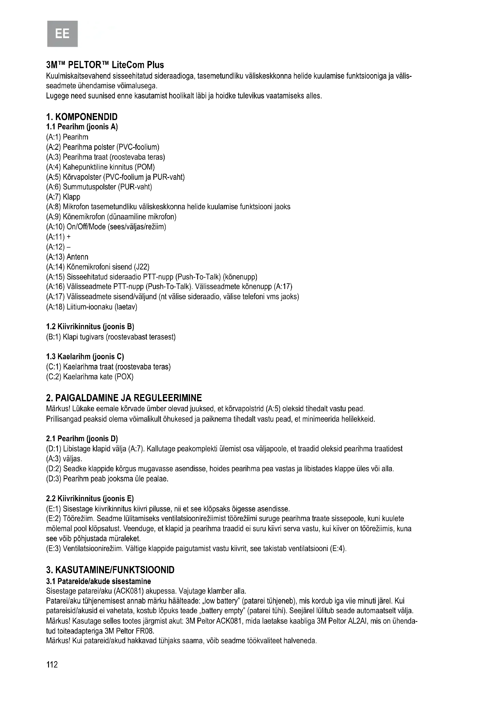 3M™ PELTOR™ LiteCom Plus Kuulmiskaitsevahend sisseehitatud sideraadioga, tasemetundliku väliskeskkonna helide kuulamise funktsiooniga ja välis- seadmete ühendamise võimalusega. Lugege need suunised enne kasutamist hoolikalt läbi ja hoidke tulevikus vaatamiseks alles.