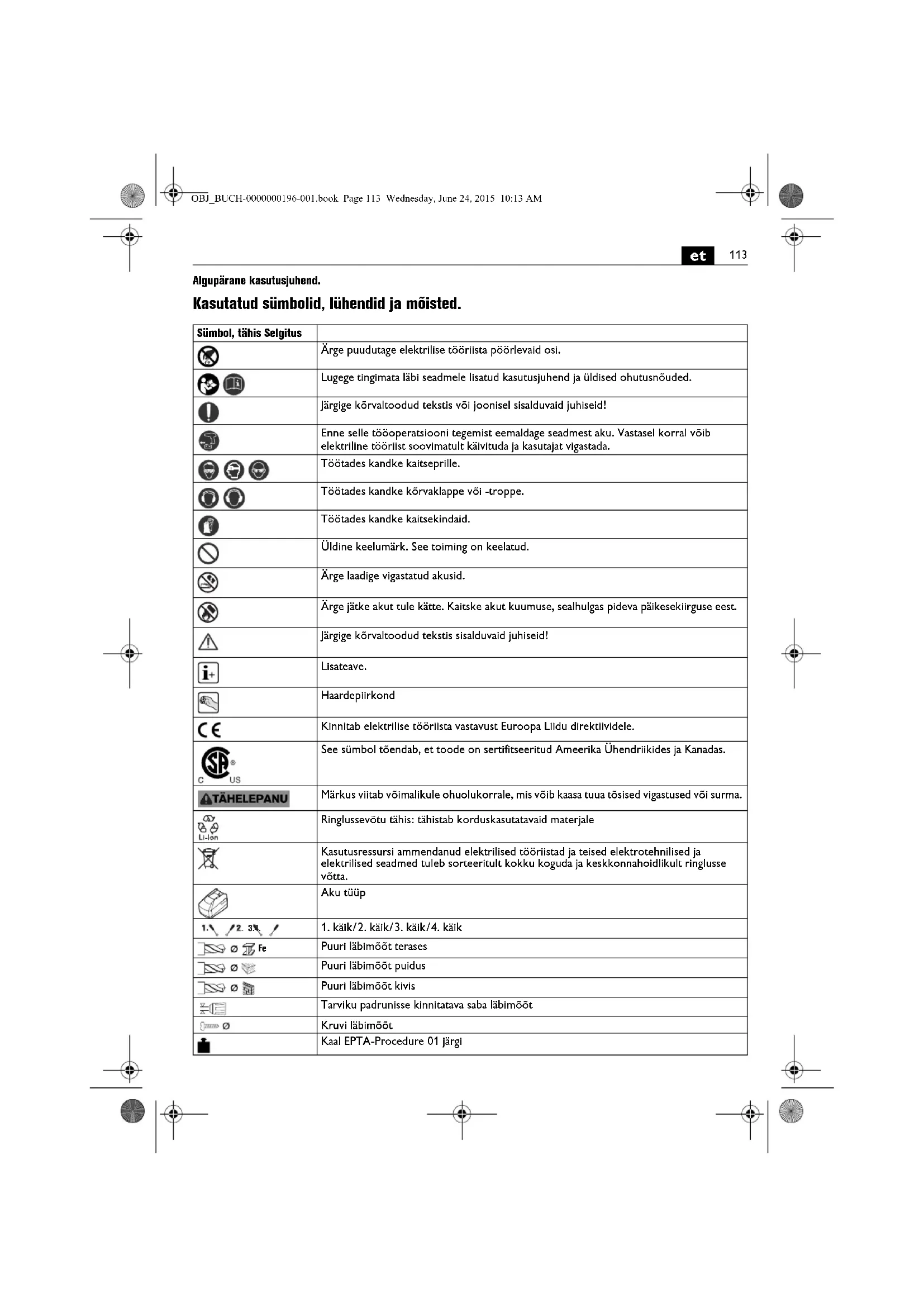 Algupärane kasutusjuhend. Kasutatud sümbolid, lühendid ja mõisted. Sümbol, tähis Selgitus Ärge puudutage elektrilise tööriista pöörlevaid osi. Lugege tingimata läbi seadmele lisatud kasutusjuhend ja üldised ohutusnõuded. Järgige kõrvaltoodud tekstis või joonisel sisalduvaid juhiseid! Enne selle tööoperatsiooni tegemist eemaldage seadmest aku. Vastasel korral võib elektriline tööriist soovimatult käivituda ja kasutajat vigastada. Töötades kandke kaitseprille. Töötades kandke kõrvaklappe või -troppe. Töötades kandke kaitsekindaid. Üldine keelumärk. See toiming on keelatud. Ärge laadige vigastatud akusid. Ärge jätke akut tule kätte. Kaitske akut kuumuse, sealhulgas pideva päikesekiirguse eest. Järgige kõrvaltoodud tekstis sisalduvaid juhiseid! Lisateave. Haardepiirkond Kinnitab elektrilise tööriista vastavust Euroopa Liidu direktiividele. See sümbol tõendab, et toode on sertifitseeritud Ameerika Ühendriikides ja Kanadas. Märkus viitab võimalikule ohuolukorrale, mis võib kaasa tuua tõsised vigastused või surma. Ringlussevõtu tähis: tähistab korduskasutatavaid materjale Kasutusressursi ammendanud elektrilised tööriistad ja teised elektrotehnilised ja elektrilised seadmed tuleb sorteeritult kokku koguda ja keskkonnahoidlikult ringlusse võtta. Aku tüüp