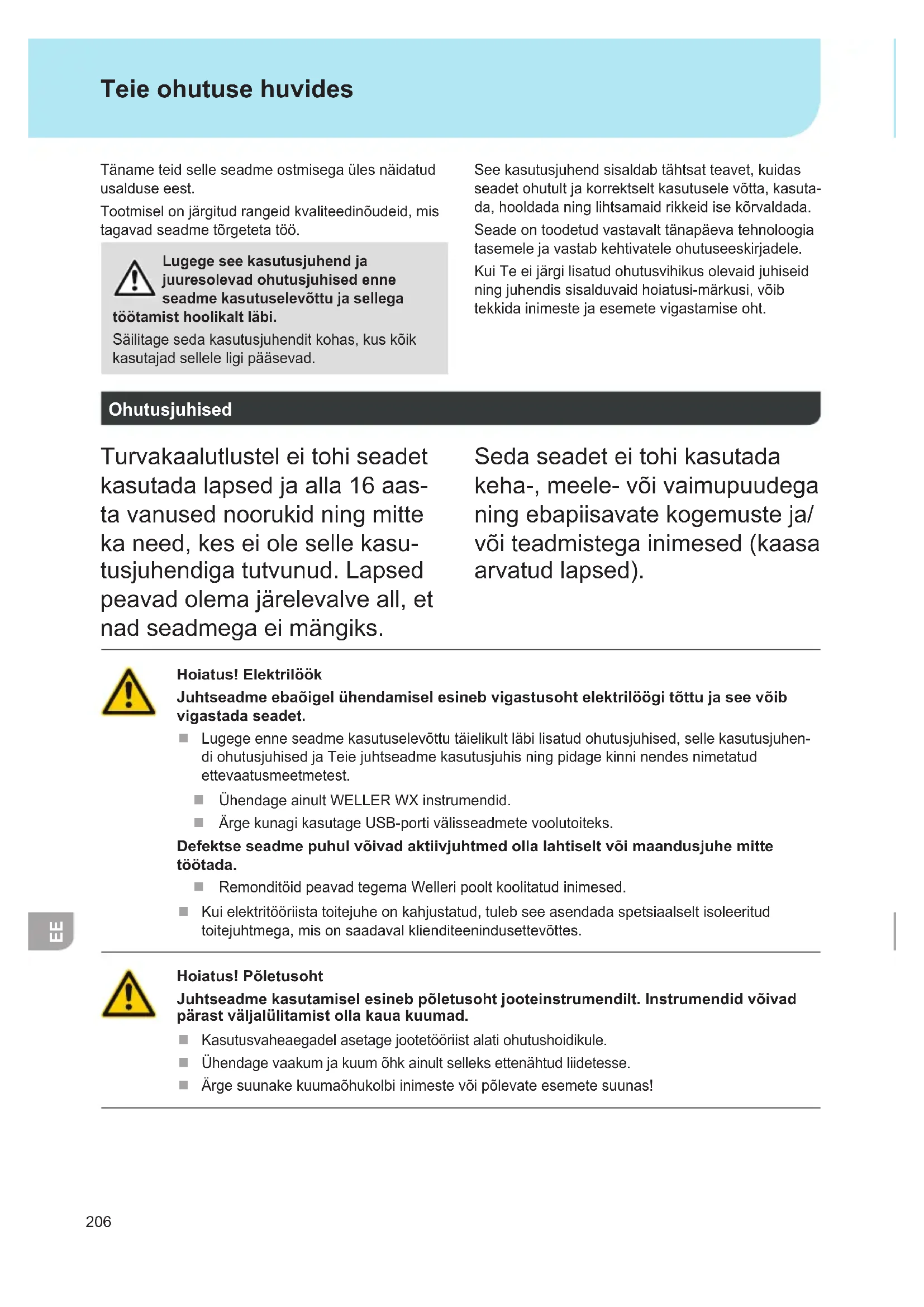 Täname teid selle seadme ostmisega üles näidatud usalduse eest. Tootmisel on järgitud rangeid kvaliteedinõudeid, mis tagavad seadme tõrgeteta töö. Lugege see kasutusjuhend ja juuresolevad ohutusjuhised enne seadme kasutuselevõttu ja sellega töötamist hoolikalt läbi. Säilitage seda kasutusjuhendit kohas, kus kõik kasutajad sellele ligi pääsevad. See kasutusjuhend sisaldab tähtsat teavet, kuidas seadet ohutult ja korrektselt kasutusele võtta, kasuta- da, hooldada ning lihtsamaid rikkeid ise kõrvaldada. Seade on toodetud vastavalt tänapäeva tehnoloogia tasemele ja vastab kehtivatele ohutuseeskirjadele. Kui Te ei järgi lisatud ohutusvihikus olevaid juhiseid ning juhendis sisalduvaid hoiatusi-märkusi, võib tekkida inimeste ja esemete vigastamise oht. Ohutusjuhised Turvakaalutlustel ei tohi seadet kasutada lapsed ja alla 16 aas- ta vanused noorukid ning mitte ka need, kes ei ole selle kasu- tusjuhendiga tutvunud. Lapsed peavad olema järelevalve all, et nad seadmega ei mängiks. Seda seadet ei tohi kasutada keha-, meele- või vaimupuudega ning ebapiisavate kogemuste ja/ või teadmistega inimesed (kaasa arvatud lapsed). Hoiatus! Elektrilöök Juhtseadme ebaõigel ühendamisel esineb vigastusoht elektrilöögi tõttu ja see võib vigastada seadet. Lugege enne seadme kasutuselevõttu täielikult läbi lisatud ohutusjuhised, selle kasutusjuhen- di ohutusjuhised ja Teie juhtseadme kasutusjuhis ning pidage kinni nendes nimetatud ettevaatusmeetmetest. Ühendage ainult WELLER WX instrumendid. Ärge kunagi kasutage USB-porti välisseadmete voolutoiteks. Defektse seadme puhul võivad aktiivjuhtmed olla lahtiselt või maandusjuhe mitte töötada. Remonditöid peavad tegema Welleri poolt koolitatud inimesed. Kui elektritööriista toitejuhe on kahjustatud, tuleb see asendada spetsiaalselt isoleeritud toitejuhtmega, mis on saadaval klienditeenindusettevõttes. Hoiatus! Põletusoht Juhtseadme kasutamisel esineb põletusoht jooteinstrumendilt. Instrumendid võivad pärast väljalülitamist olla kaua kuumad. Kasutusvaheaegadel asetage jootetööriist alati ohutushoidikule. Ühendage vaakum ja kuum õhk ainult selleks ettenähtud liidetesse. Ärge suunake kuumaõhukolbi inimeste või põlevate esemete suunas! Teie ohutuse huvides207