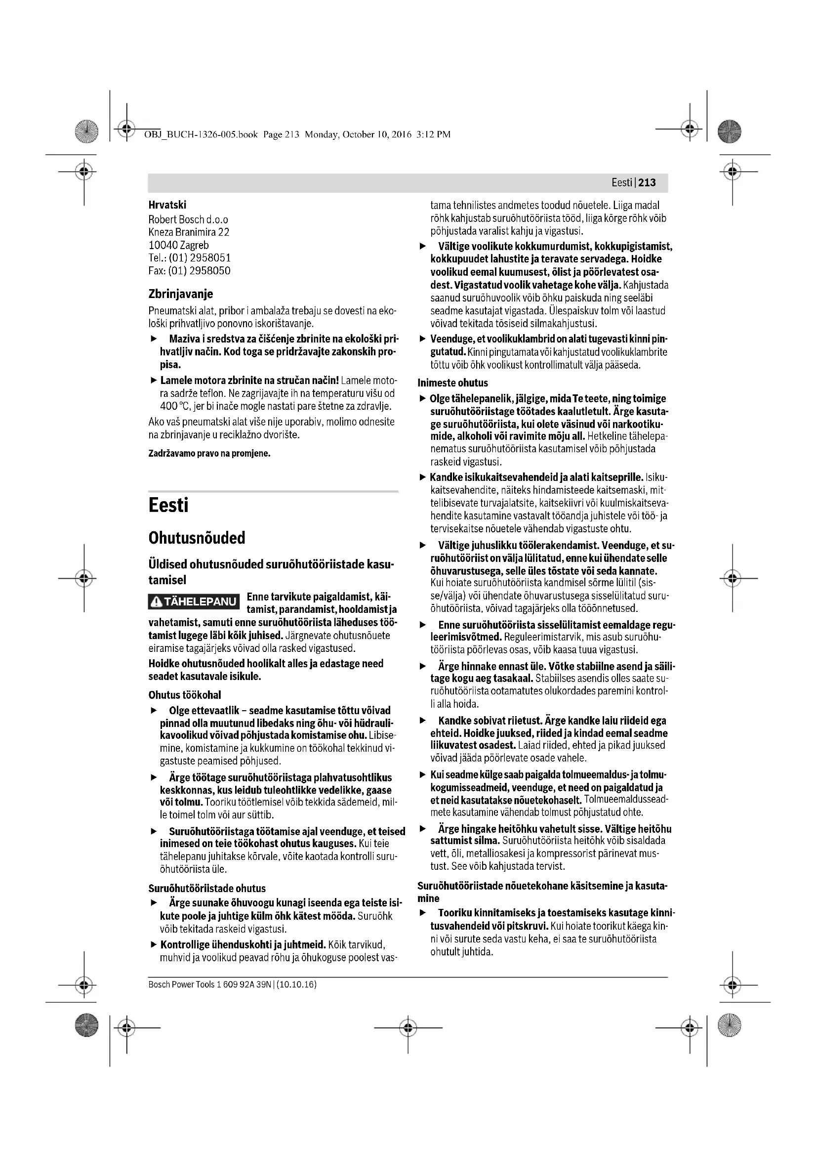 (vt „Tehnilised and- med“) suuremad, tuleks suruõhutööriista Boschi hool- dekeskuses kontrollida lasta. Liiga suurtel tühikäigupöö- retel võib tarvik puruneda, liiga väikestel tühikäigupööretel väheneb tööjõudlus. Boschi volitatud parandustöökojas tehakse need tööd kiiresti ja usaldusväärselt. Kasutage üksnes Boschi originaalvaruosi. Regulaarne puhastamine – Puhastage regulaarselt suruõhuseadme õhu sisselaskeava küljes olevat filtrit. Selleks kruvige maha voolikunippel 4 ja eemaldage filtri küljest mustuse- ja tolmuosakesed. Kruvi- ge seejärel voolikunippel uuesti kinni. – Suruõhus sisalduvad vee- ja mustuseosakesed tekitavad roostet ja põhjustavad lamellide, ventiilide jmt kulumist. Selle vältimiseks tuleks õhu sisselaskeava 3 paari tilga mootoriõliga õlitada. Ühendage suruõhuseade uuesti õhu- varustusega (vt „Õhuvarustusega ühendamine“, lk 217) ja laske sel 5 –10 s töötada, pühkides väljavoolava õli räti- kuga ära. Kui suruõhuseadet ei kasutata pikemat aega, tuleks seda protseduuri alati läbi viia. Puhastamise välp – Pärast esimese 150 töötunni möödumist puhastage re- duktorit mahedatoimelise lahustiga. Järgige lahusti tootja kasutus- ja utiliseerimisjuhiseid. Seejärel määrige redukto- rit Boschi spetsiaalse reduktorimäärdega. Korrake puhas- tamist 300-töötunnise intervalliga. Spetsiaalne reduktorimääre (225 ml) Tootenumber 3 605 430 009 – Mootorilamellid tuleb kvalifitseeritud tehnikutel regulaar- selt üle kontrollida ja vajaduse korral välja vahetada lasta. Selliste suruõhutööriistade määrimine, mis ei kuulu CLEAN-sarja Kõikide Boschi suruõhuseadmete puhul, mis ei kuulu CLEAN- sarja (suruõhumootori eriliik, mis töötab õlivaba suruõhuga), tuleks suruõhule pidevalt juurde segada õliaerosooli. Selleks vajalik suruõhuõlitaja asub suruõhu hooldusüksuses (lisatea- vat saate kompressori tootjalt). Suruõhuseadme otsemäärimiseks või hooldusüksusesse se- gamiseks tuleb kasutada mootoriõli SAE 10 või SAE 20. Lisatarvikud Täieliku teabe lisatarvikute kohta saate Internetist aadressi- del www.bosch-pt.com või edasimüüjalt. Klienditeenindus ja müügijärgne nõustamine Järelepärimiste esitamisel ja tagavaraosade tellimisel näida- ke kindlasti ära suruõhuseadme andmesildil olev 10-kohaline tootenumber. Klienditeeninduses vastatakse toote paranduse ja hoolduse ning varuosade kohta esitatud küsimustele. Joonised ja teabe varuosade kohta leiate ka veebisaidilt: www.bosch-pt.com Boschi nõustajad osutavad Teile toodete ja tarvikute küsimus- tes meeleldi abi. Eesti Vabariik Mercantile Group AS Boschi elektriliste käsitööriistade remont ja hooldus Pärnu mnt. 549 76401 Saue vald, Laagri Tel.: 6549 568 Faks: 679 1129 OBJ_BUCH-1326-005.book Page 219 Monday, October 10, 2016 3:12 PM220 | Latviešu 1 609 92A 39N | (10.10.16) Bosch Power Tools Kasutuskõlbmatuks muutunud seadmete käitlus Suruõhuseade, lisatarvikud ja pakend tuleks suunata kesk- konnasõbralikku taaskasutussüsteemi. Määrdeained ja puhastusvahendid utiliseerige kesk- konda säästval viisil. Järgige kasutusriigis kehtivaid nõudeid. Utiliseerige mootorilamellid nõuetekohaselt! Mootori- lamellid sisaldavad teflonit. Ärge kuumutage neid üle 400 °C, kuna vastasel juhul võivad tekkida tervistkahjus- tavad aurud. Kui suruõhuseade on kasutusressursi ammendanud, toimeta- ge see ümbertöötluskeskusse või tagastage Boschi volitatud edasimüüjale. Tootja jätab endale õiguse muudatuste tegemiseks. Latviešu Drošības noteikumi Vispārējie drošības noteikumi pneimatiskajiem instrumentiem Pirms pneimatiskā instrumenta uzstādīšanas, darbināšanas, re- monta, apkalpošanas un piederumu nomaiņas, kā arī pirms darba pneimatiskā instrumenta tuvumā izlasiet un ievērojiet visus norādījumus. Tālāk sniegto drošības notei- kumu neievērošanas dēļ strādājošā persona var gūt nopietnus savainojumus. Uzglabājiet drošības noteikumus un nododiet tos strādā- jošajai personai. Drošība darba vietā Sekojiet, lai virsma, uz kuras stāvot notiek darbs ar ins- trumentu, nebūtu slidena, kā arī veiciet pasākumus, lai tiktu novērstas paklupšanas briesmas, kājai aizķero- ties aiz pneimatiskās vai hidrauliskās šļūtenes. Paslīdē- šana, paklupšana un kritieni ir galvenie faktori, kas izraisa savainojumu rašanos darba vietā.