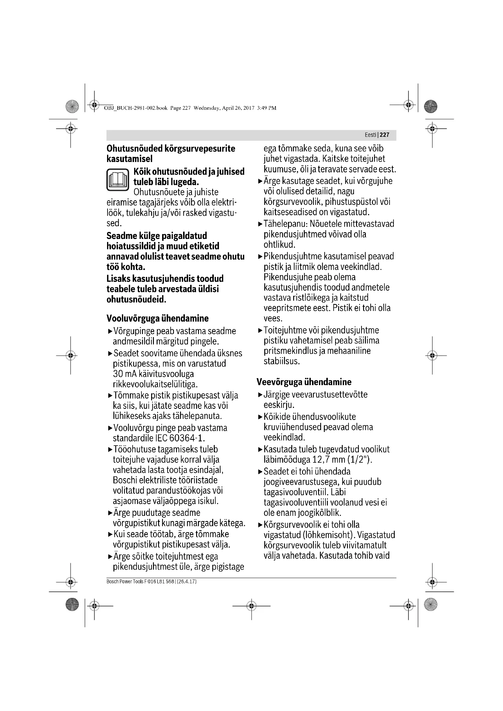 1,3 0,6 1,5 0,6 1,3 0,6 OBJ_BUCH-2981-002.book Page 230 Wednesday, April 26, 2017 3:49 PMEesti | 231 Bosch Power Tools F 016 L81 568 | (26.4.17) Kokkupanek ja kasutamine Kasutuselevõtt Elektriline ohutus Tähelepanu! Enne hooldus- ja puhastustöid lülitage aiatööriist välja ja eemaldage toitepistik pistikupesast. Lülitage seade välja ka juhul, kui toitejuhe on vigastatud või keerdu läinud. Teie aiatööriist on ohutuse tagamiseks varustatud kaitseisolatsiooniga ega vaja maandamist. Tööpinge on 230 V AC, 50 Hz (ELi mittekuuluvates riikides ka 220 V või 240 V). Ohutuse suurendamiseks kasutage FI-kaitselülitit (RCD), mille rikkevool on maksimaalselt 30 mA. FI-kaitselüliti tuleks iga kord enne kasutamist üle kontrollida. Toite- ja ühendusjuhtmeid tuleb korrapäraselt kontrollida, et veenduda nende veatus seisundis. Tööohutuse tagamiseks tuleb toitejuhe lasta vajaduse korral vahetada Boschi elektriliste tööriistade volitatud parandustöökojas. Kasutage üksnes heakskiidetud pikendusjuhtmeid. ETTEVAATUST: Nõuetele mittevastavad pikendusjuhtmed võivad olla ohtlikud. Pikendusjuhe, pistik ja pistikupesa peavad olema veekindlad ja ette nähtud kasutamiseks välistingimustes. Kasutage üksnes pikenduskaableid ja – juhtmeid ning kaablitrumleid, mis vastavad standarditele EN 61242 / IEC 61242 või IEC 60884-2-7. Kui soovite kasutada pikendusjuhet, peab juhtme ristlõige olema järgmine: –Juhtme ristlõige 1,5mm
