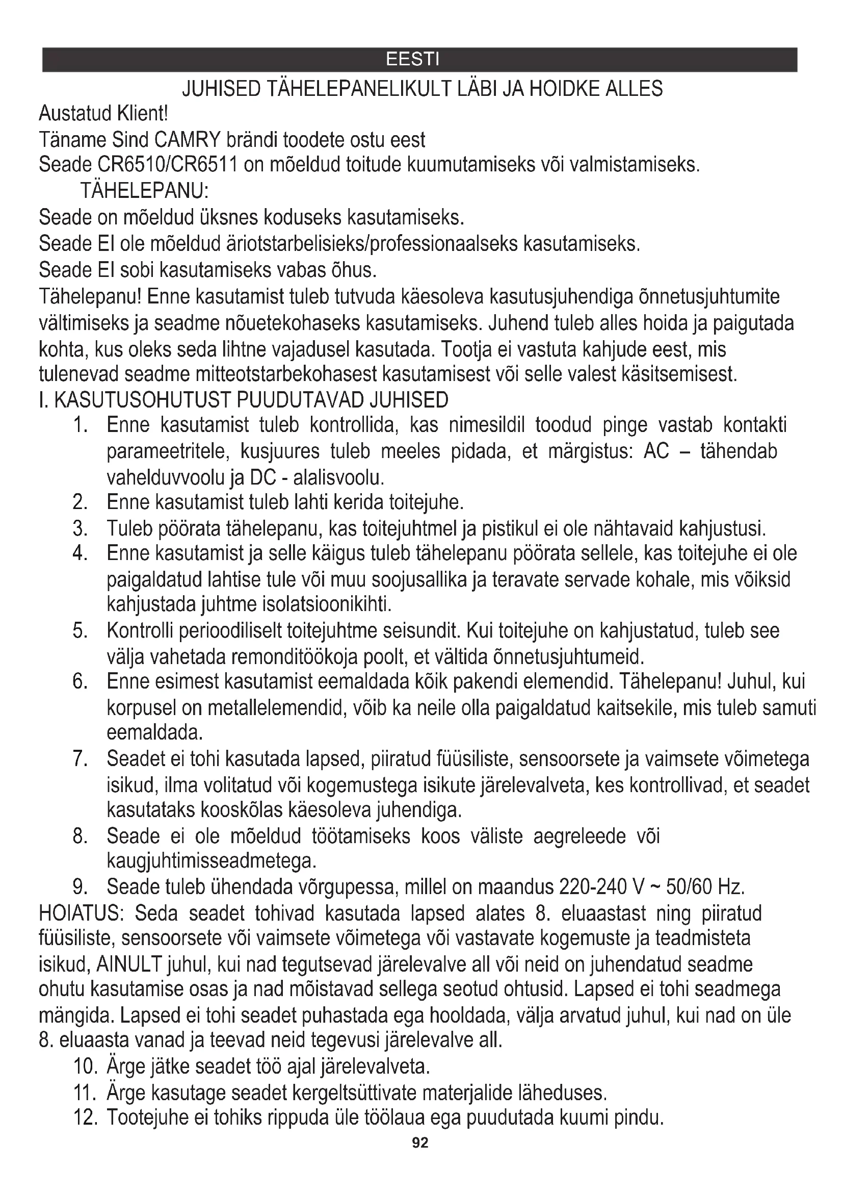 HOIATUS: Seda seadet tohivad kasutada lapsed alates 8. eluaastast ning piiratud füüsiliste, sensoorsete või vaimsete võimetega või vastavate kogemuste ja teadmisteta isikud, AINULT juhul, kui nad tegutsevad järelevalve all või neid on juhendatud seadme ohutu kasutamise osas ja nad mõistavad sellega seotud ohtusid. Lapsed ei tohi seadmega mängida. Lapsed ei tohi seadet puhastada ega hooldada, välja arvatud juhul, kui nad on üle 8. eluaasta vanad ja teevad neid tegevusi järelevalve all.