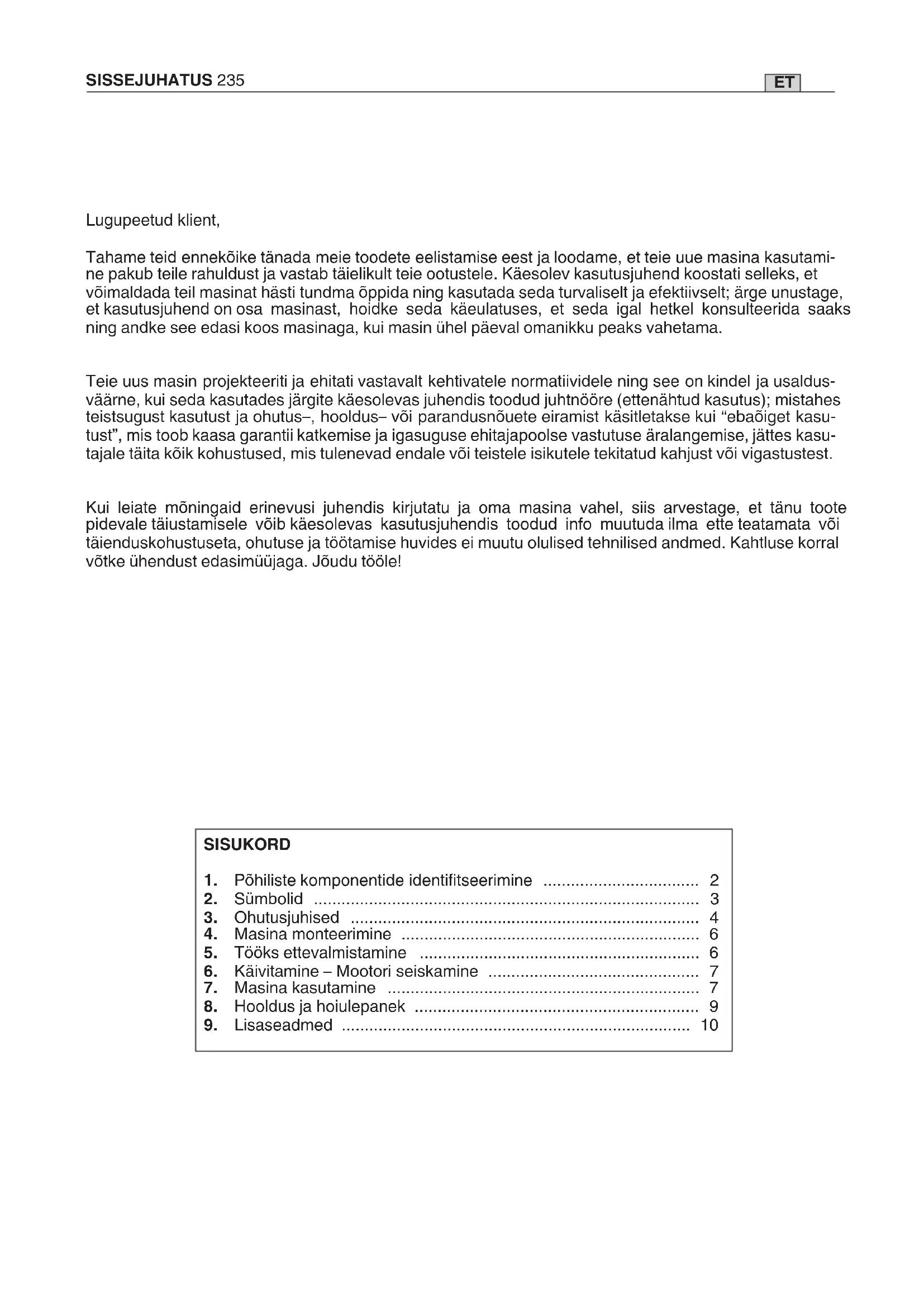 Mодел T 1.0 EJ 118801750/0 (M8 x 1,25 dx M)ET SISSEJUHATUS 235 Lugupeetud klient, Tahame teid ennekõike tänada meie toodete eelistamise eest ja loodame, et teie uue masina kasutami- ne pakub teile rahuldust ja vastab täielikult teie ootustele. Käesolev kasutusjuhend koostati selleks, et võimaldada teil masinat hästi tundma õppida ning kasutada seda turvaliselt ja efektiivselt; ärge unustage, et kasutusjuhend on osa masinast, hoidke seda käeulatuses, et seda igal hetkel konsulteerida saaks ning andke see edasi koos masinaga, kui masin ühel päeval omanikku peaks vahetama. Teie uus masin projekteeriti ja ehitati vastavalt kehtivatele normatiividele ning see on kindel ja usaldus- väärne, kui seda kasutades järgite käesolevas juhendis toodud juhtnööre (ettenähtud kasutus); mistahes teistsugust kasutust ja ohutus–, hooldus– või parandusnõuete eiramist käsitletakse kui “ebaõiget kasu- tust”, mis toob kaasa garantii katkemise ja igasuguse ehitajapoolse vastutuse äralangemise, jättes kasu- tajale täita kõik kohustused, mis tulenevad endale või teistele isikutele tekitatud kahjust või vigastustest. Kui leiate mõningaid erinevusi juhendis kirjutatu ja oma masina vahel, siis arvestage, et tänu toote pidevale täiustamisele võib käesolevas kasutusjuhendis toodud info muutuda ilma ette teatamata või täienduskohustuseta, ohutuse ja töötamise huvides ei muutu olulised tehnilised andmed. Kahtluse korral võtke ühendust edasimüüjaga. Jõudu tööle! SISUKORD