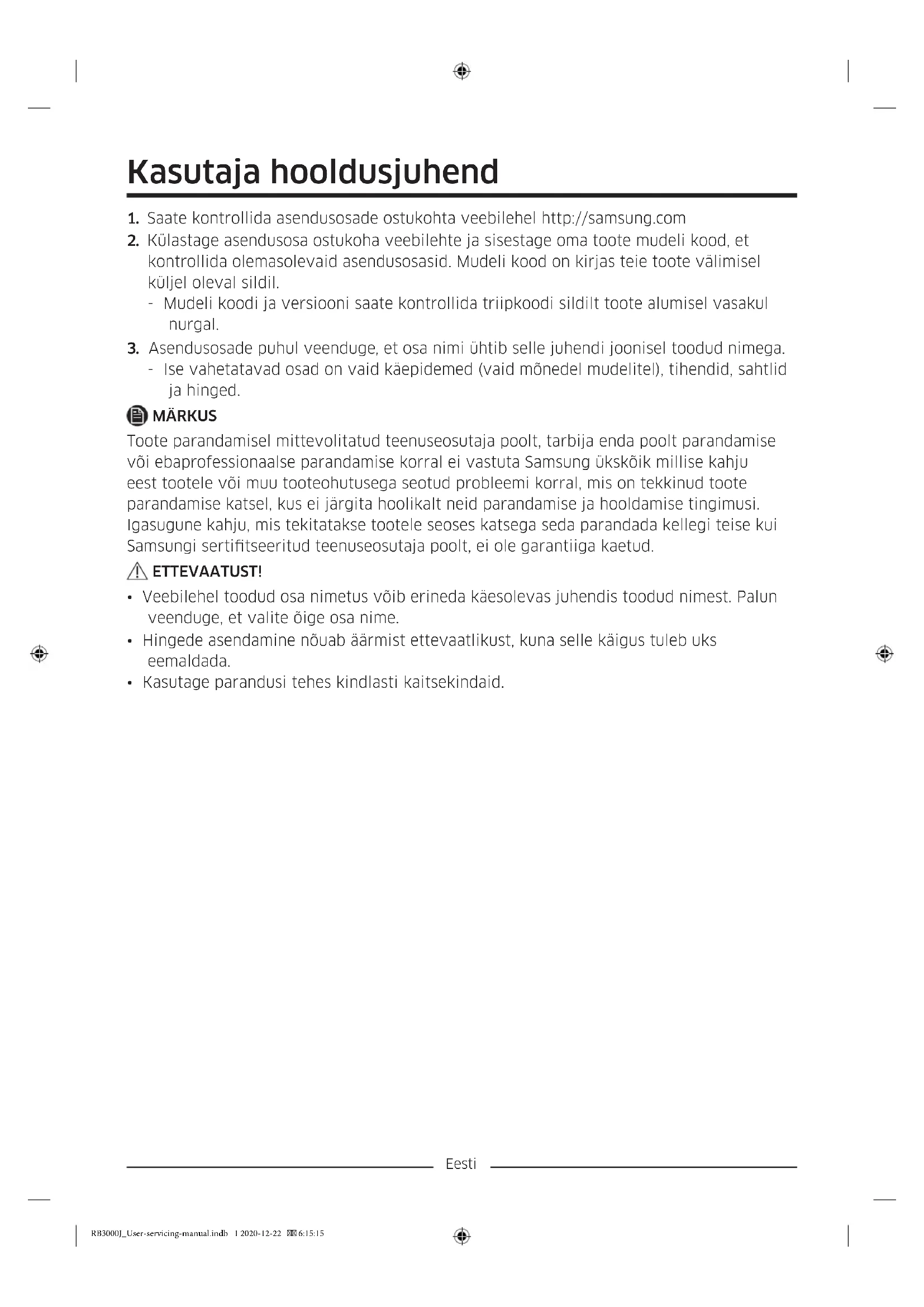 - Ise vahetatavad osad on vaid käepidemed (vaid mõnedel mudelitel), tihendid, sahtlid ja hinged. MÄRKUS Toote parandamisel mittevolitatud teenuseosutaja poolt, tarbija enda poolt parandamise või ebaprofessionaalse parandamise korral ei vastuta Samsung ükskõik millise kahju eest tootele või muu tooteohutusega seotud probleemi korral, mis on tekkinud toote parandamise katsel, kus ei järgita hoolikalt neid parandamise ja hooldamise tingimusi. Igasugune kahju, mis tekitatakse tootele seoses katsega seda parandada kellegi teise kui Samsungi sertitseeritud teenuseosutaja poolt, ei ole garantiiga kaetud. ETTEVAATUST!