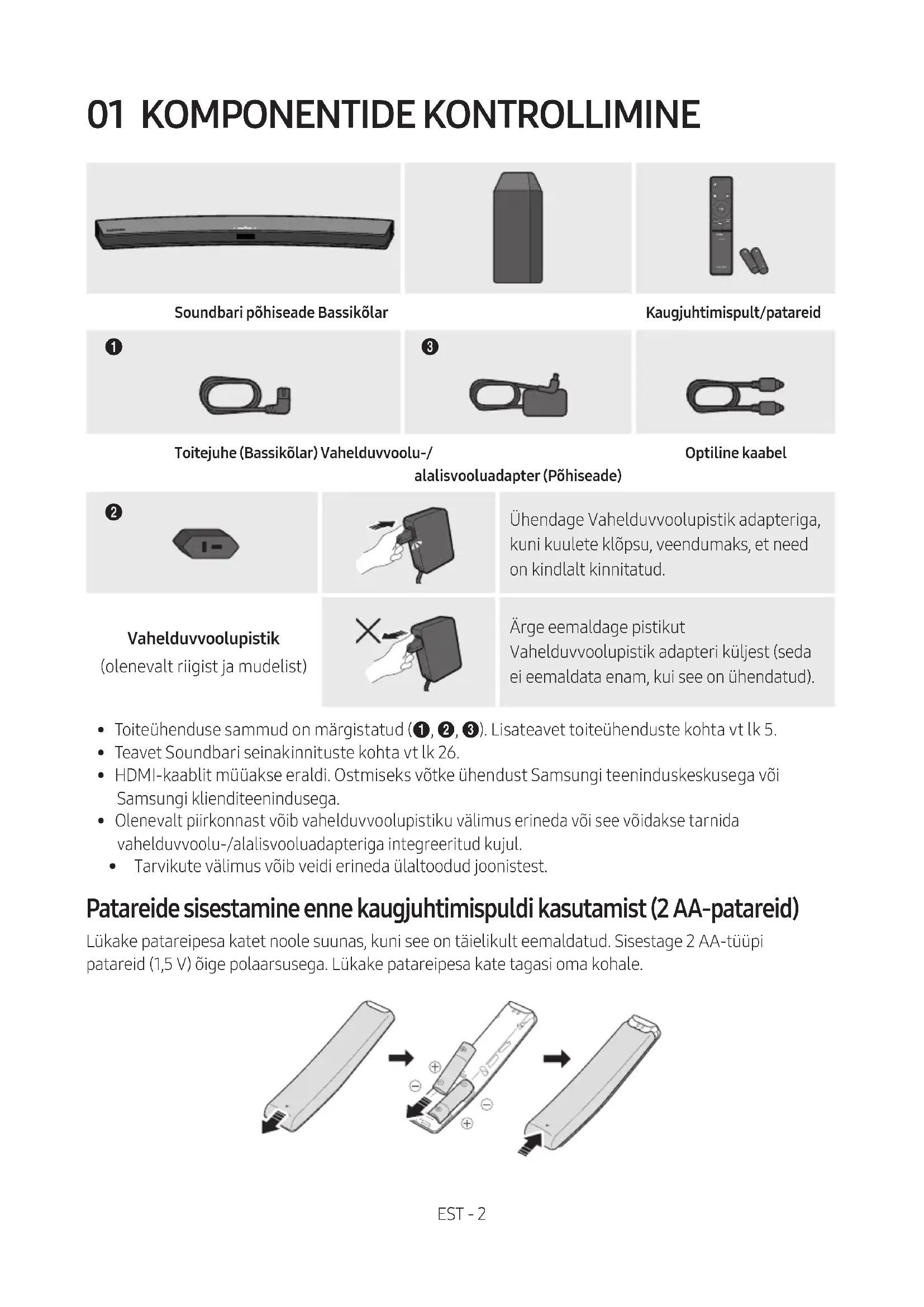Klienditoekeskusesse pääsemiseks skannige QR-koodi. Juhendi vaatamiseks arvutis või mobiilsideseadmes laadige see veebisaidilt dokumendivormingus alla. (http://www.samsung.com/support) Disain ja tehnilised andmed võivad muutuda ilma ette teatamata.EST - iv SISUKORD 01 Komponentide Kontrollimine 2 Patareide sisestamine enne kaugjuhtimispuldi kasutamist (2 AA-patareid) ------------------------- 2 02 Toote Ülevaade 3 Soundbari pealmine paneel / esipaneel ------------------------- 3 Soundbari alumine paneel ------------------------- 4 03 Soundbari Ühendamine 5 Elektritoite ühendamine