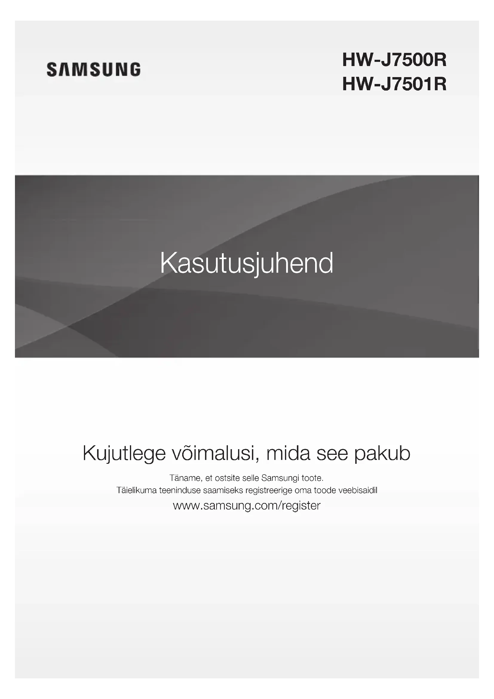 Web Site AUSTRIA 0800-SAMSUNG (0800-7267864) [Only for Premium HA] 0800-366661 [Only for Dealers] 0810-112233 www.samsung.com/at/support SWITZERLAND 0800 726 78 64 (0800-SAMSUNG) www.samsung.com/ch/support (German) www.samsung.com/ch_fr/ support (French) CZECH 800 - SAMSUNG (800-726786) www.samsung.com/cz/support SLOVAKIA 0800 - SAMSUNG (0800-726 786) www.samsung.com/sk/support CROATIA 072 726 786 www.samsung.com/hr/support BOSNIA 055 233 999 www.samsung.com/support MONTENEGRO 020 405 888 www.samsung.com/support SLOVENIA 080 697 267 (brezplačna številka) www.samsung.com/si SERBIA 011 321 6899 www.samsung.com/rs/support BULGARIA *3000 Цена в мрежата 0800 111 31 , Безплатна телефонна линия www.samsung.com/bg/support ROMANIA *8000 (apel in retea) 08008-726-78-64 (08008-SAMSUNG) Apel GRATUIT www.samsung.com/ro/support CYPRUS 8009 4000 only from landline, toll free www.samsung.com/gr/support GREECE 80111-SAMSUNG (80111 726 7864) only from land line (+30) 210 6897691 from mobile and land line LITHUANIA 8-800-77777 www.samsung.com/lt/support LATVIA 8000-7267 www.samsung.com/lv/support ESTONIA 800-7267 www.samsung.com/ee/supportKasutusjuhend Kujutlege võimalusi, mida see pakub Täname, et ostsite selle Samsungi toote. Täielikuma teeninduse saamiseks registreerige oma toode veebisaidil www.samsung.com/register HW-J7500R HW-J7501R2 ALUSTAMINE OHUTUSALANE TEAVE HOIATUSED ELEKTRILÖÖGIOHU VÄHENDAMISEKS ÄRGE EEMALDAGE KAANT (EGA TAGAPANEELI). SEADMES POLE KASUTAJA HOOLDATAVAID OSI. HOOLDAMISEKS PÖÖRDUGE KVALIFITSEERITUD TEENINDUSTÖÖTAJATE POOLE. ETTEVAATUST! MITTE AVADA, ELEKTRILÖÖGIOHTSee sümbol näitab, et toote sees on kõrgepinge. Mis tahes kokkupuude mõne selle toote sisemise osaga on ohtlik.See sümbol näitab, et kasutamist ja hooldust puudutav oluline lugemismaterjal on selle tootega kaasas.II klassi toode: selle sümboliga tähistatud toode ei nõua ohutuks ühendamiseks elektrimaandust.Vahelduvvoolupinge: selle sümboliga tähistatud nimipinge on vahelduvvoolupinge.Alalisvoolupinge: selle sümboliga tähistatud nimipinge on alalisvoolupinge.Ettevaatust, vaadake kasutusjuhendit: see sümbol annab teada, et kasutaja peab täpsemat ohutusteavet vaatama kasutusjuhendist. HOIATUS : Tulekahju- või elektrilöögiohu vähendamiseks ei tohi seade kokku puutuda vihmavee ega niiskusega. ETTEVAATUST! : ELEKTRILÖÖGI VÄLTIMISEKS PANGE PISTIKU LAI HARU TÄIELIKULT LAIA PILUSSE.• Seade peab alati olema ühendatud kaitsemaandusega vahelduvvoolu pistikupessa.