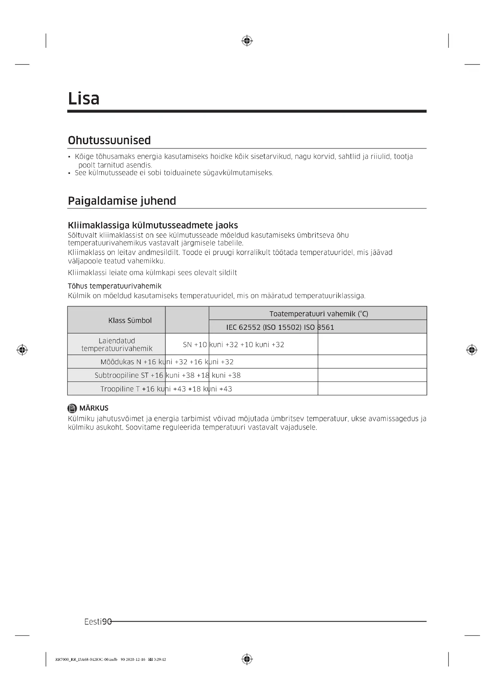 Laiendatud temperatuurivahemik SN +10 kuni +32 +10 kuni +32 Mõõdukas N +16 kuni +32 +16 kuni +32 Subtroopiline ST +16 kuni +38 +18 kuni +38 Troopiline T +16 kuni +43 +18 kuni +43 MÄRKUS Külmiku jahutusvõimet ja energia tarbimist võivad mõjutada ümbritsev temperatuur, ukse avamissagedus ja külmiku asukoht. Soovitame reguleerida temperatuuri vastavalt vajadusele. RR7000_RR_DA68-04283C-00.indb 90 2020-12-16 3:29:42Eesti 91 Temperatuuri juhend Soovitatav temperatuur Toidu säilitamiseks optimaalne temperatuuriseadistus