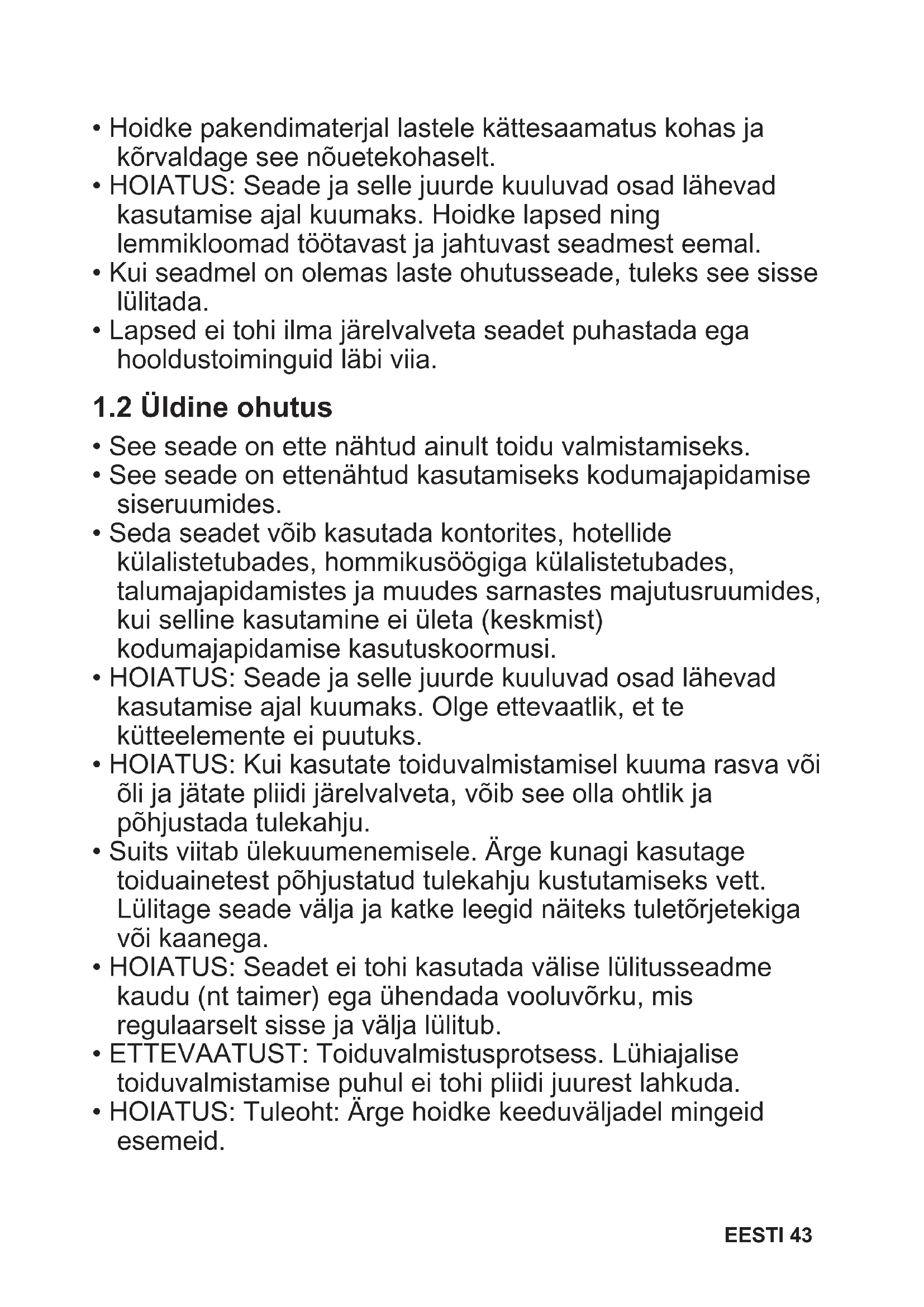 - HOIATUS: Seade ja selle juurde kuuluvad osad lähevad kasutamise ajal kuumaks. Hoidke lapsed ning lemmikloomad töötavast ja jahtuvast seadmest eemal.