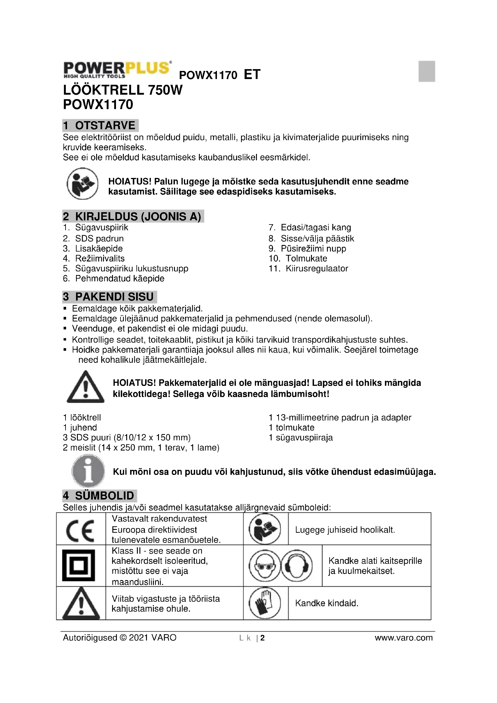 - Edasi/tagasi kang (7) määrab tööriista pöörlemissuuna. Edaspidise suuna valimiseks vabastage sisse/välja lüliti ja suruge edaspidi/tagurpidi pöörlemissuuna valits paremale (R). Tagurpidi pöörlemise valimiseks lükake hoob tööriistast vasakule (L). Kangi asendi muutmiseks peab sisse/välja lüliti olema vabastatud ja mootor seiskunud. 9 TEHNILISED ANDMED Mudel POWX1170 Pinge 230-240 V~ 50 Hz Võimsus 750 watti Tühikäigukiirus 0-1050 min-1 Löögisagedus 0-4900 min-1 Kinnitus SDS Maksimaalne puurimislaius Betoon 26 mm Teras 13 mm Puit 40 mm Netokaal 4,9 kg Isolatsiooniklass / II 10 MÜRA Müraväärtusi mõõdetakse vastavalt asjakohastele standarditele. (K=3) Helirõhu tase LpA 91 dB(A) Helivõimsuse tase LwA 102 dB(A) ATTENTION! Wear hearing protection when sound pressure is over 85 dB(A). aw (vibratsioon) 8,7 m/s² K = 1,5 m/s²POWX1170 ET Autoriõigused © 2021 VARO Lk | 8 www.varo.com 11 HOOLDAMINE Hoidke trelli alati puhtana. Ärge kasutage plastiku puhastamiseks söövitavaid aineid. Kontrollige ülemääraste sädemete korral süsinikharjaseid. Hoidke õhutusavad vabana. 12 GARANTII Selle toote garantiiaeg kehtib 36 kuud ostukuupäevast alates toote esmaostjale. See garantii kehtib kõigile materjali- ja tootmispuudustele, väljaarvatud: akud, laadijad, tavapärase kulumise käigus kahjustunud komponendid nagu laagrid, harjased, kaablid ja pistikud või tarvikud nagu puurid, puuriterad, saeterad jm, valest kasutamist, õnnetustest või seadme modifitseerimisest tulenevad kahjustused, transpordikulud. Garantii ei kata ka sobimatust kasutamisest tulenevaid kahjustusi ja/või vigu. Tootja ei võta ka vastutust mis tahes vigastuste eest, mis tulenevad tööriista sobimatust kasutamisest. Remonttöid võivad läbi viia ainult Powerplusi tööriistade volitatud teeninduskeskused. Soovi korral saate alati lisateavet numbril 00 32 3 292 92 90. Kõik transpordikulud katab alati klient, kui ei ole teisiti kirjalikult kokku lepitud. Seejuures tuleb arvestada, et garantiinõuet ei arvestata, kui seadmele tekkinud kahjustused tulenevad kehvast hooldusest või seadme ülekooramisest. Garantii rakendumine on välistatud vedelike ja ülemäärase tolmu sattumisel seadmesse, tahtlikul kahjustamisel (meelega või tõsisest hooletusest põhjustatud kahjud), sobimatu kasutuse korral (nt eirates selles käsiraamatus toodud juhiseid), oskamatu koostamise korral, pikselöögi või vale võrgupinge korral. Ülaltoodud nimekiri ei ole täielik. Garantiinõude rahuldamine ei pikenda kunagi garantiiperioodi ning seadme asendamisel ei alga garantiiaja arvestus uuesti. Garantiiremondi raames asendatavad seadmed ja osad kuuluvad ettevõttele Varo NV. Tootja jätab endale õiguse keelduda garantiinõude menetlemisest, kui ostu ei ole võimalik tõendada või on selge, et toodet ei ole nõuetekohaselt hooldatud (õhuavad on puhastamata, süsinikharjased regulaarselt vahetamata jne). Hoidke ostutšekk alles ostukuupäeva tõendamiseks. Seade tuleb tagastada edasimüüjale komplektse ja mõistlikult puhtana (selle olemasolul algses plastikkohvris) koos ostu tõendava dokumendiga. 13 KESKKOND Kui teie seade vajab pikaajalise kasutamise järel asendamist, siis ärge visake seda olmejäätmete hulka, vaid utiliseerige keskkonnale ohutul viisil. Elektriliste seadmete jääke ei tohi kunagi visata olmeprügi hulka. Palun toimetage seade võimalusel ümbertöötlejale. Küsige ümbertöötlemise osas nõu kohalikelt võimudelt või edasimüüjalt.POWX1170 ET Autoriõigused © 2021 VARO Lk | 9 www.varo.com 14 VASTAVUSDEKLARATSIOON VARO N.V. - Vic. Van Rompuy N.V.- Joseph Van Instraat 9 - BE2500 Lier - BELGIA, kinnitab käesolevaga, et Toode: Lööktrell 750 w Kaubamärk: PowerPlus Mudel: POWX1170 on vastavuses kohaldatavate Euroopa Liidu direktiivide vajalike eeskirjade ja muude asjakohaste sätetega, mis põhinevad Euroopa ühtlustatud standardite kohaldamisel. Lubamatud muudatused seadme juures muudavad kinnituse kehtetuks. Euroopa direktiivid (sealhulgas vajaduse korral direktiivide muudatused kuni allkirjastamise kuupäevani): 2006/42/EC 2014/30/EU 2011/65/EU Euroopa ühtlustatud standardid (sealhulgas vajaduse korral standardide muudatused kuni allkirjastamise kuupäevani): EN60745-1: 2009 EN60745-2-6: 2010 EN55014-1: 2017 EN55014-2: 2015 EN61000-3-2: 2014 EN61000-3-3: 2013 Tehniliste dokumentide valdaja: Philippe Vankerkhove, VARO – Vic. Van Rompuy N.V. Allakirjutanu tegutseb ettevõtte tegevjuhi nimel, Philippe Vankerkhove Regulatiivküsimused – vastavuskontrolli juht 09/10/2020, Lier - BelgiumPOWX1172 UA Copyright © 2021 VARO NV С т о р і н к а | 1 www.varo.com 1 ЗАСТОСУВАННЯ p. 2