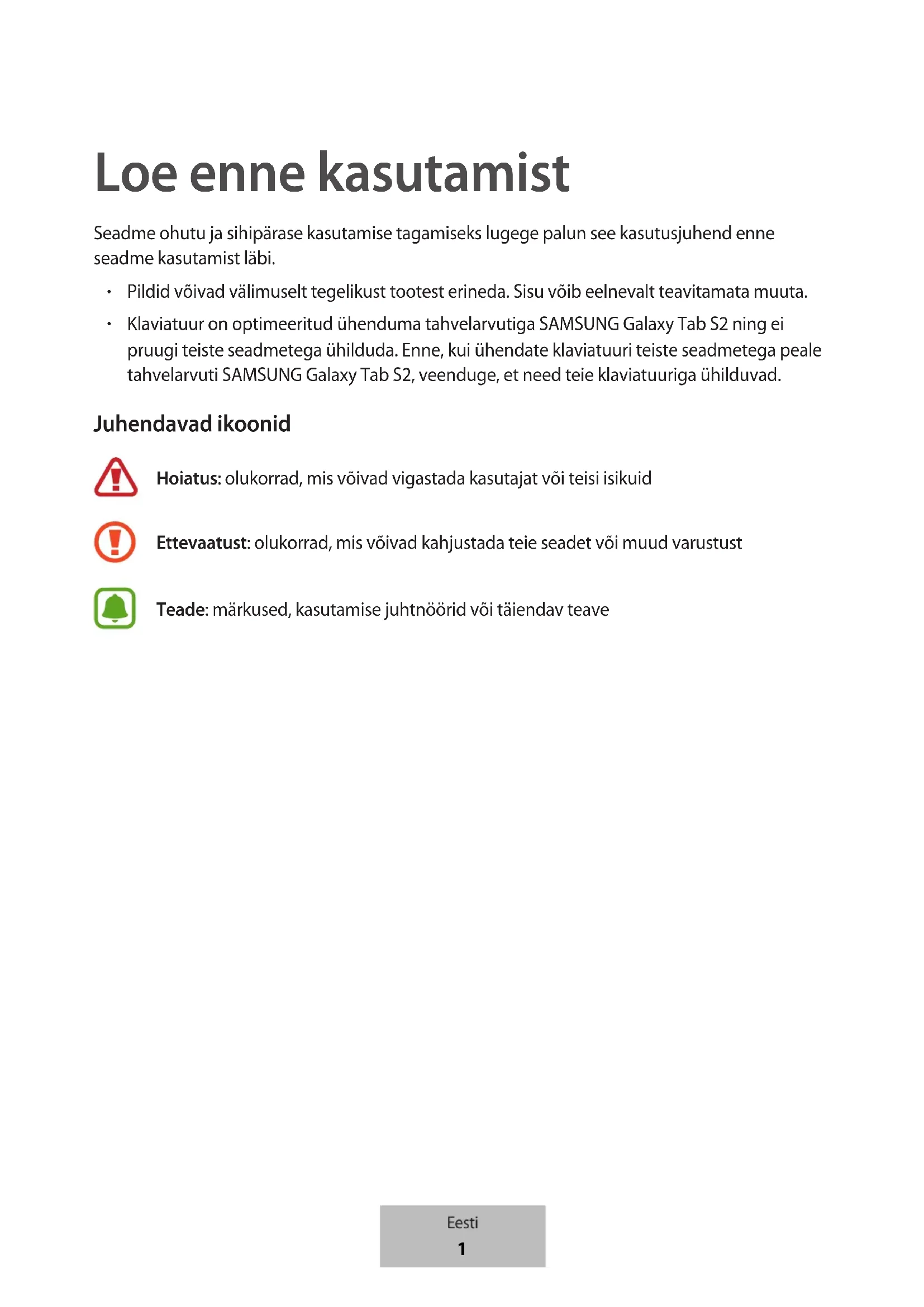Klaviatuur on optimeeritud ühenduma tahvelarvutiga SAMSUNG Galaxy Tab S2 ning ei pruugi teiste seadmetega ühilduda. Enne, kui ühendate klaviatuuri teiste seadmetega peale tahvelarvuti SAMSUNG Galaxy Tab S2, veenduge, et need teie klaviatuuriga ühilduvad. Juhendavad ikoonid Hoiatus: olukorrad, mis võivad vigastada kasutajat või teisi isikuid Ettevaatust: olukorrad, mis võivad kahjustada teie seadet või muud varustust Teade: märkused, kasutamise juhtnöörid või täiendav teave Eesti