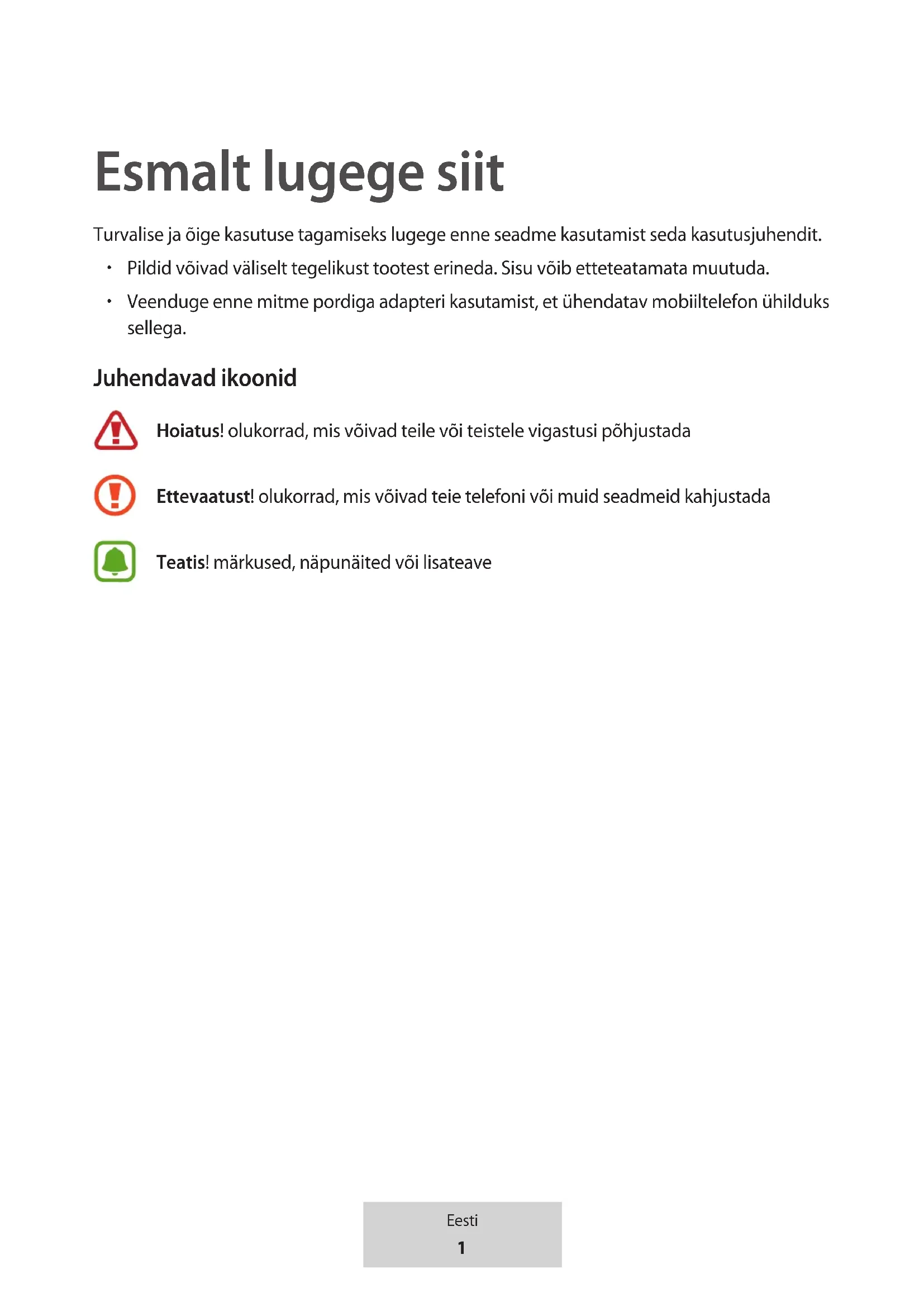 Veenduge enne mitme pordiga adapteri kasutamist, et ühendatav mobiiltelefon ühilduks sellega. Juhendavad ikoonid Hoiatus! olukorrad, mis võivad teile või teistele vigastusi põhjustada Ettevaatust! olukorrad, mis võivad teie telefoni või muid seadmeid kahjustada Teatis! märkused, näpunäited või lisateave Eesti2 Eesti Alustamine Pakendi sisu Veenduge, et tootekarbis on järgmised esemed:
