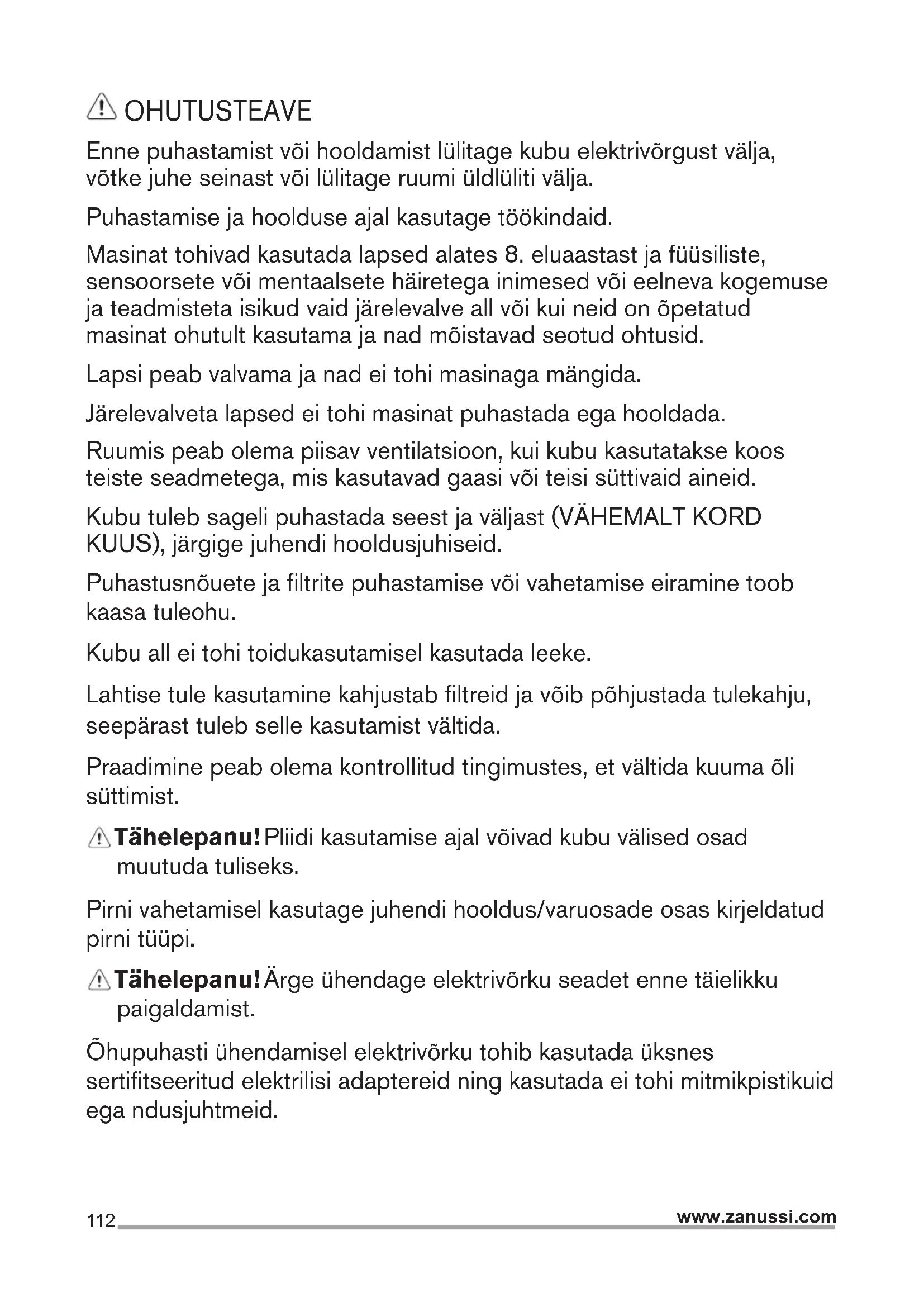Аспиратор је опремљен системом расвете која се базира на ЛЕД технологији. ЛЕД гарантује оптималну расвету, трајност за 10 пута већу од традиционалних лампа и омогућује уштеду енергије за 90% . Упозорење! Не гледајте директно у светла ЛЕД диода. За замену сијалице, обратите се овлашћеном сервисном центру за резервне делове.112 www.zanussi.com OHUTUSTEAVE Enne puhastamist või hooldamist lülitage kubu elektrivõrgust välja, võtke juhe seinast või lülitage ruumi üldlüliti välja. Puhastamise ja hoolduse ajal kasutage töökindaid. Masinat tohivad kasutada lapsed alates 8. eluaastast ja füüsiliste, sensoorsete või mentaalsete häiretega inimesed või eelneva kogemuse ja teadmisteta isikud vaid järelevalve all või kui neid on õpetatud masinat ohutult kasutama ja nad mõistavad seotud ohtusid. Lapsi peab valvama ja nad ei tohi masinaga mängida. Järelevalveta lapsed ei tohi masinat puhastada ega hooldada. Ruumis peab olema piisav ventilatsioon, kui kubu kasutatakse koos teiste seadmetega, mis kasutavad gaasi või teisi süttivaid aineid. Kubu tuleb sageli puhastada seest ja väljast (VÄHEMALT KORD KUUS), järgige juhendi hooldusjuhiseid. Puhastusnõuete ja filtrite puhastamise või vahetamise eiramine toob kaasa tuleohu. Kubu all ei tohi toidukasutamisel kasutada leeke. Lahtise tule kasutamine kahjustab filtreid ja võib põhjustada tulekahju, seepärast tuleb selle kasutamist vältida. Praadimine peab olema kontrollitud tingimustes, et vältida kuuma õli süttimist. Tähelepanu! Pliidi kasutamise ajal võivad kubu välised osad muutuda tuliseks. Pirni vahetamisel kasutage juhendi hooldus/varuosade osas kirjeldatud pirni tüüpi. Tähelepanu! Ärge ühendage elektrivõrku seadet enne täielikku paigaldamist. Õhupuhasti ühendamisel elektrivõrku tohib kasutada üksnes sertifitseeritud elektrilisi adaptereid ning kasutada ei tohi mitmikpistikuid ega ndusjuhtmeid.113 www.zanussi.com OHUTUSJUHISED Tehniliste ja ohutusmeetmete kasutamisel järgige alati kohalike võimude kehtestatud nõudeid. Kubu sissetõmmatud õhku ei tohi juhtida torusse, kuhu juhitakse ka gaasil või teistel kütustel töötavate seadmete suits. Ärge kasutage kubu, kui pirnid ei ole nõuetekohaselt paigaldatud, elektrilöögioht. Mitte kasutada kubu ilma võreta! Kubu ei TOHI kunagi kasutada toetuspinnana, kui seda ei ole eraldi välja toodud. Paigaldamisel kasutage kaasasolevaid kinnituskruvisid, kui neid ei ole kaasas, siis ostke õiget tüüpi kruvid. Kasutage kruvisid, mille pikkus vastab paigaldusjuhistele. Kahtluse korral pöörduge teeninduse või vajaliku väljaõppega inimese poole. TÄHELEPANU! Puudulik kruvide ja kinnitusseadmete paigaldamine, mis ei vasta juhistele, toob kaasa elektrilöögiohu.