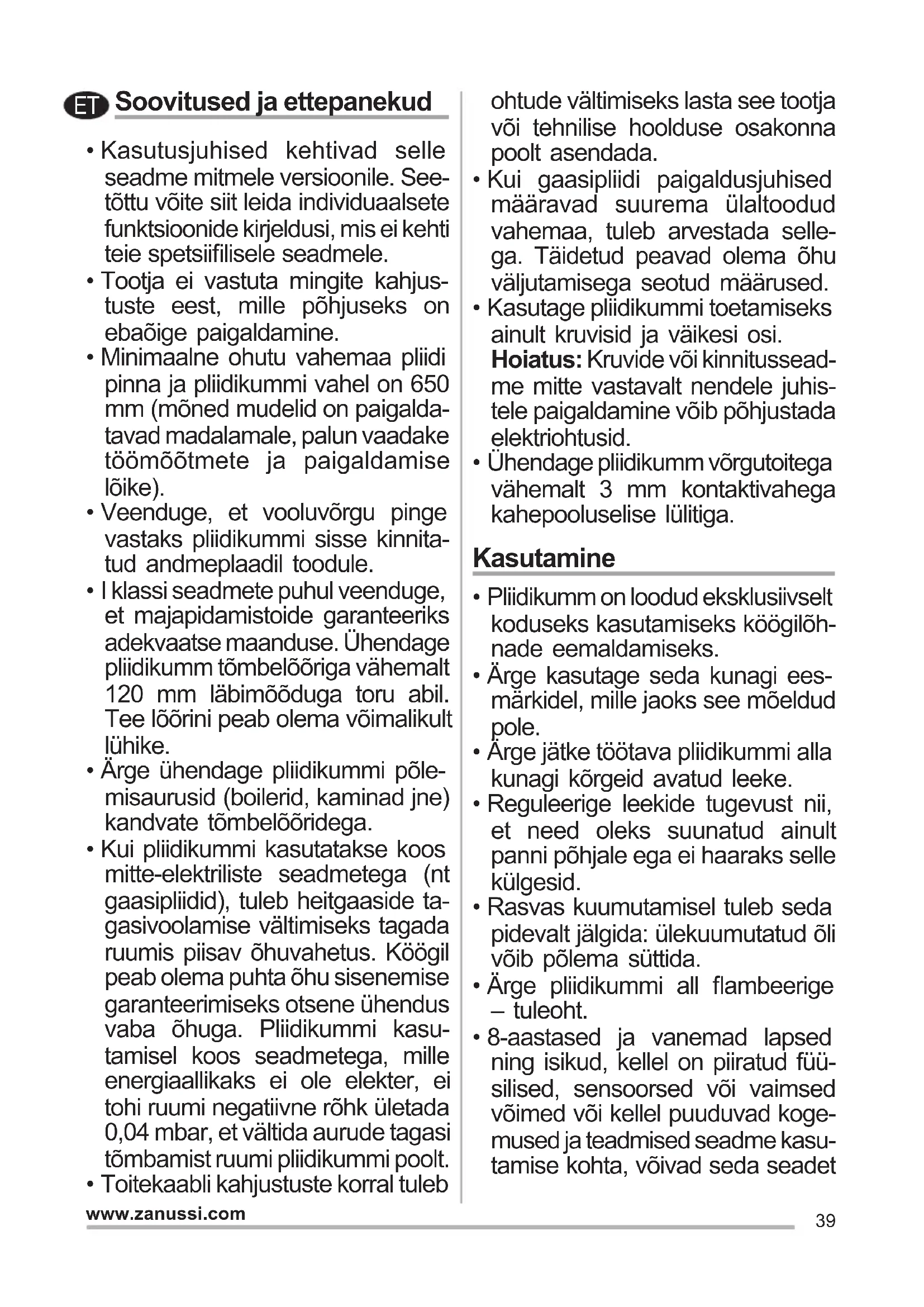 - 8-aastased ja vanemad lapsed ning isikud, kellel on piiratud füü- silised, sensoorsed või vaimsed võimed või kellel puuduvad koge- mused ja teadmised seadme kasu- tamise kohta, võivad seda seadet ET40 www.zanussi.com kasutada, kui neid jälgitakse või juhendatakse seadme ohutul kasutamisel ning nad mõistavad sellega seotud ohtusid. Lapsed ei tohi seadmega mängida. Puhasta- mist ja kasutajapoolset hooldust ei tohi teostada järelevalveta lapsed.