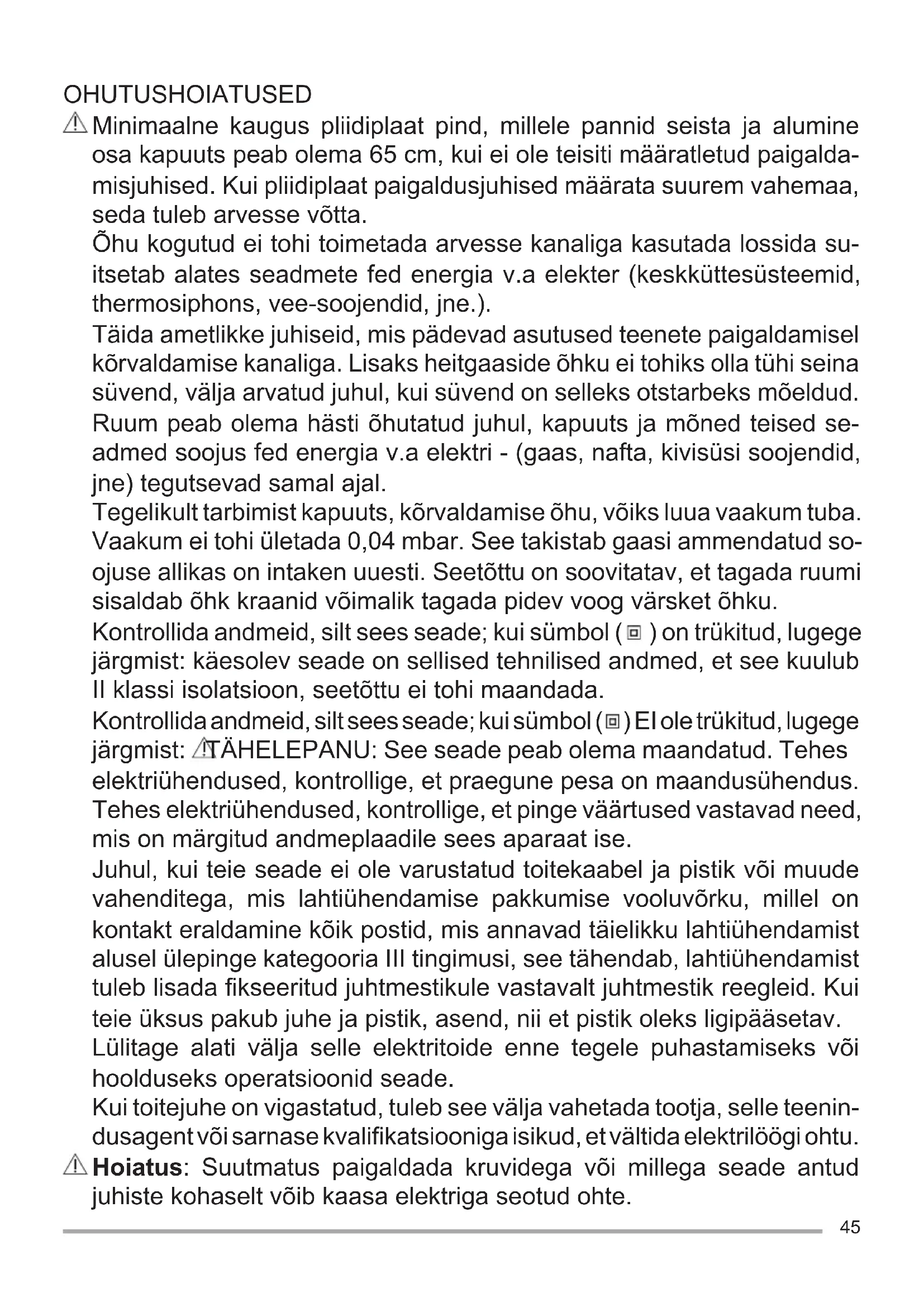 Модели KHB60460XA, KHB90460XA: Внимание! Прежде прикасанием к лампочкам, убедитесь, что они остыли. Заменить на лампы того же типа (ø35, E14, 4W). Модели KHB62650XA, KHB92650XA: Если рефлектор поврежден, его может заменить только производитель, его специалист по техническому обслуживанию или аналогичный специалист во избежание опасности. ILCOS D code: DRBB/F-4-220-E14-37/10545 OHUTUSHOIATUSED Minimaalne kaugus pliidiplaat pind, millele pannid seista ja alumine osa kapuuts peab olema 65 cm, kui ei ole teisiti määratletud paigalda- misjuhised. Kui pliidiplaat paigaldusjuhised määrata suurem vahemaa, seda tuleb arvesse võtta. Õhu kogutud ei tohi toimetada arvesse kanaliga kasutada lossida su- itsetab alates seadmete fed energia v.a elekter (keskküttesüsteemid, thermosiphons, vee-soojendid, jne.). Täida ametlikke juhiseid, mis pädevad asutused teenete paigaldamisel kõrvaldamise kanaliga. Lisaks heitgaaside õhku ei tohiks olla tühi seina süvend, välja arvatud juhul, kui süvend on selleks otstarbeks mõeldud. Ruum peab olema hästi õhutatud juhul, kapuuts ja mõned teised se- admed soojus fed energia v.a elektri - (gaas, nafta, kivisüsi soojendid, jne) tegutsevad samal ajal. Tegelikult tarbimist kapuuts, kõrvaldamise õhu, võiks luua vaakum tuba. Vaakum ei tohi ületada 0,04 mbar. See takistab gaasi ammendatud so- ojuse allikas on intaken uuesti. Seetõttu on soovitatav, et tagada ruumi sisaldab õhk kraanid võimalik tagada pidev voog värsket õhku. Kontrollida andmeid, silt sees seade; kui sümbol ( ) on trükitud, lugege järgmist: käesolev seade on sellised tehnilised andmed, et see kuulub II klassi isolatsioon, seetõttu ei tohi maandada. Kontrollida andmeid, silt sees seade; kui sümbol ( ) EI ole trükitud, lugege järgmist: TÄHELEPANU: See seade peab olema maandatud. Tehes elektriühendused, kontrollige, et praegune pesa on maandusühendus. Tehes elektriühendused, kontrollige, et pinge väärtused vastavad need, mis on märgitud andmeplaadile sees aparaat ise. Juhul, kui teie seade ei ole varustatud toitekaabel ja pistik või muude vahenditega, mis lahtiühendamise pakkumise vooluvõrku, millel on kontakt eraldamine kõik postid, mis annavad täielikku lahtiühendamist alusel ülepinge kategooria III tingimusi, see tähendab, lahtiühendamist tuleb lisada fi kseeritud juhtmestikule vastavalt juhtmestik reegleid. Kui teie üksus pakub juhe ja pistik, asend, nii et pistik oleks ligipääsetav. Lülitage alati välja selle elektritoide enne tegele puhastamiseks või hoolduseks operatsioonid seade. Kui toitejuhe on vigastatud, tuleb see välja vahetada tootja, selle teenin- dusagent või sarnase kvalifi katsiooniga isikud, et vältida elektrilöögi ohtu. Hoiatus: Suutmatus paigaldada kruvidega või millega seade antud juhiste kohaselt võib kaasa elektriga seotud ohte.46 KASUTAMINE