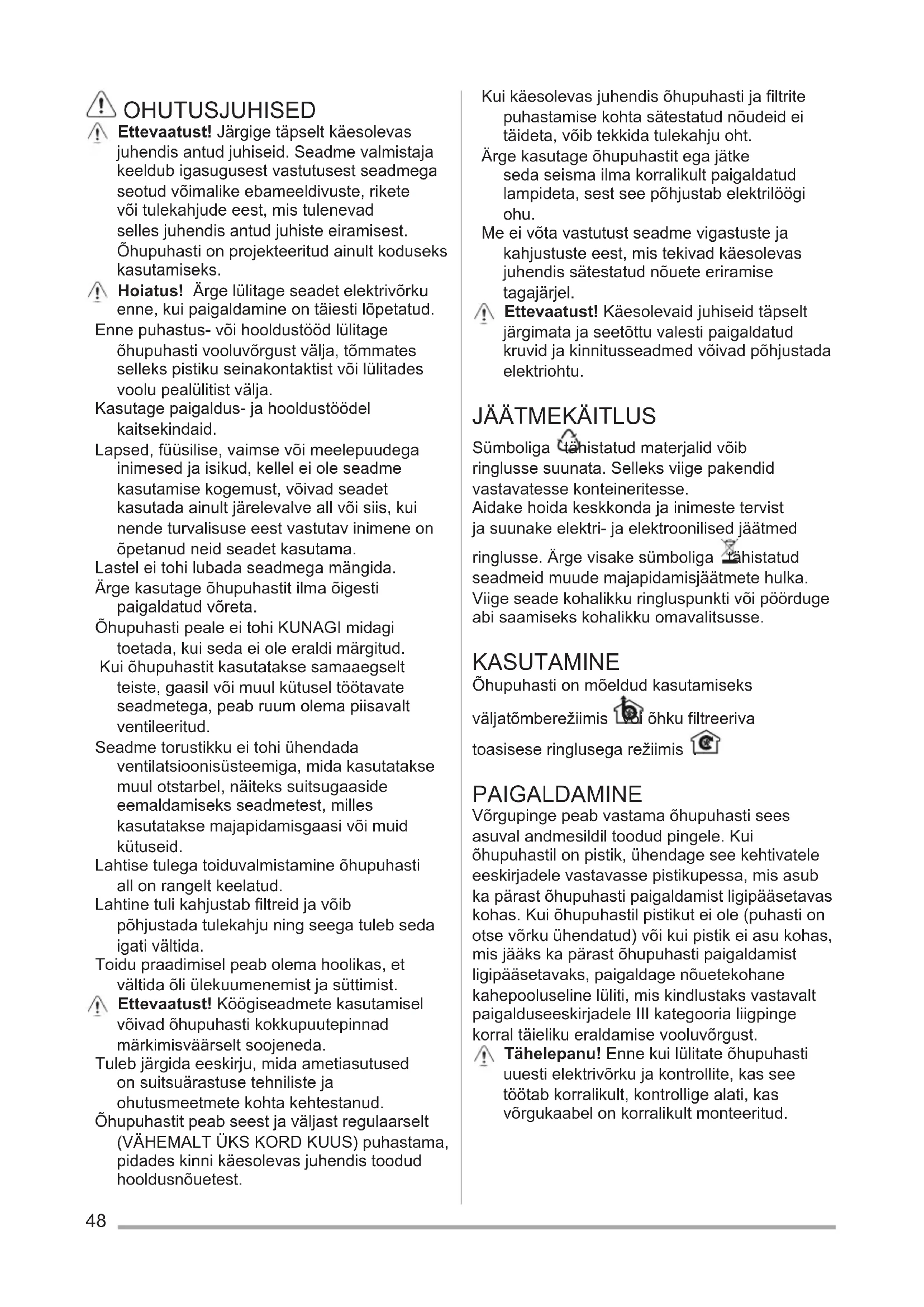 Sümboliga tähistatud materjalid võib ringlusse suunata. Selleks viige pakendid vastavatesse konteineritesse. Aidake hoida keskkonda ja inimeste tervist ja suunake elektri- ja elektroonilised jäätmed ringlusse. Ärge visake sümboliga tähistatud seadmeid muude majapidamisjäätmete hulka. Viige seade kohalikku ringluspunkti või pöörduge abi saamiseks kohalikku omavalitsusse. KASUTAMINE Õhupuhasti on mõeldud kasutamiseks väljatõmberežiimis või õhku filtreeriva toasisese ringlusega režiimis . PAIGALDAMINE Võrgupinge peab vastama õhupuhasti sees asuval andmesildil toodud pingele. Kui õhupuhastil on pistik, ühendage see kehtivatele eeskirjadele vastavasse pistikupessa, mis asub ka pärast õhupuhasti paigaldamist ligipääsetavas kohas. Kui õhupuhastil pistikut ei ole (puhasti on otse võrku ühendatud) või kui pistik ei asu kohas, mis jääks ka pärast õhupuhasti paigaldamist ligipääsetavaks, paigaldage nõuetekohane kahepooluseline lüliti, mis kindlustaks vastavalt paigalduseeskirjadele III kategooria liigpinge korral täieliku eraldamise vooluvõrgust. Tähelepanu! Enne kui lülitate õhupuhasti uuesti elektrivõrku ja kontrollite, kas see töötab korralikult, kontrollige alati, kas võrgukaabel on korralikult monteeritud.49 Minimaalne vahekaugus pliidi pinna ja köögi õhupuhasti alumise ääre vahel ei tohi elektripliidi puhul olla väiksem kui 50cm ning gaasi- või kombineeritud pliidi puhul väiksem kui 65cm. Kui gaasipliidi paigaldusjuhendis nõutakse suuremat vahekaugust, tuleb seda arvesse võtta. HOOLDUS Enne hooldustöid võtke õhupuhasti vooluvõrgust välja. Õhupuhastit tuleb sageli (vähemalt sama tihti, kui hooldatakse rasvafiltreid) nii seest kui ka väljast puhastada. Puhastamiseks kasutage neutraalse vedela puhastusvahendiga niisutatud lappi. Vältige abrasiivseid aineid sisaldavaid vahendeid.