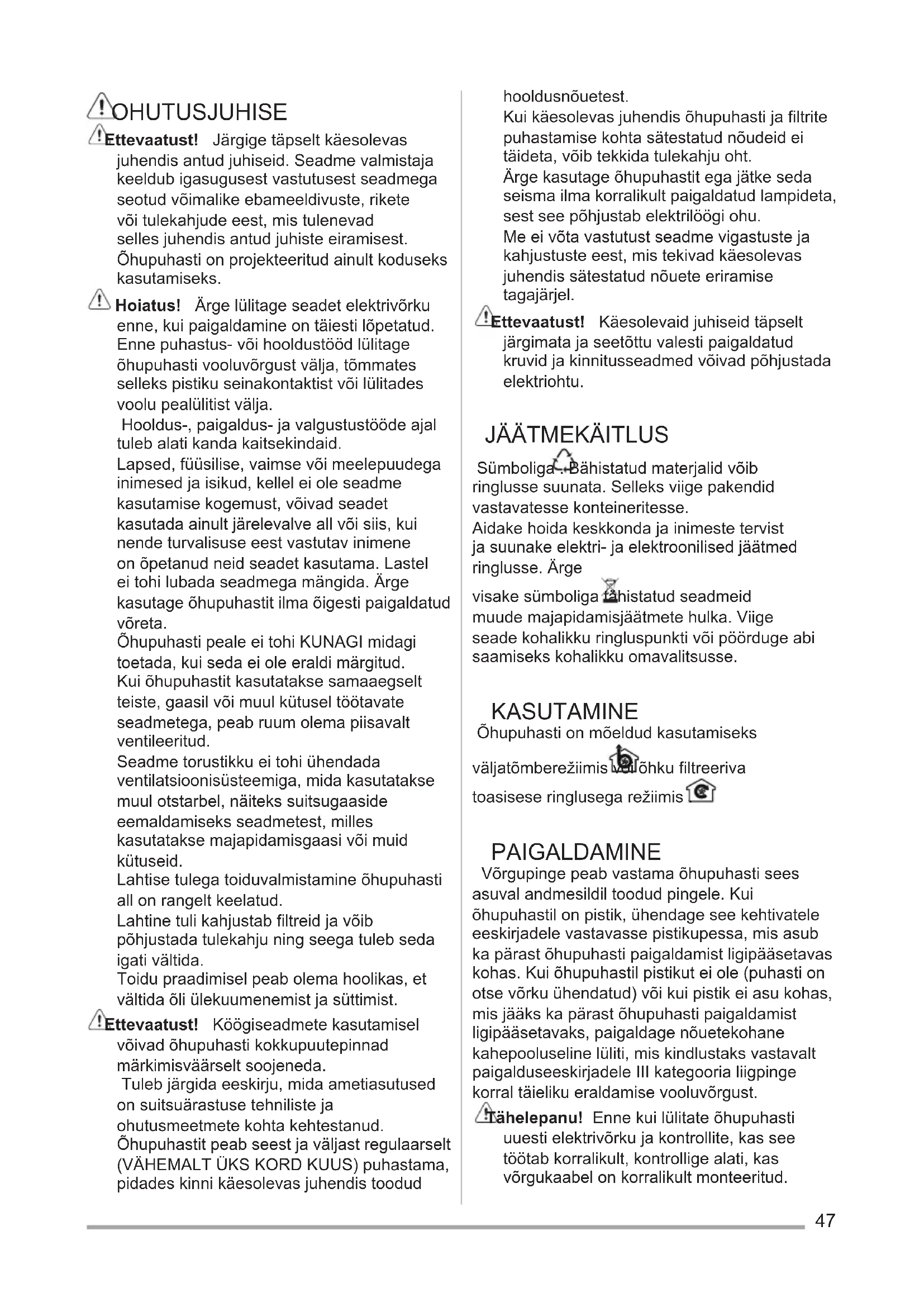 Sümboliga . Bähistatud materjalid võib ringlusse suunata. Selleks viige pakendid vastavatesse konteineritesse. Aidake hoida keskkonda ja inimeste tervist ja suunake elektri- ja elektroonilised jäätmed ringlusse. Ärge visake sümboliga tähistatud seadmeid muude majapidamisjäätmete hulka. Viige seade kohalikku ringluspunkti või pöörduge abi saamiseks kohalikku omavalitsusse. KASUTAMINE Õhupuhasti on mõeldud kasutamiseks väljatõmberežiimis või õhku filtreeriva toasisese ringlusega režiimis . PAIGALDAMINE Võrgupinge peab vastama õhupuhasti sees asuval andmesildil toodud pingele. Kui õhupuhastil on pistik, ühendage see kehtivatele eeskirjadele vastavasse pistikupessa, mis asub ka pärast õhupuhasti paigaldamist ligipääsetavas kohas. Kui õhupuhastil pistikut ei ole (puhasti on otse võrku ühendatud) või kui pistik ei asu kohas, mis jääks ka pärast õhupuhasti paigaldamist ligipääsetavaks, paigaldage nõuetekohane kahepooluseline lüliti, mis kindlustaks vastavalt paigalduseeskirjadele III kategooria liigpinge korral täieliku eraldamise vooluvõrgust. Tähelepanu! Enne kui lülitate õhupuhasti uuesti elektrivõrku ja kontrollite, kas see töötab korralikult, kontrollige alati, kas võrgukaabel on korralikult monteeritud.48 Minimaalne vahekaugus pliidi pinna ja köögi õhupuhasti alumise ääre vahel ei tohi elektripliidi puhul olla väiksem kui 43cm ning gaasi- või kombineeritud pliidi puhul väiksem kui 65cm. Kui gaasipliidi paigaldusjuhendis nõutakse suuremat vahekaugust, tuleb seda arvesse võtta. HOOLDUS Enne hooldustöid võtke õhupuhasti vooluvõrgust välja. Õhupuhastit tuleb sageli (vähemalt sama tihti, kui hooldatakse rasvafiltreid) nii seest kui ka väljast puhastada. Puhastamiseks kasutage neutraalse vedela puhastusvahendiga niisutatud lappi. Vältige abrasiivseid aineid sisaldavaid vahendeid.