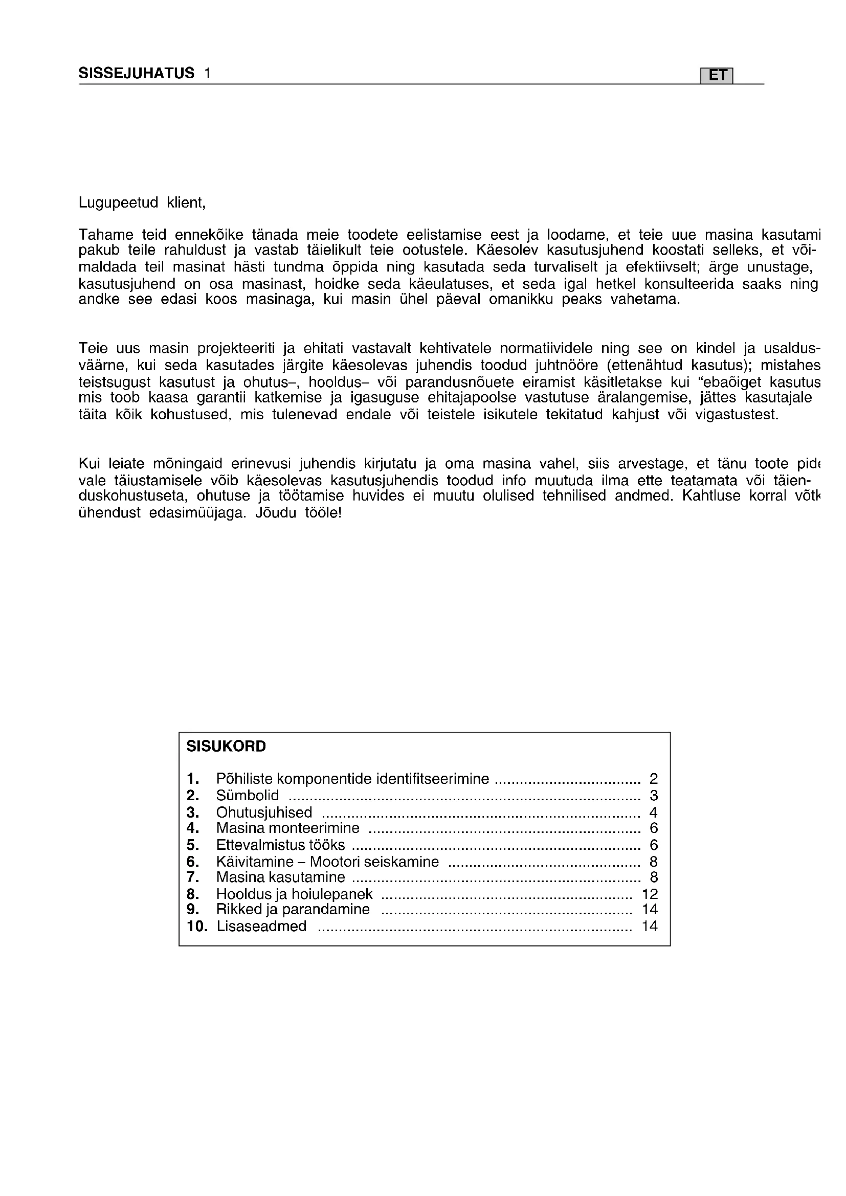 Инчове / мм Kод Kод 3/8” 16” / 40 cm 0,050” / 1,3 mm 123900368/0 4113765ET SISSEJUHATUS 1 Lugupeetud klient, Tahame teid ennekõike tänada meie toodete eelistamise eest ja loodame, et teie uue masina kasutamine pakub teile rahuldust ja vastab täielikult teie ootustele. Käesolev kasutusjuhend koostati selleks, et või- maldada teil masinat hästi tundma õppida ning kasutada seda turvaliselt ja efektiivselt; ärge unustage, et kasutusjuhend on osa masinast, hoidke seda käeulatuses, et seda igal hetkel konsulteerida saaks ning andke see edasi koos masinaga, kui masin ühel päeval omanikku peaks vahetama. Teie uus masin projekteeriti ja ehitati vastavalt kehtivatele normatiividele ning see on kindel ja usaldus- väärne, kui seda kasutades järgite käesolevas juhendis toodud juhtnööre (ettenähtud kasutus); mistahes teistsugust kasutust ja ohutus–, hooldus– või parandusnõuete eiramist käsitletakse kui “ebaõiget kasutust”, mis toob kaasa garantii katkemise ja igasuguse ehitajapoolse vastutuse äralangemise, jättes kasutajale täita kõik kohustused, mis tulenevad endale või teistele isikutele tekitatud kahjust või vigastustest. Kui leiate mõningaid erinevusi juhendis kirjutatu ja oma masina vahel, siis arvestage, et tänu toote pide- vale täiustamisele võib käesolevas kasutusjuhendis toodud info muutuda ilma ette teatamata või täien- duskohustuseta, ohutuse ja töötamise huvides ei muutu olulised tehnilised andmed. Kahtluse korral võtke ühendust edasimüüjaga. Jõudu tööle! SISUKORD