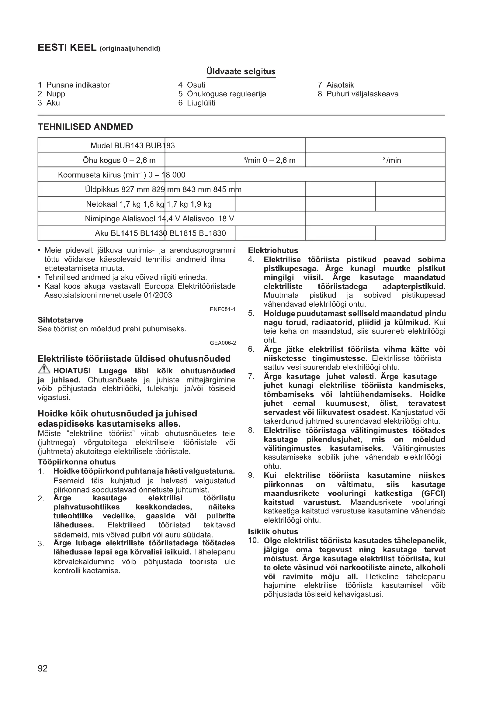 Laadige alla juhend oma Lehepuhuri PDF-formaadis tasuta! Leidke oma juhend BUB143 - MAKITA ja võtke oma elektrooniline seade uuesti kätte. Sellel lehel on avaldatud kõik teie seadme kasutamiseks vajalikud dokumendid. BUB143 kaubamärgi MAKITA.