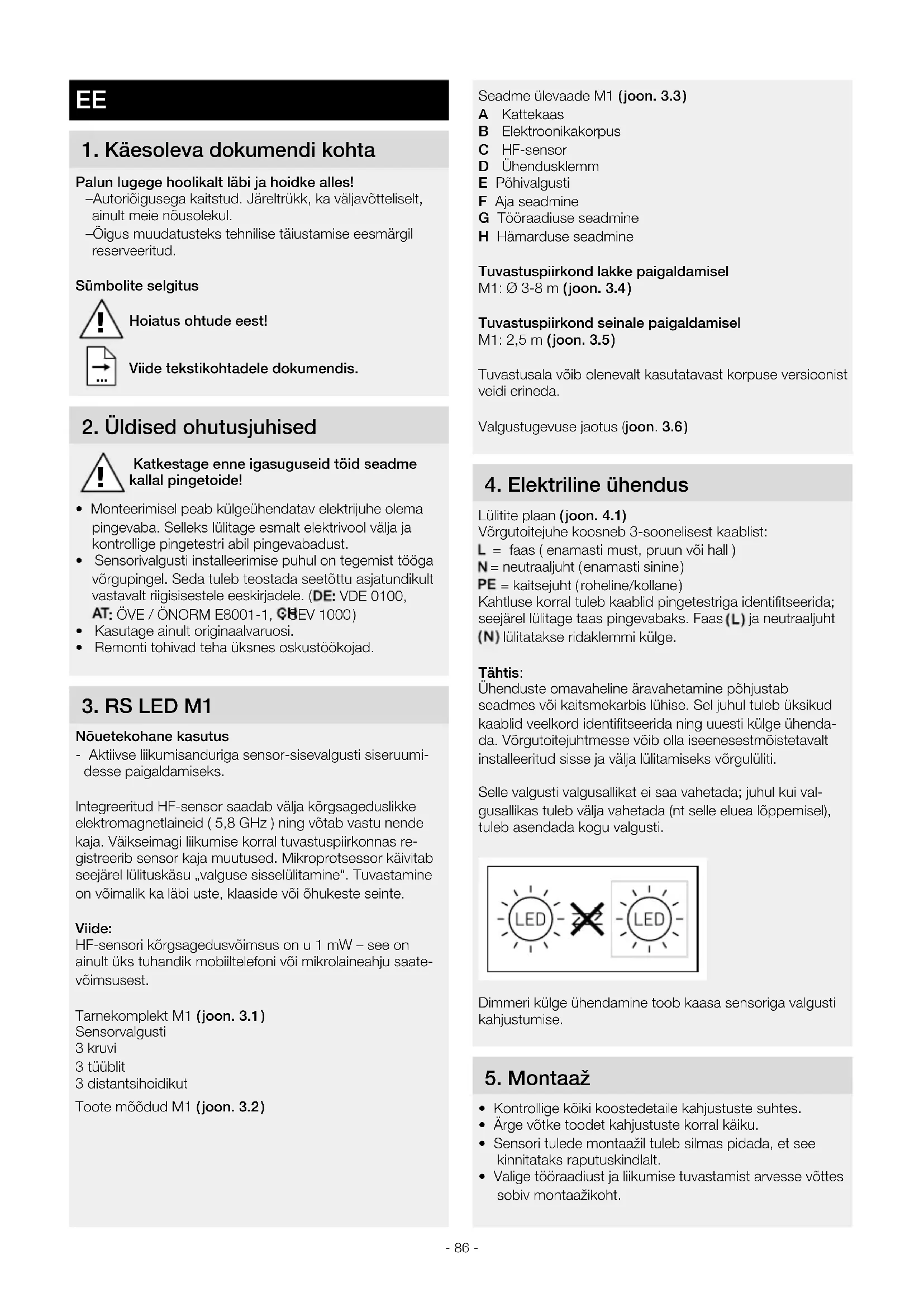 Nõuetekohane kasutus - Aktiivse liikumisanduriga sensor-sisevalgusti siseruumi- desse paigaldamiseks. Integreeritud HF-sensor saadab välja kõrgsageduslikke elektromagnetlaineid ( 5,8 GHz ) ning võtab vastu nende kaja. Väikseimagi liikumise korral tuvastuspiirkonnas re- gistreerib sensor kaja muutused. Mikroprotsessor käivitab seejärel lülituskäsu „valguse sisselülitamine“. Tuvastamine on võimalik ka läbi uste, klaaside või õhukeste seinte. Viide: HF-sensori kõrgsagedusvõimsus on u 1 mW – see on ainult üks tuhandik mobiiltelefoni või mikrolaineahju saate- võimsusest. Tarnekomplekt M1 ( joon.3.1 ) Sensorvalgusti 3 kruvi 3 tüüblit 3 distantsihoidikut Toote mõõdud M1 ( joon.3.2 ) !- 87 - Montaažisammud