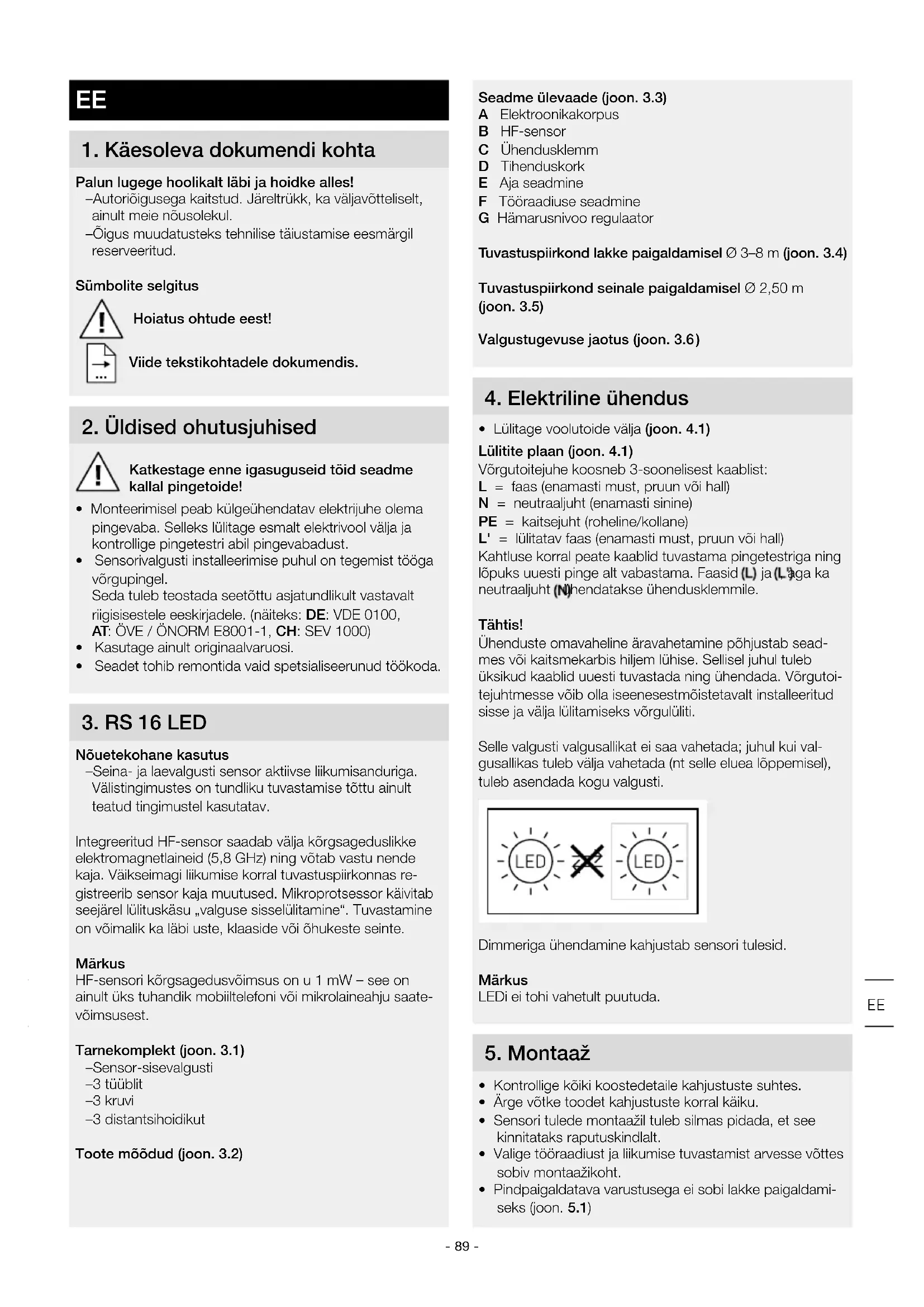 Nõuetekohane kasutus – Seina- ja laevalgusti sensor aktiivse liikumisanduriga. Välistingimustes on tundliku tuvastamise tõttu ainult teatud tingimustel kasutatav. Integreeritud HF-sensor saadab välja kõrgsageduslikke elektromagnetlaineid (5,8 GHz) ning võtab vastu nende kaja. Väikseimagi liikumise korral tuvastuspiirkonnas re- gistreerib sensor kaja muutused. Mikroprotsessor käivitab seejärel lülituskäsu „valguse sisselülitamine“. Tuvastamine on võimalik ka läbi uste, klaaside või õhukeste seinte. Märkus HF-sensori kõrgsagedusvõimsus on u 1 mW – see on ainult üks tuhandik mobiiltelefoni või mikrolaineahju saate- võimsusest. Tarnekomplekt (joon. 3.1) – Sensor-sisevalgusti – 3 tüüblit – 3 kruvi – 3 distantsihoidikut Toote mõõdud (joon. 3.2) EE- 90 -Montaažisammud• Eemaldage kattepaneel korpuse küljest (joon. 5.2)• Märkige puuravad (joon. 5.3)• Puurige avad ja pange tüüblid sisse (joon. 5.4)• Torgake võrgutoitejuhtme tihenduskork läbi (joon. 5.5)• Süvistatud sisendjuhe (joon. 5.6)• Koos pindpaigalduse vahehoidikutega (joon. 5.7)• Ühendage ühenduskaabel külge (joon. 5.8)• Lülitage voolutoide sisse (joon. 5.9)• Teostage seaded ➜ "6. Funktsioon"• Paigaldage kattepaneel (joon. 5.9)6. FunktsioonTehaseseadistusedHämaruse seadmine: 2000 lxAja seadistamine: 5sekTööraadiuse seadmine: 8mPärast korpuse monteerimist ja võrguühenduse teostamist saab sensorvalgusti töösse võtta. Kui valgusti valgustuslüliti kaudu manuaalselt töösse võtta, siis lülitub ta paikamõõt-misfaasiks 10sek möödudes välja ja on seejärel sensorirežiimi jaoks aktiivne. Valgustuslüliti uuesti vajutamine pole vajalik.Seaderegulaator (joon. 6.1)Aja seadmine (öine tööaeg) (joon. 6.2/E)Valgustil soovitud valgustuskestust saab u 5sek kuni 15min vahemikus sujuvalt muuta. Enne selle aja möö-dumist käivitatakse taimer iga tuvastatud liikumisega uuesti.Märkus Uute liikumiste tuvastamine on pärast valgusti igakordset väljalülitustoimingut u 1sek katkestatud. Alles selle aja möödumisel saab valgusti liikumisega uuesti sisse lülitada.Tuvastuspiirkonna seadmisel ja talitlustesti läbiviimisel soovitatakse seadistada lühim aeg.Tööraadiuse seadistamine (tundlikkus) (joon. 6.2/F)Mõiste tööraadius all peetakse silmas umbes ringikujulise diameetriga tuvastuspiirkonda maapinnal, mis tekib valgusti monteerimisel 2,5m kõrgusele. – Seaderegulaator maksimaalne = max tööraadius 8m – Seaderegulaator minimaalne = min tööraadius 3mHämarusnivoo regulaator (reaktsiooni lävi) (joon. 6.2/G)Valgustil soovitud rakendumisläve saab seada u 2 kuni 2000 lx. – Seaderegulaator asendis = päevavalgusrežiim (sõltub heledusest) – Seaderegulaatori asend = hämarusrežiim (u 2 lx)Tuvastuspiirkonna seadmisel ja päevavalguses talitlustesti läbiviimisel peab seaderegulaator peal paiknema.Pidevvalgustuse funktsioonKui võrgutoitejuhtmesse monteeritakse valikuline võrgulüliti, siis on peale lihtsa sisse- ja väljalülitamise võimalikud ka järgmised funktsioonid.Pidevvalgustusrežiim (joon. 6.3)1) Pidevvalgustuse sisselülitamine:lüliti 2×VÄLJA ja SISSE. Valgusti seatakse 4 tunniks püsivalgustusele. Seejärel läheb see automaatselt sensori-režiimile tagasi.2) Pidevvalgustuse väljalülitamine: lüliti 1×VÄLJA ja SISSE. Valgusti lülitub välja või läheb üle sensorirežiimile.Tähtis!Lülitamine peab toimuma vahemikus 0,2–1 s.7. UtiliseerimineElektriseadmed, lisatarvikud ja pakendid tuleb suunata keskkonnateadlikku taaskasutusse.Ärge visake elektriseadmeid olmejäätmete hulka!Ainult ELi riikideleVastavalt vanu elektri- ja elektroonikaseadmeid puudutavale kehtivale Euroopa määrusele ja selle rakendamisele rahvus-vahelises õiguses tuleb kasutuskõlbmatud elektriseadmed koguda eraldi ning suunata keskkonnateadlikku taaskasu-tusse.Tähtis! Juhtimisseade ei ole vahetatav.8. Tootja garantiiSteineli toode on valmistatud suurima hoolikusega, on talit-luslikult ja ohutusalaselt kehtivate eeskirjade alusel kontrol-litud ning seejärel läbinud pistelise kontrolli. Steinel annab garantii toote laitmatu kvaliteedi ja töökorras oleku kohta. Garantiiaeg on 36 kuud ja see algab tarbijale toote ostmise päevast. Meie remondime materjalist või tootmisvigadest tulenevad puudused, garantiijuhtumi korral seade kas re-monditakse või puudulik osa asendatakse uuega, valiku üle otsustame meie. Garantii ei kehti kuluvate osade ning kah-ju ja puuduste kohta, mis on tekkinud oskamatu käsitsemi-se või hoolduse tagajärjel. Edasised võõresemetele põhjus-tatud järgkahjud on välistatud.Garantiinõuet aktsepteeritakse ainult siis, kui osandama-ta seade saadetakse koos vea lühikirjelduse, kassatšeki või arvega (ostukuupäev ja müüja tempel) ja korralikult pakituna vastavasse teeninduspunkti.RemonditeenusPärast garantiiaja lõppu või puuduste korral, millele garantii ei kehti, küsige parandamisvõimaluste kohta lähimast tee-nindusjaamast järele. TOOTJA