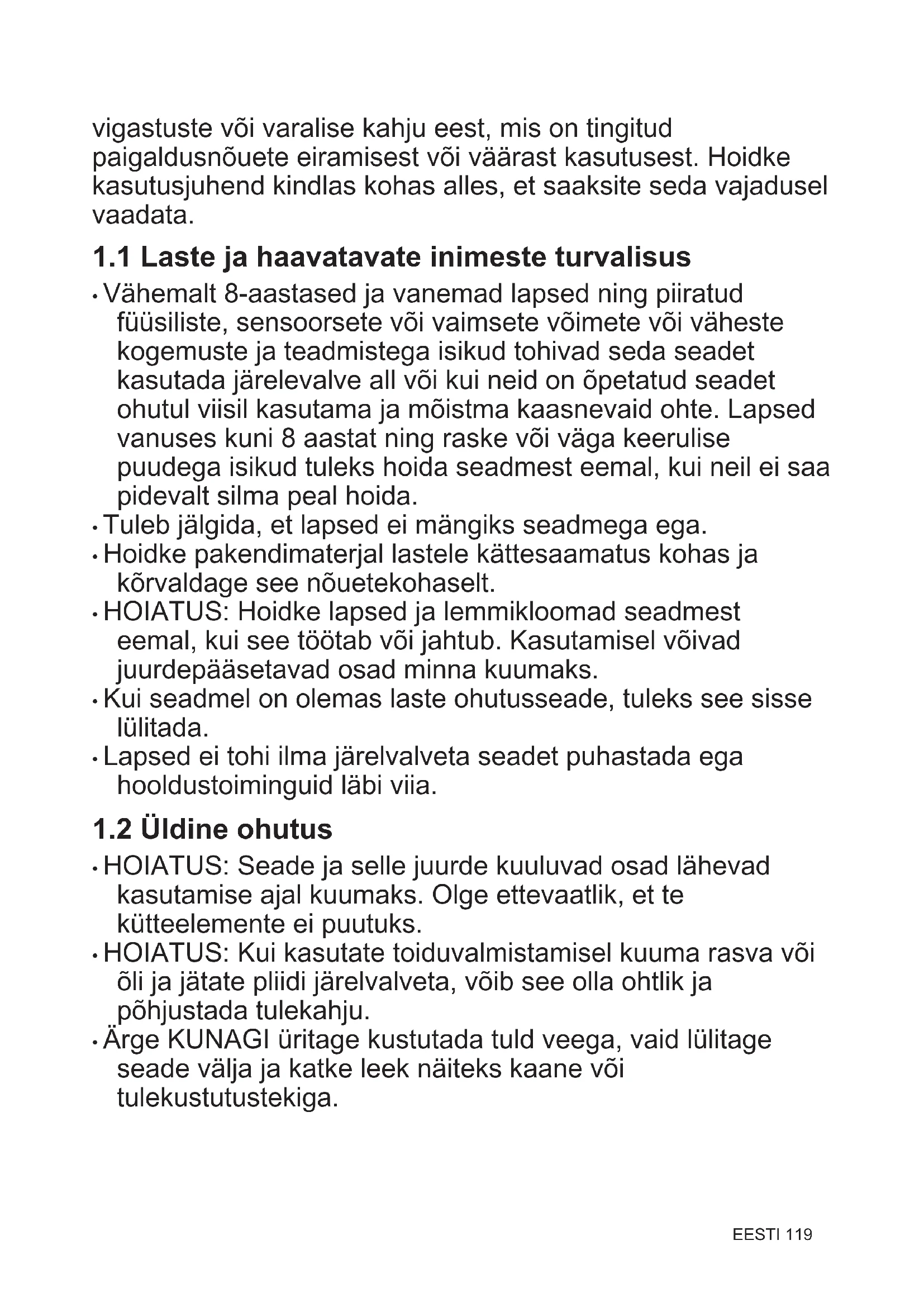 - Vähemalt 8-aastased ja vanemad lapsed ning piiratud füüsiliste, sensoorsete või vaimsete võimete või väheste kogemuste ja teadmistega isikud tohivad seda seadet kasutada järelevalve all või kui neid on õpetatud seadet ohutul viisil kasutama ja mõistma kaasnevaid ohte. Lapsed vanuses kuni 8 aastat ning raske või väga keerulise puudega isikud tuleks hoida seadmest eemal, kui neil ei saa pidevalt silma peal hoida.