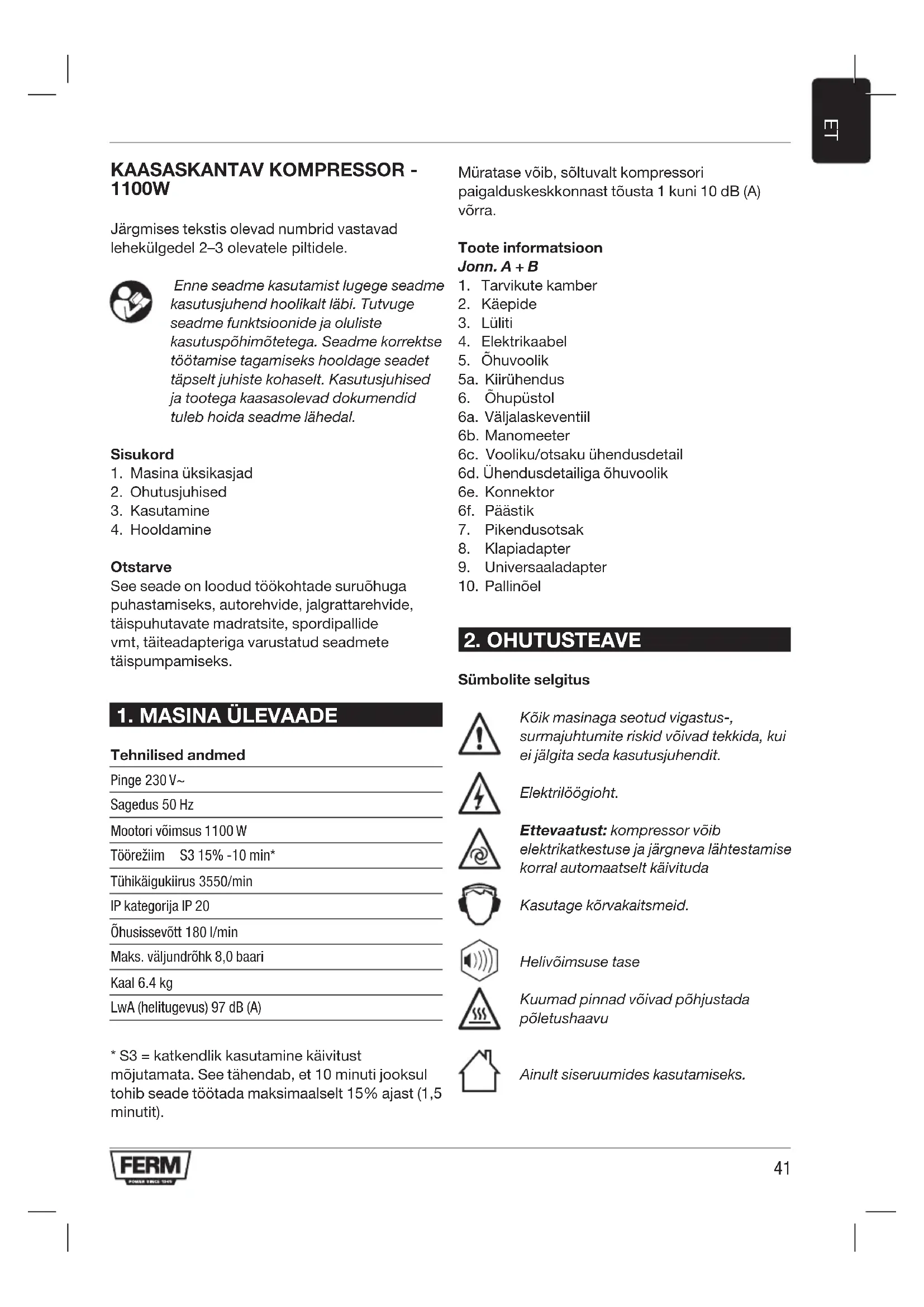 KAASASKANTAV KOMPRESSOR - 1100W Järgmises tekstis olevad numbrid vastavad lehekülgedel 2–3 olevatele piltidele. Enne seadme kasutamist lugege seadme kasutusjuhend hoolikalt läbi. Tutvuge seadme funktsioonide ja oluliste kasutuspõhimõtetega. Seadme korrektse töötamise tagamiseks hooldage seadet täpselt juhiste kohaselt. Kasutusjuhised ja tootega kaasasolevad dokumendid tuleb hoida seadme lähedal. Sisukord
