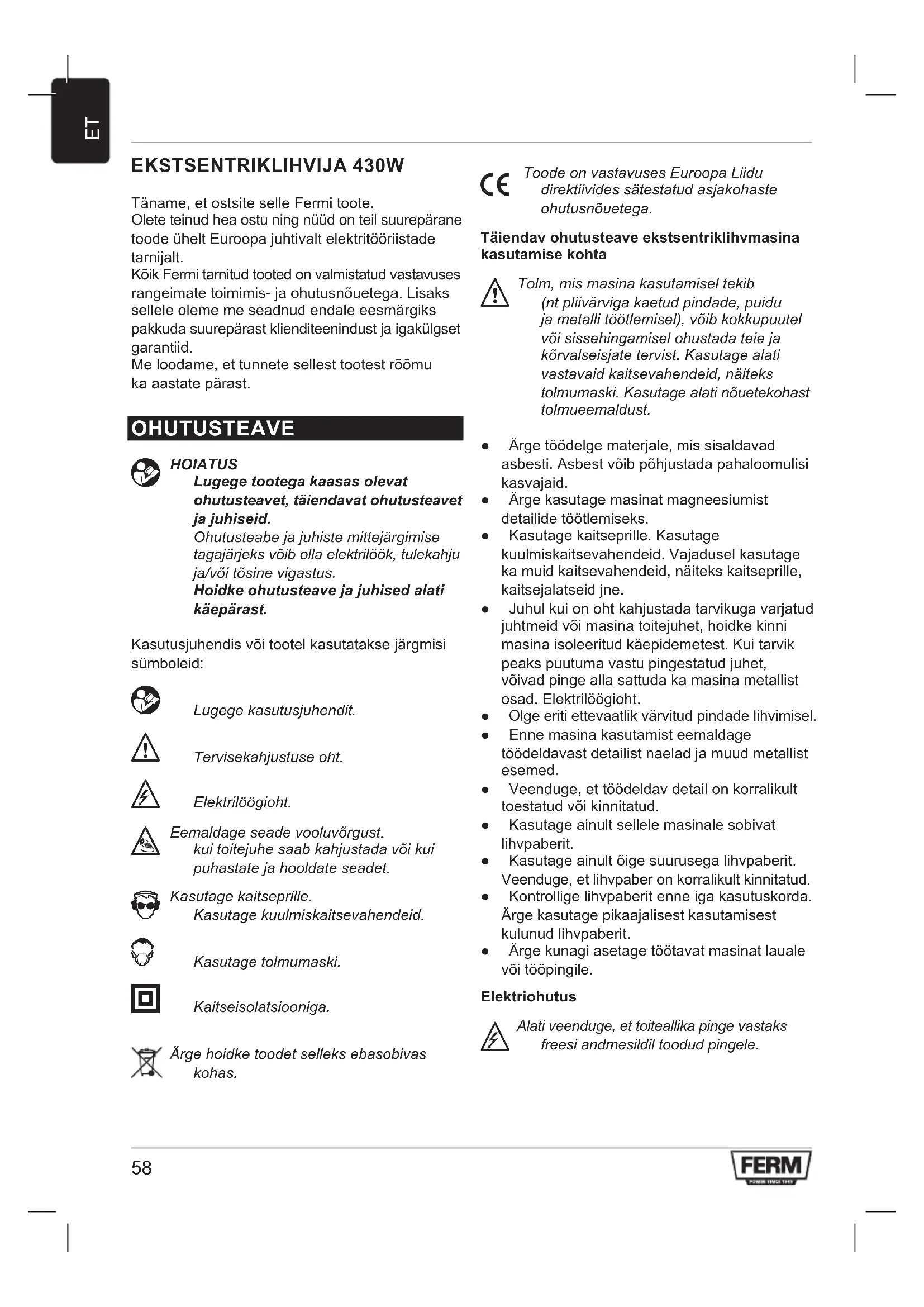 EKSTSENTRIKLIHVIJA 430W Täname,etostsiteselleFermitoote. Oleteteinudheaostuningnüüdonteilsuurepärane toodeüheltEuroopajuhtivaltelektritööriistade tarnijalt. KõikFermitarnitudtootedonvalmistatudvastavuses rangeimatetoimimis-jaohutusnõuetega.Lisaks selleleolememeseadnudendaleeesmärgiks pakkudasuurepärastklienditeenindustjaigakülgset garantiid. Meloodame,ettunnetesellesttootestrõõmu kaaastatepärast. OHUTUSTEAVE
