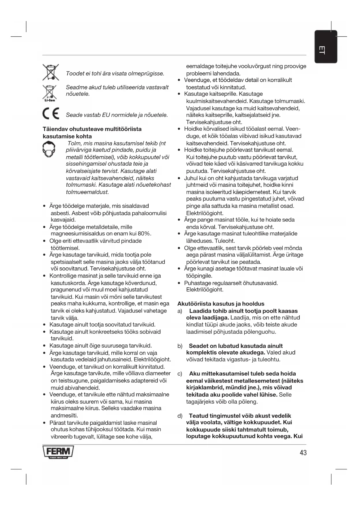ETToodet ei tohi ära visata olmeprügisse. Seadme akud tuleb utiliseerida vastavalt nõuetele. Seade vastab EU normidele ja nõuetele. Täiendav ohutusteave multitööriista kasutamise kohta Tolm, mis masina kasutamisel tekib (nt pliivärviga kaetud pindade, puidu ja metalli töötlemisel), võib kokkupuutel või sissehingamisel ohustada teie ja kõrvalseisjate tervist. Kasutage alati vastavaid kaitsevahendeid, näiteks tolmumaski. Kasutage alati nõuetekohast tolmueemaldust.