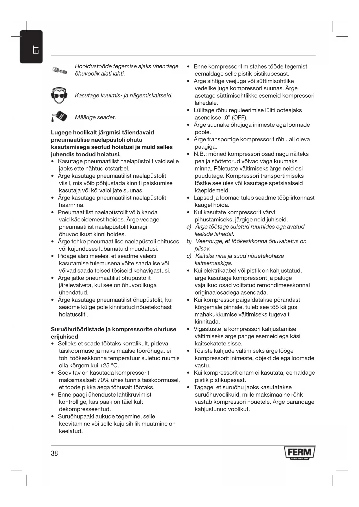 N.B.: möned kompressori osad nagu naiteks pea ja sööteturud vöivad väga kuumaks minna. Pöletuste vältimiseks arge neid osi puudutage. Kompressori transportimiseks tõstke see üles vöi kasutage spetsiaalseid käepidemeid. - Lapsed ja loomad tuleb seadme toöpiirkonnast kaugel hoida.