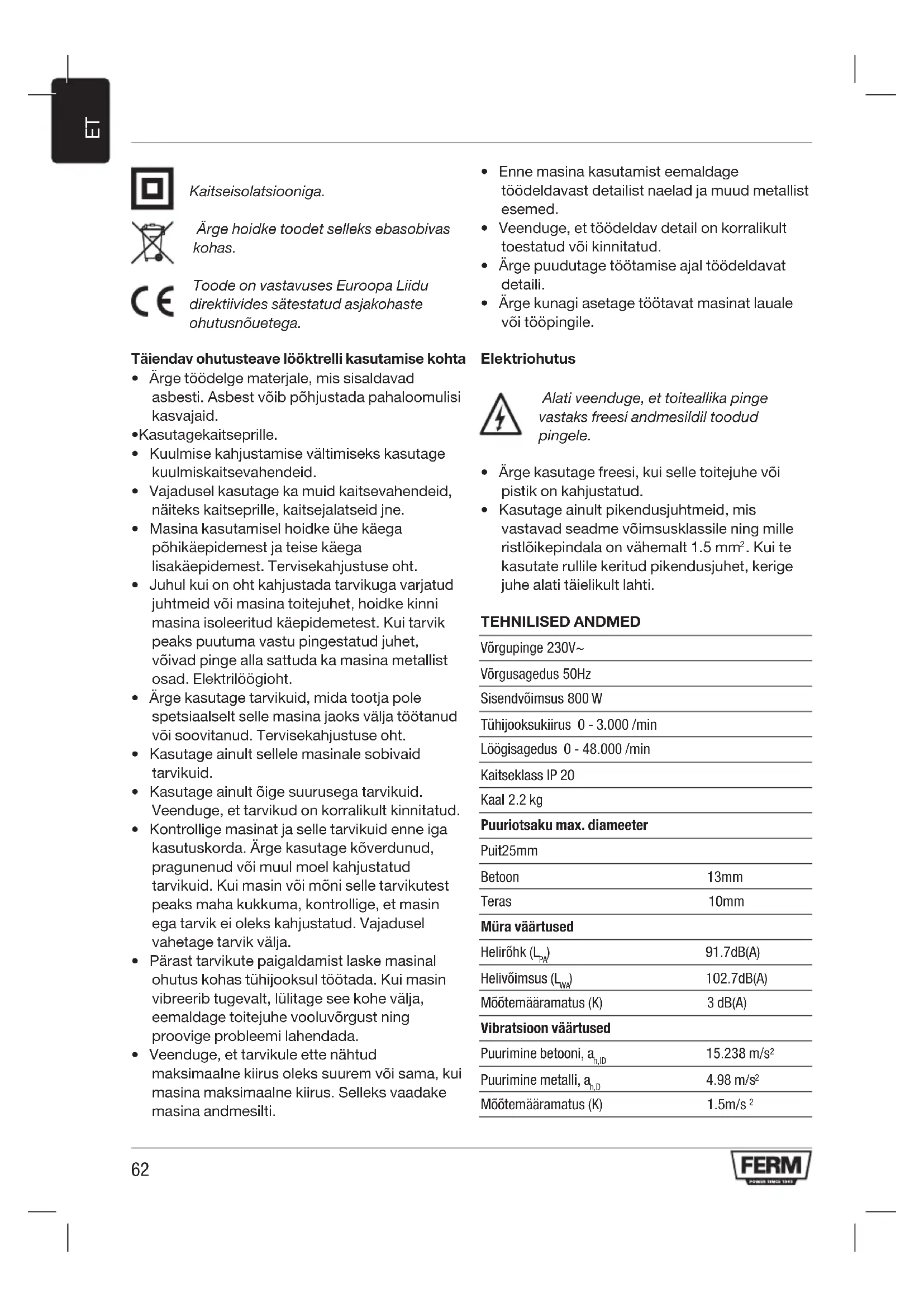 - Ebatäpsuste vältimiseks masina kasutamisel, puhastage padrunit ja puuriotsakut regulaarselt. GARANTII Tutvuge seadmega kaasas olevate garantiitingimustega. KESKKOND Kasutusest kõrvaldamine Toode, selle tarvikud ning pakend tuleb sorteerida, et tagada nende keskkonnasõbralik ringlussevõtt. Euroopa Ühenduse riigid Ärge visake elektritööriistu olmeprügi hulka. Vastavalt Euroopa Parlamendi ja nõukogu direktiivile 2012/19/EU elektri- ja elektroonikaseadmete jäätmete kohta ning vastavalt seda direktiivi rakendavatele riiklikele õigusaktidele tuleb kasutuskõlbmatud elektritööriistad koguda teistest jäätmetest eraldi ning kõrvaldada kasutusest keskkonnasõbralikul viisil. Toodet ja kasutusjuhendit võidakse muuta. Spetsifikatsioone võidakse muuta ilma eelneva etteteatamiseta.65