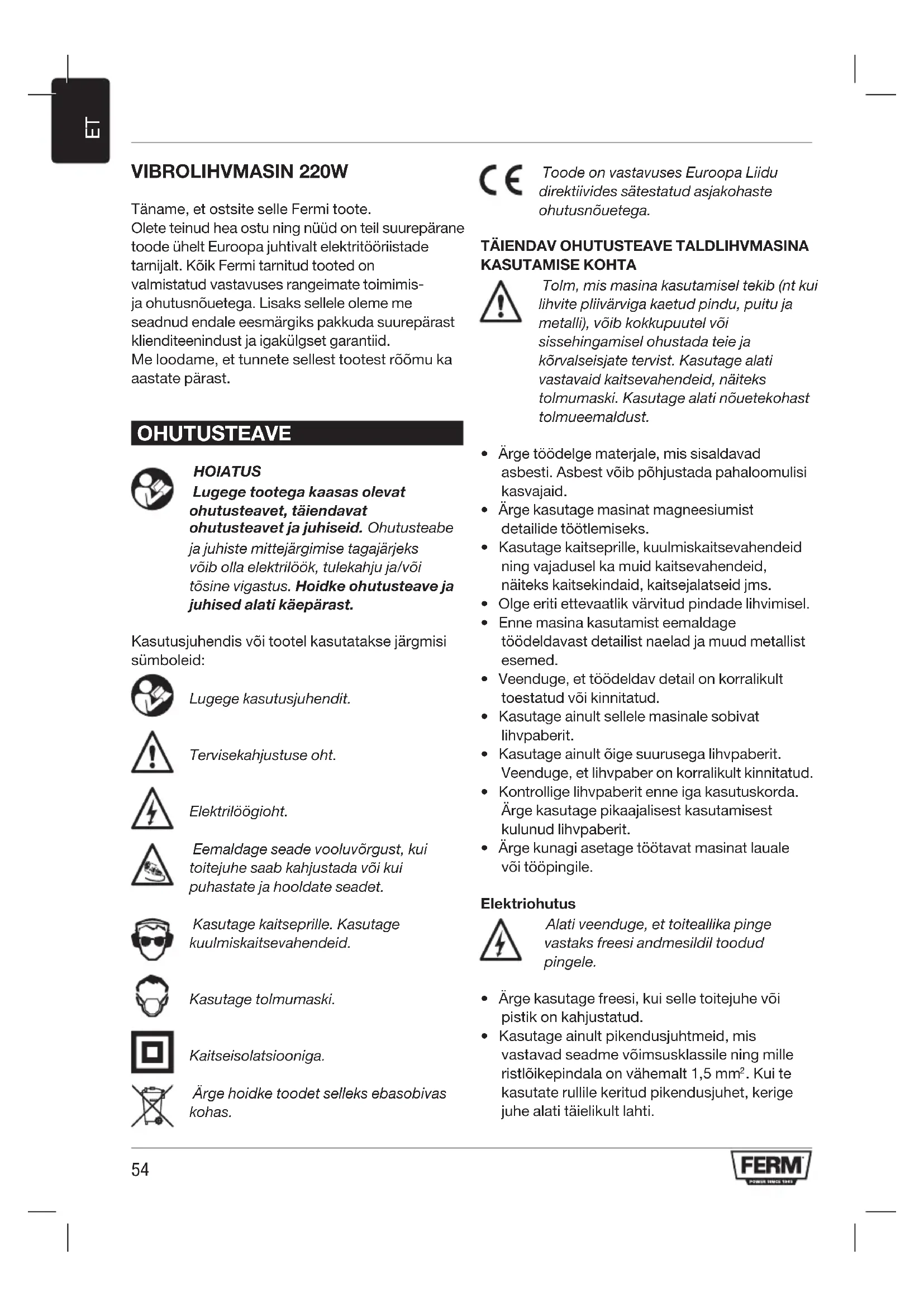 VIBROLIHVMASIN 220W Täname, et ostsite selle Fermi toote. Olete teinud hea ostu ning nüüd on teil suurepärane toode ühelt Euroopa juhtivalt elektritööriistade tarnijalt. Kõik Fermi tarnitud tooted on valmistatud vastavuses rangeimate toimimis- ja ohutusnõuetega. Lisaks sellele oleme me seadnud endale eesmärgiks pakkuda suurepärast klienditeenindust ja igakülgset garantiid. Me loodame, et tunnete sellest tootest rõõmu ka aastate pärast. OHUTUSTEAVE HOIATUS Lugege tootega kaasas olevat ohutusteavet, täiendavat ohutusteavet ja juhiseid. Ohutusteabe ja juhiste mittejärgimise tagajärjeks võib olla elektrilöök, tulekahju ja/või tõsine vigastus. Hoidke ohutusteave ja juhised alati käepärast. Kasutusjuhendis või tootel kasutatakse järgmisi sümboleid: Lugege kasutusjuhendit. Tervisekahjustuse oht. Elektrilöögioht. Eemaldage seade vooluvõrgust, kui toitejuhe saab kahjustada või kui puhastate ja hooldate seadet. Kasutage kaitseprille. Kasutage kuulmiskaitsevahendeid. Kasutage tolmumaski. Kaitseisolatsiooniga. Ärge hoidke toodet selleks ebasobivas kohas. Toode on vastavuses Euroopa Liidu direktiivides sätestatud asjakohaste ohutusnõuetega.