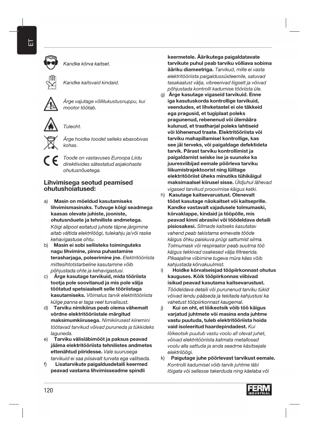 Lugege tootega kaasas olevat ohutusteavet, täiendavat ohutusteavet ja juhiseid. Ohutusteabe ja juhiste mittejärgimise tagajärjeks võib olla elektrilöök, tulekahju ja/või tõsine vigastus. Hoidke ohutusteave ja juhised alati käepärast. Kasutusjuhendis või tootel kasutatakse järgmisi sümboleid: Lugege kasutusjuhendit. Kõik masinaga seotud vigastus-, surmajuhtumite riskid võivad tekkida, kui ei jälgita seda kasutusjuhendit. Elektrilöögioht. Eemaldage seade vooluvõrgust, kui toitejuhe saab kahjustada või kui puhastate ja hooldate seadet. Lenduva prahi oht. Hoidke kõrvalised isikud tööalast eemal. Kandke silmade kaitset!120