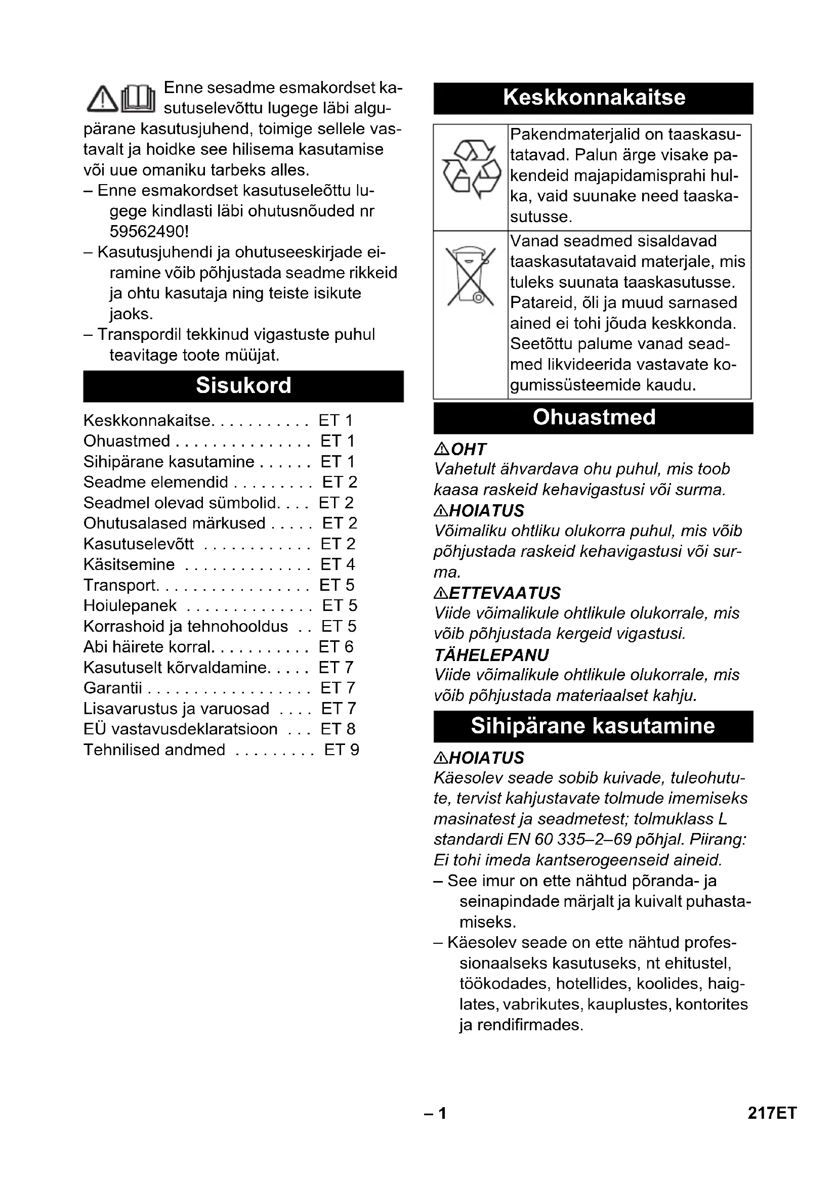 EU 297.534 7,5 м 216 BG– 1 Enne sesadme esmakordset ka- sutuselevõttu lugege läbi algu- pärane kasutusjuhend, toimige sellele vas- tavalt ja hoidke see hilisema kasutamise või uue omaniku tarbeks alles. – Enne esmakordset kasutuseleõttu lu- gege kindlasti läbi ohutusnõuded nr 59562490! – Kasutusjuhendi ja ohutuseeskirjade ei- ramine võib põhjustada seadme rikkeid ja ohtu kasutaja ning teiste isikute jaoks. – Transpordil tekkinud vigastuste puhul teavitage toote müüjat. OHT Vahetult ähvardava ohu puhul, mis toob kaasa raskeid kehavigastusi või surma. 몇 HOIATUS Võimaliku ohtliku olukorra puhul, mis võib põhjustada raskeid kehavigastusi või sur- ma. 몇 ETTEVAATUS Viide võimalikule ohtlikule olukorrale, mis võib põhjustada kergeid vigastusi. TÄHELEPANU Viide võimalikule ohtlikule olukorrale, mis võib põhjustada materiaalset kahju. 몇 HOIATUS Käesolev seade sobib kuivade, tuleohutu- te, tervist kahjustavate tolmude imemiseks masinatest ja seadmetest; tolmuklass L standardi EN 60 335–2–69 põhjal. Piirang: Ei tohi imeda kantserogeenseid aineid. – See imur on ette nähtud põranda- ja seinapindade märjalt ja kuivalt puhasta- miseks. – Käesolev seade on ette nähtud profes- sionaalseks kasutuseks, nt ehitustel, töökodades, hotellides, koolides, haig- lates, vabrikutes, kauplustes, kontorites ja rendifirmades. Sisukord Keskkonnakaitse. . . . . . . . . . . ET 1 Ohuastmed . . . . . . . . . . . . . . . ET 1 Sihipärane kasutamine . . . . . . ET 1 Seadme elemendid . . . . . . . . . ET 2 Seadmel olevad sümbolid. . . . ET 2 Ohutusalased märkused . . . . . ET 2 Kasutuselevõtt . . . . . . . . . . . . ET 2 Käsitsemine . . . . . . . . . . . . . . ET 4 Transport. . . . . . . . . . . . . . . . . ET 5 Hoiulepanek . . . . . . . . . . . . . . ET 5 Korrashoid ja tehnohooldus . . ET 5 Abi häirete korral. . . . . . . . . . . ET 6 Kasutuselt kõrvaldamine. . . . . ET 7 Garantii . . . . . . . . . . . . . . . . . . ET 7 Lisavarustus ja varuosad . . . . ET 7 EÜ vastavusdeklaratsioon . . . ET 8 Tehnilised andmed . . . . . . . . . ET 9 Keskkonnakaitse Pakendmaterjalid on taaskasu- tatavad. Palun ärge visake pa- kendeid majapidamisprahi hul- ka, vaid suunake need taaska- sutusse. Vanad seadmed sisaldavad taaskasutatavaid materjale, mis tuleks suunata taaskasutusse. Patareid, õli ja muud sarnased ained ei tohi jõuda keskkonda. Seetõttu palume vanad sead- med likvideerida vastavate ko- gumissüsteemide kaudu. Ohuastmed Sihipärane kasutamine 217ET– 2 1 Elektroodid 2 Imemisvoolik 3 Kaablikonks 4 Õhu väljumisava, tööõhk 5 Imipea lukustus 6 Universaaladapter 7 Õhu sisenemisava, mootori jahutusõhk 8 Mustusemahuti 9 Imipea 10 Juhtratas 11 Imitutsid 12 Põrandadüüs (ei kuulu tarnekomplekti) 13 Imitoru (ei kuulu tarnekomplekti) 14 Kandekäepide 15 Filtrikate 16 Kaar (ei kuulu tarnekomplekti) 17 Imijõu regulaator (sujuv) 18 Imivõimsuse pöördregulaator (min- maks.) 19 Märgutuli 20 Pistikupesa 21 Automaatne filtripuhastus 22 Pealüliti 23 Madalvoltfilter 24 Filtri puhastamine 25 Põrandaotsaku hoidik 26 Vuugiotsaku hoidik 27 Imitorude hoidik 28 Võrgukaabel 29 Tüübisilt 몇 HOIATUS – Kui heitõhk juhitakse ruumi tagasi, peab ruumi õhuvahetusnäitajaga L olema pii- sav. Nõutavatest piirväärtustest kinnipi- damiseks võib tagasi juhitava õhu voo- lumaht olla maksimaalselt 50% värske õhu voolumahust (ruumi ruumala V