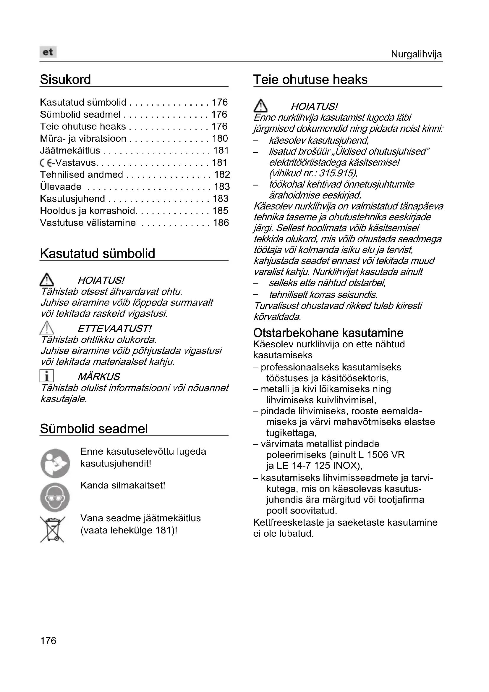 - Vastutuse välistamine Kasutatud sümbolid HOIATUS! Tähistab otsest ähvardavat ohtu. Juhise eiramine võib lõppeda surmavalt või tekitada raskeid vigastusi. ETTEVAATUST! Tähistab ohtlikku olukorda. Juhise eiramine võib põhjustada vigastusi või tekitada materiaalset kahju. MÄRKUS Tähistab olulist informatsiooni või nõuannet kasutajale. Sümbolid seadmel Enne kasutuselevõttu lugeda kasutusjuhendit! Kanda silmakaitset! Vana seadme jäätmekäitlus (vaata lehekülge 181)! Teie ohutuse heaks HOIATUS! Enne nurklihvija kasutamist lugeda läbi järgmised dokumendid ning pidada neist kinni: p. 186