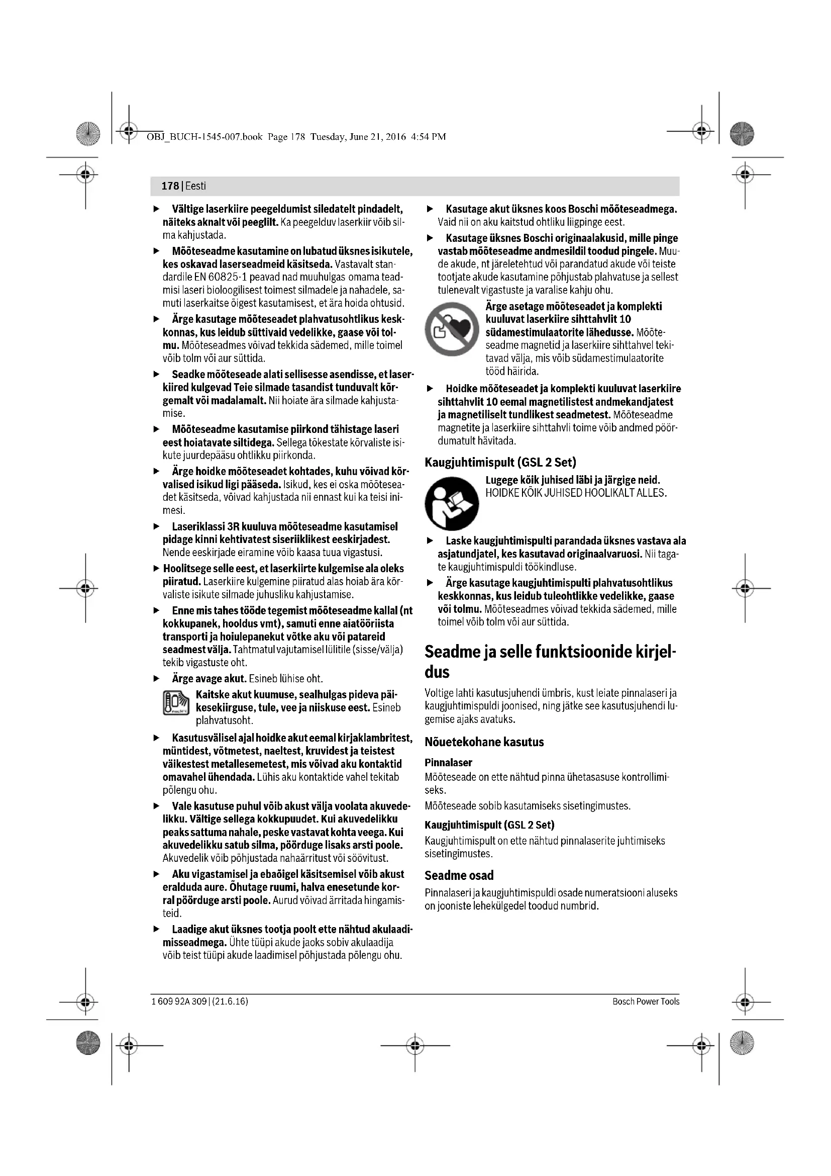 SA KA JUHISED. Ettevaatust – siin nimetatud käsitsus- või justeerimis- seadmetest erinevate seadmete kasutamine või teiste meetodite rakendamine võib põhjustada ohtliku kiirgu- se tekke. Mõõteseade väljastatakse kahe hoiatussildiga (sead- me jooniste leheküljel tähistatud numbritega 2). Kui hoiatussiltide tekst on võõrkeelne, katke need enne seadme esmakordset kasutuselevõttu seadme tarnekomplektis sisalduvate eestikeelsete kleebistega. Ärge juhtige laserkiirt inimeste või loo- made poole ning ärge vaadake otse laser- kiire suunas. Mõõteseade tekitab klassi 3R kuuluva laserkiire vastavalt standardile IEC60825-1. Pilgu suunamine otse laser- kiire sisse – ka suurema vahemaa tagant – võib silmi kahjustada. Kui laserkiir tabab silma, tuleb silmad teadlikult sulge- da ja pea laserkiire tasandilt viivitamatult välja viia. Ärge kasutage laserkiire nähtavust parandavaid prille kaitseprillidena. Prillid muudavad laserkiire paremini nähtavaks, kuid ei kaitse laserkiirguse eest. Ärge kasutage laserkiire nähtavust parandavaid prille päikseprillide ega kaitseprillidena mootorsõidukit juh- tides. Laserkiire nähtavust parandavad prillid ei anna täie- likku kaitset UV-kiirguse eest ja vähendavad värvide erista- mise võimet. Ärge tehke laserseadmes mingeid muudatusi. Laske mõõteseadet parandada üksnes vastava ala asjatundjatel, kes kasutavad originaalvaruosi. Nii taga- te mõõteseadme ohutu töö. OBJ_BUCH-1545-007.book Page 177 Tuesday, June 21, 2016 4:54 PM178 | Eesti 1 609 92A 309 | (21.6.16) Bosch Power Tools Vältige laserkiire peegeldumist siledatelt pindadelt, näiteks aknalt või peeglilt. Ka peegelduv laserkiir võib sil- ma kahjustada. Mõõteseadme kasutamine on lubatud üksnes isikutele, kes oskavad laserseadmeid käsitseda. Vastavalt stan- dardile EN 60825-1 peavad nad muuhulgas omama tead- misi laseri bioloogilisest toimest silmadele ja nahadele, sa- muti laserkaitse õigest kasutamisest, et ära hoida ohtusid. Ärge kasutage mõõteseadet plahvatusohtlikus kesk- konnas, kus leidub süttivaid vedelikke, gaase või tol- mu. Mõõteseadmes võivad tekkida sädemed, mille toimel võib tolm või aur süttida. Seadke mõõteseade alati sellisesse asendisse, et laser- kiired kulgevad Teie silmade tasandist tunduvalt kõr- gemalt või madalamalt. Nii hoiate ära silmade kahjusta- mise. Mõõteseadme kasutamise piirkond tähistage laseri eest hoiatavate siltidega. Sellega tõkestate kõrvaliste isi- kute juurdepääsu ohtlikku piirkonda. Ärge hoidke mõõteseadet kohtades, kuhu võivad kõr- valised isikud ligi pääseda. Isikud, kes ei oska mõõtesea- det käsitseda, võivad kahjustada nii ennast kui ka teisi ini- mesi. Laseriklassi 3R kuuluva mõõteseadme kasutamisel pidage kinni kehtivatest siseriiklikest eeskirjadest. Nende eeskirjade eiramine võib kaasa tuua vigastusi. Hoolitsege selle eest, et laserkiirte kulgemise ala oleks piiratud. Laserkiire kulgemine piiratud alas hoiab ära kõr- valiste isikute silmade juhusliku kahjustamise. Enne mis tahes tööde tegemist mõõteseadme kallal (nt kokkupanek, hooldus vmt), samuti enne aiatööriista transporti ja hoiulepanekut võtke aku või patareid seadmest välja. Tahtmatul vajutamisel lülitile (sisse/välja) tekib vigastuste oht. Ärge avage akut. Esineb lühise oht. Kaitske akut kuumuse, sealhulgas pideva päi- kesekiirguse, tule, vee ja niiskuse eest. Esineb plahvatusoht. Kasutusvälisel ajal hoidke akut eemal kirjaklambritest, müntidest, võtmetest, naeltest, kruvidest ja teistest väikestest metallesemetest, mis võivad aku kontaktid omavahel ühendada. Lühis aku kontaktide vahel tekitab põlengu ohu. Vale kasutuse puhul võib akust välja voolata akuvede- likku. Vältige sellega kokkupuudet. Kui akuvedelikku peaks sattuma nahale, peske vastavat kohta veega. Kui akuvedelikku satub silma, pöörduge lisaks arsti poole. Akuvedelik võib põhjustada nahaärritust või söövitust. Aku vigastamisel ja ebaõigel käsitsemisel võib akust eralduda aure. Õhutage ruumi, halva enesetunde kor- ral pöörduge arsti poole. Aurud võivad ärritada hingamis- teid. Laadige akut üksnes tootja poolt ette nähtud akulaadi- misseadmega. Ühte tüüpi akude jaoks sobiv akulaadija võib teist tüüpi akude laadimisel põhjustada põlengu ohu. Kasutage akut üksnes koos Boschi mõõteseadmega. Vaid nii on aku kaitstud ohtliku liigpinge eest. Kasutage üksnes Boschi originaalakusid, mille pinge vastab mõõteseadme andmesildil toodud pingele. Muu- de akude, nt järeletehtud või parandatud akude või teiste tootjate akude kasutamine põhjustab plahvatuse ja sellest tulenevalt vigastuste ja varalise kahju ohu. Ärge asetage mõõteseadet ja komplekti kuuluvat laserkiire sihttahvlit 10 südamestimulaatorite lähedusse. Mõõte- seadme magnetid ja laserkiire sihttahvel teki- tavad välja, mis võib südamestimulaatorite tööd häirida. Hoidke mõõteseadet ja komplekti kuuluvat laserkiire sihttahvlit 10 eemal magnetilistest andmekandjatest ja magnetiliselt tundlikest seadmetest. Mõõteseadme magnetite ja laserkiire sihttahvli toime võib andmed pöör- dumatult hävitada. Kaugjuhtimispult (GSL 2 Set) Lugege kõik juhised läbi ja järgige neid. HOIDKE KÕIK JUHISED HOOLIKALT ALLES. Laske kaugjuhtimispulti parandada üksnes vastava ala asjatundjatel, kes kasutavad originaalvaruosi. Nii taga- te kaugjuhtimispuldi töökindluse. Ärge kasutage kaugjuhtimispulti plahvatusohtlikus keskkonnas, kus leidub tuleohtlikke vedelikke, gaase või tolmu. Mõõteseadmes võivad tekkida sädemed, mille toimel võib tolm või aur süttida. Seadme ja selle funktsioonide kirjel- dus Voltige lahti kasutusjuhendi ümbris, kust leiate pinnalaseri ja kaugjuhtimispuldi joonised, ning jätke see kasutusjuhendi lu- gemise ajaks avatuks. Nõuetekohane kasutus Pinnalaser Mõõteseade on ette nähtud pinna ühetasasuse kontrollimi- seks. Mõõteseade sobib kasutamiseks sisetingimustes. Kaugjuhtimispult (GSL 2 Set) Kaugjuhtimispult on ette näht