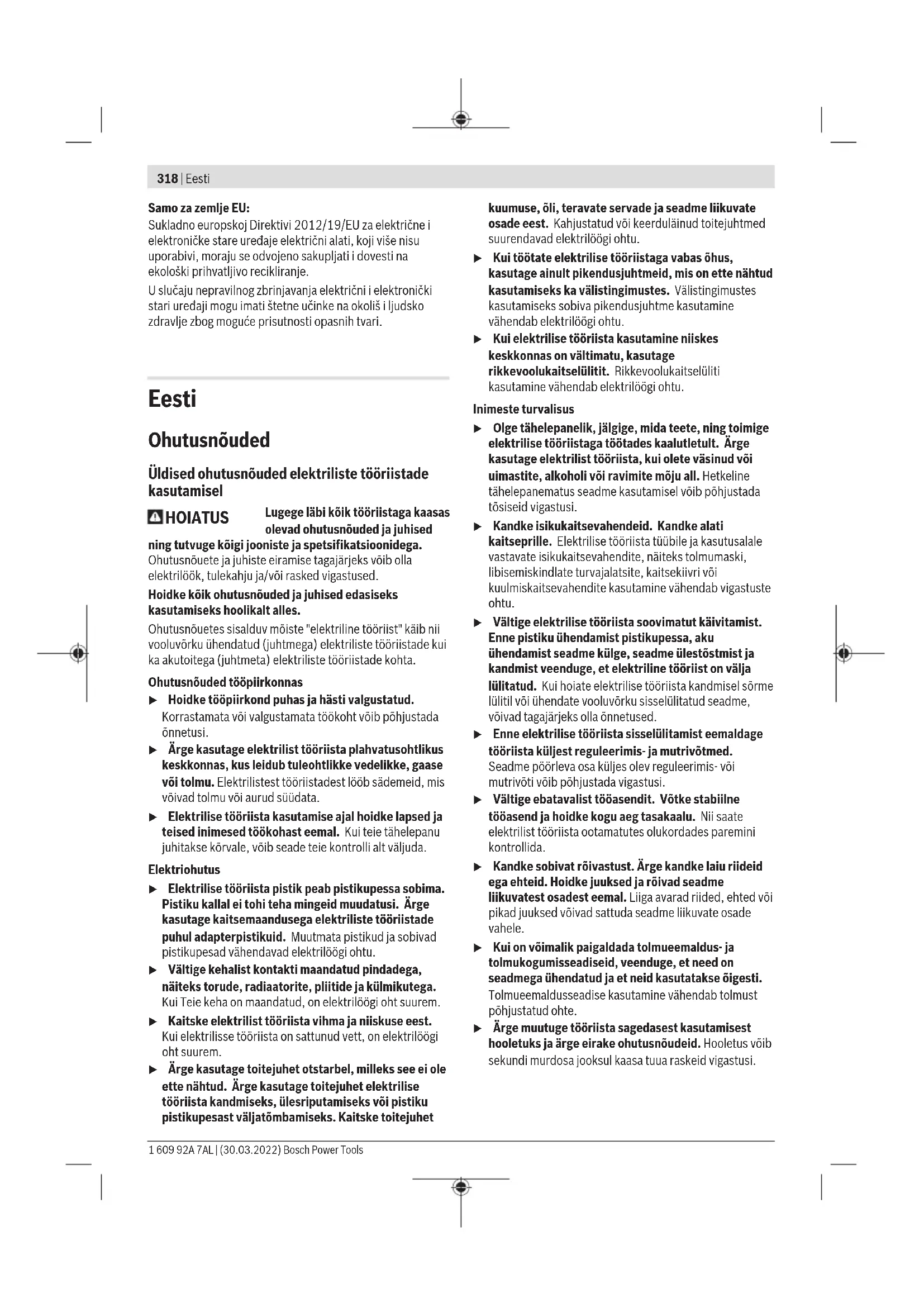 Toodud pöörlemiskiirusastmete väärtused on ligikaudsed. Paigaldus Kaitseseadise paigaldamine u Enne mistahes tööde teostamist elektrilise tööriista kallal tõmmake pistik pistikupesast välja. Märkus: Juhul kui lihvketas töötamise ajal murdub või kui kettakaitse/elektrilise tööriista kinnitusseadised saavad kahjustada, tuleb elektriline tööriist toimetada viivitamatult hoolduskeskusse; aadressid on toodud jaotises “Klienditeenindus ja kasutusalane nõustamine". Kaitsekate lihvimiseks Asetage kaitsekate (8) elektrilisel tööriistal olevale hoidikule, nii et kaitsekatte kodeerimisnagad kattuvad hoidikuga. Vajutage sealjuures ja hoidke vajutatult lukustuse vabastamishooba (1). Vajutage kaitsekate (8) spindlikaelale, kuni kaitsekatte ühenduskoht toetub elektrilise tööriista äärikule ja pöörake kaitsekatet, nii et see selgelt kuuldavalt fikseerub. Sobitage kaitsekate (8) tööoperatsiooni nõuetega. Suruge selleks lukustuse vabastamishoob (1) üles ja pöörake kaitsekate (8) soovitud asendisse. u Seadke kaitsekate(8) alati nii, et lukustuse vabastamishoova(1) mõlemad nagad oleksid kaitsekatte(8) vastavates väljalõigetes. u Reguleerige kaitsekate (8) välja nii, et sädemeid ei lendu kasutaja suunas. u Kaitsekatet (8) tohib olla võimalik pöörata ainult allavajutatud lukustuse vabastamishoova(1) korral! Vastasel korral ei tohi elektrilist tööriista mitte mingil juhul edasi kasutada ja see tuleb üle anda klienditeenindusele. Suunis: Kodeerimisnagad kaitsekattel (8) tagavad, et elektrilisele tööriistale saab paigaldada ainult sobiva kaitsekatte. Imikate lihvimiseks Värvide, lakkide ja plastide lihvimiseks kõvasulam- kausskettaga (11) võite kasutada tomueemalduskatet (7). Tolmueemalduskate (7) ei sobi metallide töötlemiseks. Tolmueemalduskattega (7) saab ühendada sobiva Boschi tolmuimeja. Asetage selleks tolmueemaldusadapteriga imivoolik tolmueemalduskatte sellekohasesse ühendusotsakusse. Kaitsekate lõikamiseks u Kasutage lõikamiseks alati lõikamise kaitsekatet (9) või lihvimise kaitsekatet (8) koos lõikamiskattega(27). u Kivi lõikamisel tuleb tagada piisavalt tõhus tolmuimemine. Lõikamise kaitsekate(9) paigaldatakse samamoodi kui lihvimise kaitsekate (8). Metallist lõikamiskate Paigaldage metallist lõikamiskate (27) lihvimise kaitsekattele (8) (vaata joonist A): pöörake hoidelook tagasi (➊). Asetage kate (27) lihvimise kaitsekattele (8) (➋). Suruge hoidelook tugevalt vastu kaitsekatet (8) (➌). Eemaldamiseks (vaata joonist B) suruge hoideloogal olevat nuppu (➊) ja pöörake hoidelook tagasi(➋). Tõmmake kate (27) kaitsekattelt (8) maha (➌). Plastist lõikamiskate Asetage plastist lõikamiskate(27) lihvimise kaitsekattele(8) (vaata joonistC). Kate(27) fikseerub kuuldavalt ja nähtavalt kaitsekattele(8). Eemaldamiseks (vaata joonistD) vabastage kate(27) lukustusest kaitsekattel(8) (➊) vaskult või paremalt poolt ja tõmmake kate maha (➋). 1 609 92A 7AL | (30.03.2022) Bosch Power ToolsEesti | 325 Juhtkelguga kaitsekate lõikamiseks Juhtkelguga lõikamise tolmueemalduskate(19) paigaldatakse samamoodi kui lihvimise kaitsekate. Lisakäepideme (6)/(32) kinnitamisega läbi tolmueemalduskatte ajami korpusele ühendatakse elektriline tööriist kindlalt tolmueemalduskattega. Juhtkelguga tolmueemaldamiskattega (19) saab ühendada sobiva Boschi tolmuimeja. Asetage selleks tolmueemaldusadapteriga imivoolik tolmueemalduskatte sellekohasesse ühendusotsakusse. Suunis: Tolmu poolt tolmu imemise ajal tekitatav hõõrdumine imivoolikus ja lisavarustuses põhjustab elektrostaatilise laengu, mille lahendumist võib kasutaja (olenevalt keskkonnateguritest ja oma füsioloogilisest seisundist) tunda.Bosch soovitab üldiselt kasutada kuivade materjalide peentolmu imemiseks antistaatilist imivoolikut (lisavarustus). Käekaitse u Paigaldage kummist lihvtaldrikuga(22) või kaussharja/koonusharja/teemant-puurkrooniga töötamisel alati käekaitse(21). Kinnitage käekaitse (21) lisakäepidemega (6)/(32). Standardne lisakäepide / vibratsiooni summutav lisakäepide Kruvige lisakäepide (6)/(32) olenevalt tööviisist paremalt või vasakult poolt ajamipeale. u Kasutage oma elektrilist tööriista ainult lisakäepidemega (6)/(32). u Lõpetage elektrilise tööriista kasutamine, kui lisakäepide (6)/(32) on vigastatud. Ärge tehke lisakäepidemel (6)/(32) mitte mingeid muudatusi. Vibratsiooni summutav lisakäepide (32) võimaldab vähese vibratsiooniga ja seega mugavat ning turvalist töötamist. Lihvimistarvikute paigaldamine u Enne mistahes tööde teostamist elektrilise tööriista kallal tõmmake pistik pistikupesast välja. u Ärge puudutage lihv- ja lõikekettaid enne, kui need on jahtunud. Kettad lähevad töötamisel väga kuumaks. Puhastage lihvimisspindel (18) ja kõik paigaldatavad osad. Tarviku kinnitamiseks ja vabastamiseks vajutage spindli lukustamise nupule (2), et lihvimisspindlit lukustada. u Spindli lukustamise nupule vajutage üksnes siis, kui spindel seisab. Vastasel korral võib tööriist kahjustada saada. Lihv- /lõikeketas Pöörake tähelepanu lihvimistööriistade mõõtmetele. Augu läbimõõt peab tugiäärikuga sobima. Ärge kasutage adaptereid ega vähendusdetaile. Teemantlõikeketaste kasutamise korral veenduge, et kettal olev pöörlemissuuna nool ja elektrilise tööriista pöörlemissuund (vt korpusel olevat pöörlemissuuna noolt) kattuvad. Paigalduse järjekord on näidatud jooniste lehel. Suunis: ühendatud lihv- ja lõikeketaste paigaldamisel kaasasoleva tugiäärikuga (10) ja kinnitusmutri (15) või kiirkinnitusmutriga(16) ei ole vahekihtide paigaldamine vajalik. Lihv-/lõikeketta kinnitamiseks asetage O-rõngastihendiga tugiäärik (10) lihvspindlile (18) ja keerake kinnitusmutter (15) peale. Jälgige kinnitusmutri (15) suunda olenevalt kasutatud lihv-/lõikekettast (vaata jooniseid kasutusjuhendi eelnevas osas) ja pingutage see kaheavavõtmega (vaadake „ Kiirkinnitusmutter “, Lehekülg325). u Pärast lihvimistarvi